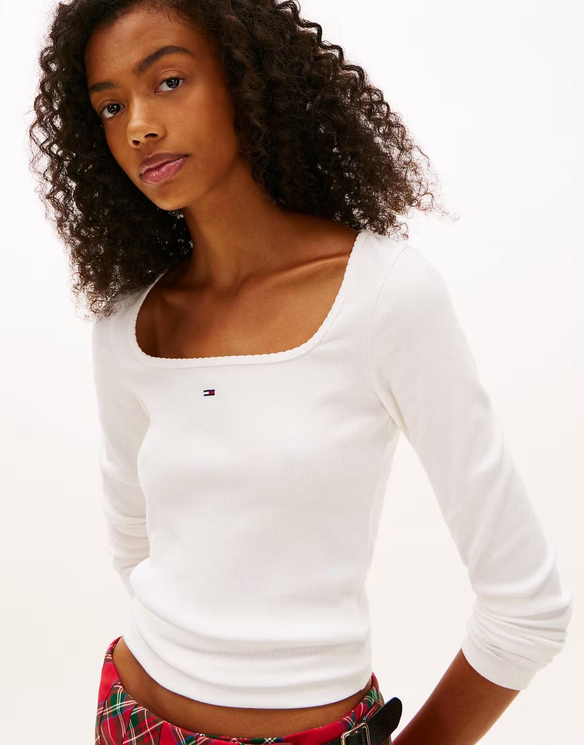 Tommy Jeans Square neck slim long sleeve t-shirt in white