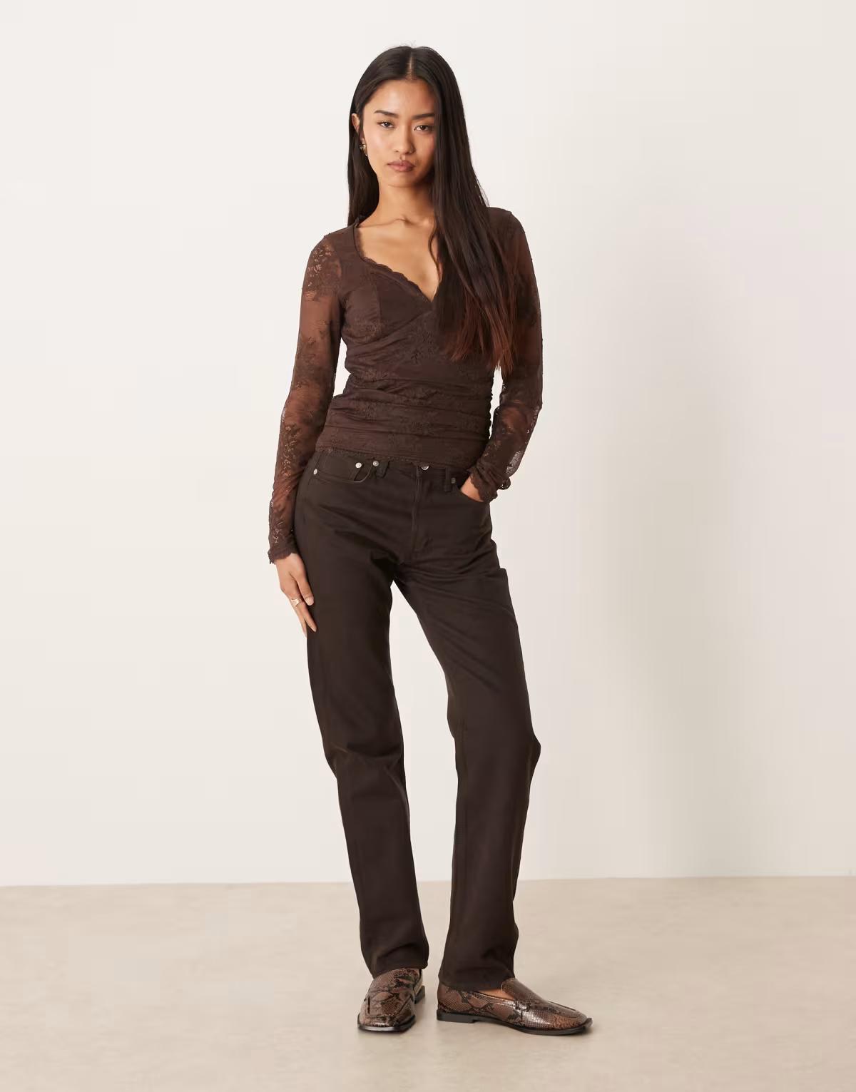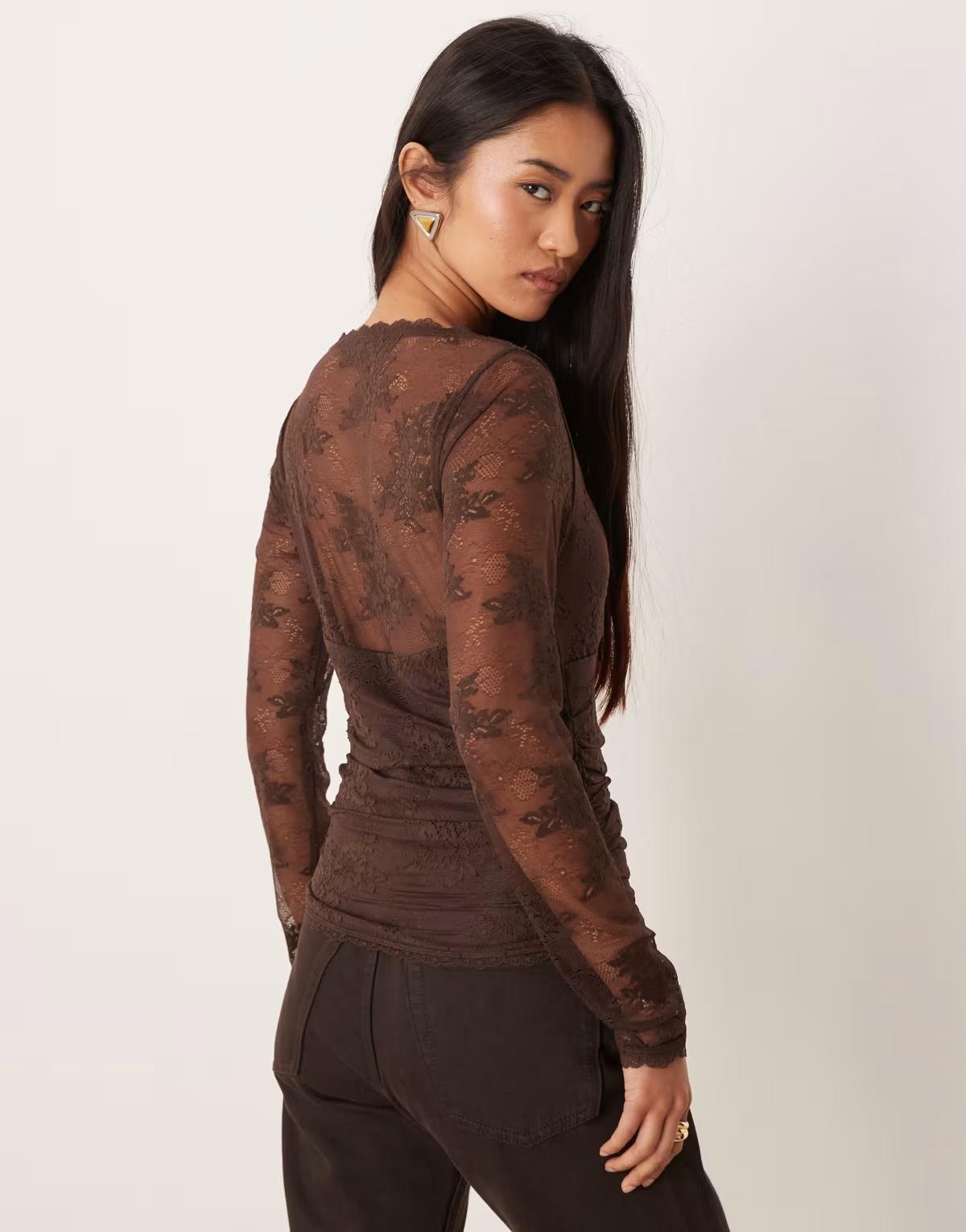Abercrombie & Fitch sweetheart neckline lace long sleeve top in brown