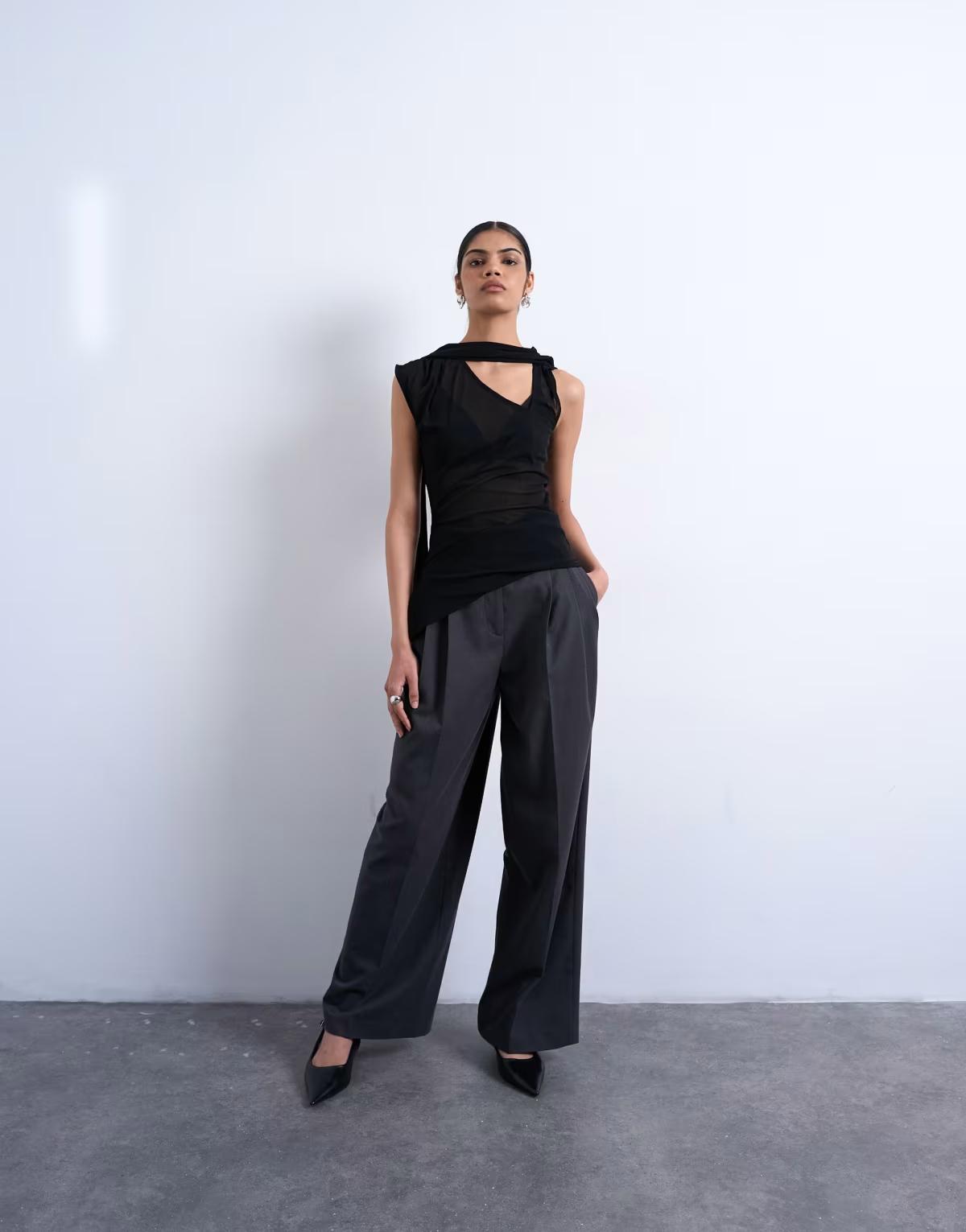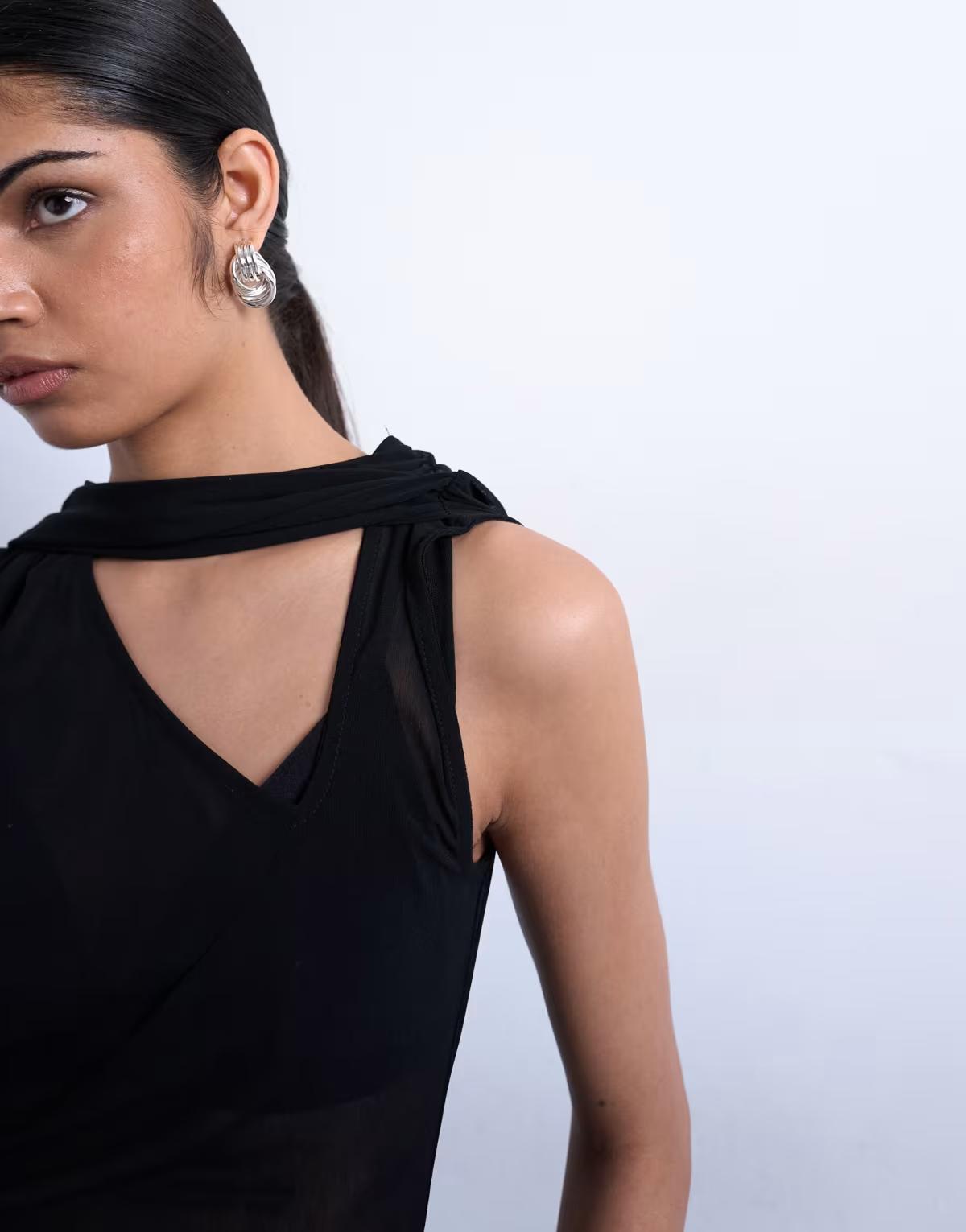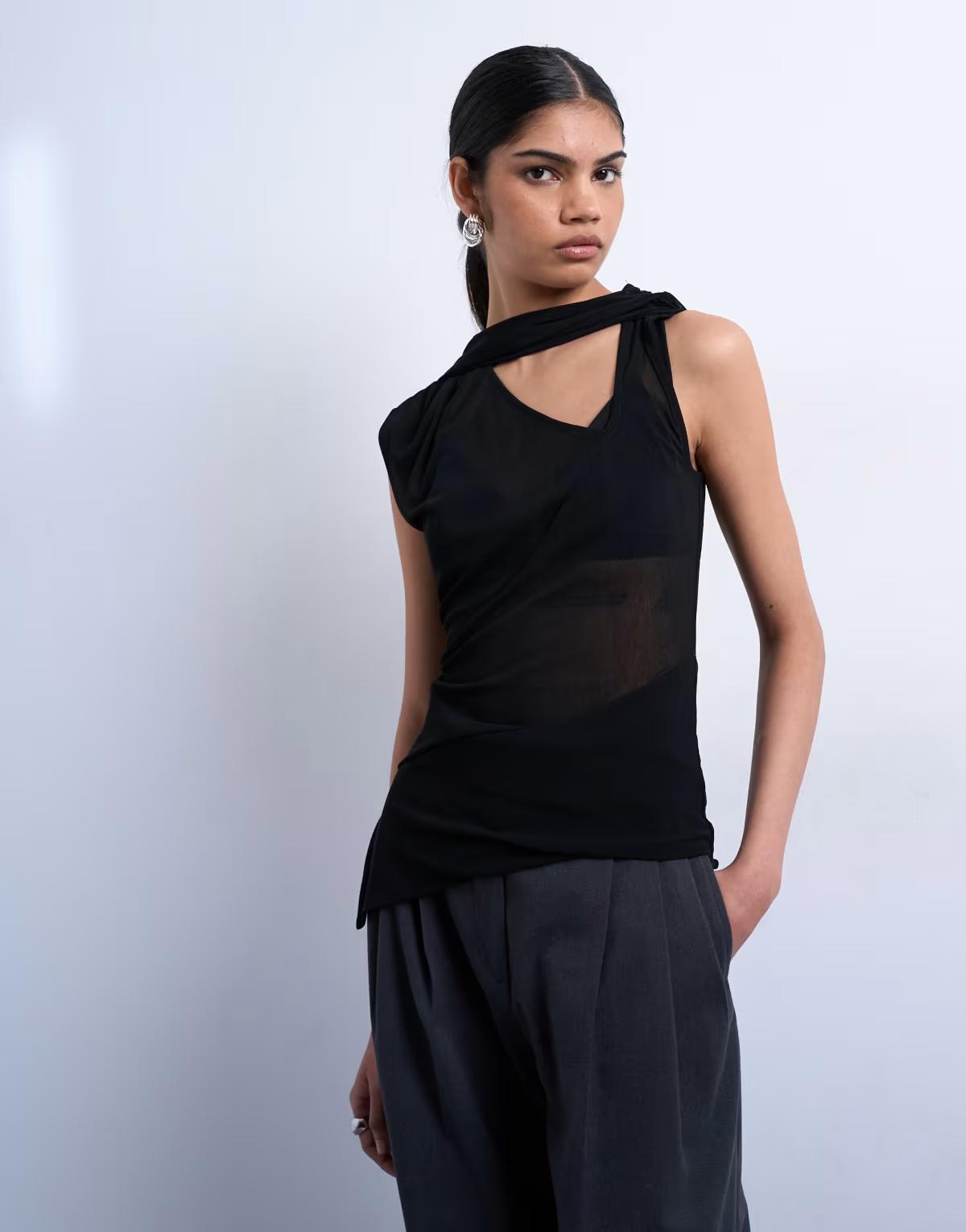 This top is crafted from a sheer, mesh fabric. It features a high neck with scarf detailing and is cut with a slim fit.