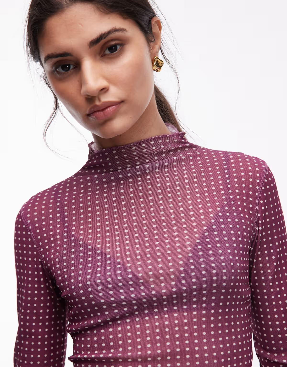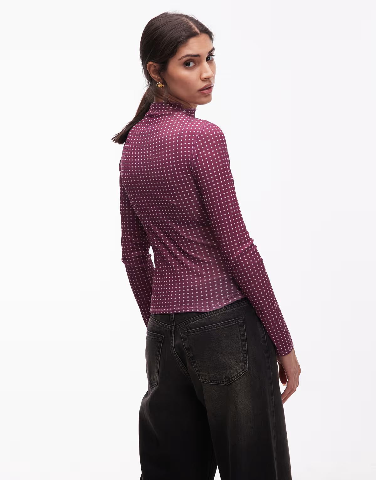 ASOS DESIGN sheer grown on neck long sleeve in mulberry polka dot