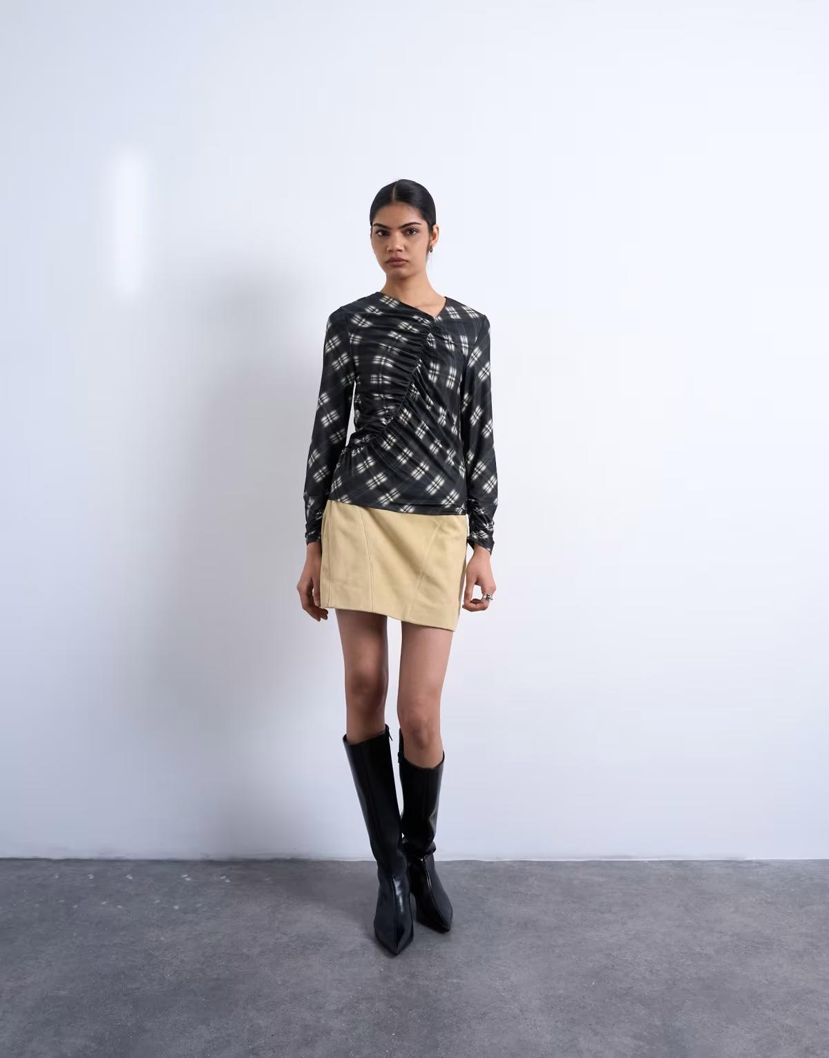 This top features an abstract check and an asymmetric ruching through its centre. It has a crew neck, long sleeves and a slim fit.