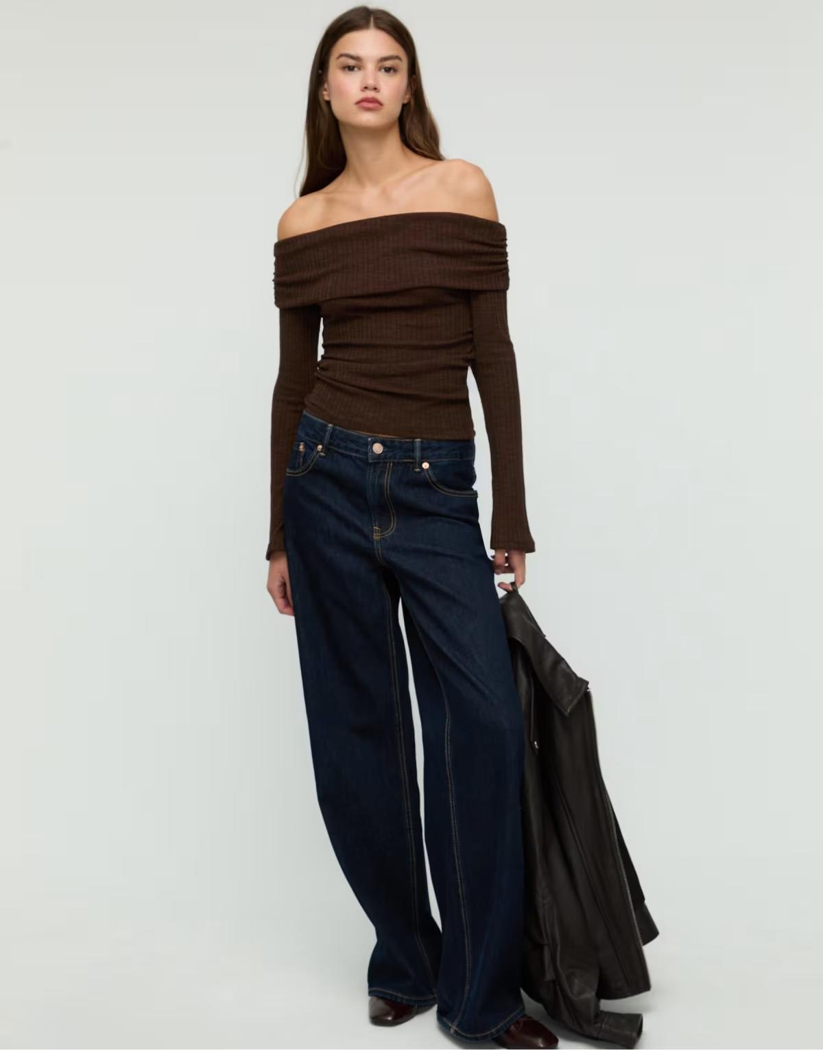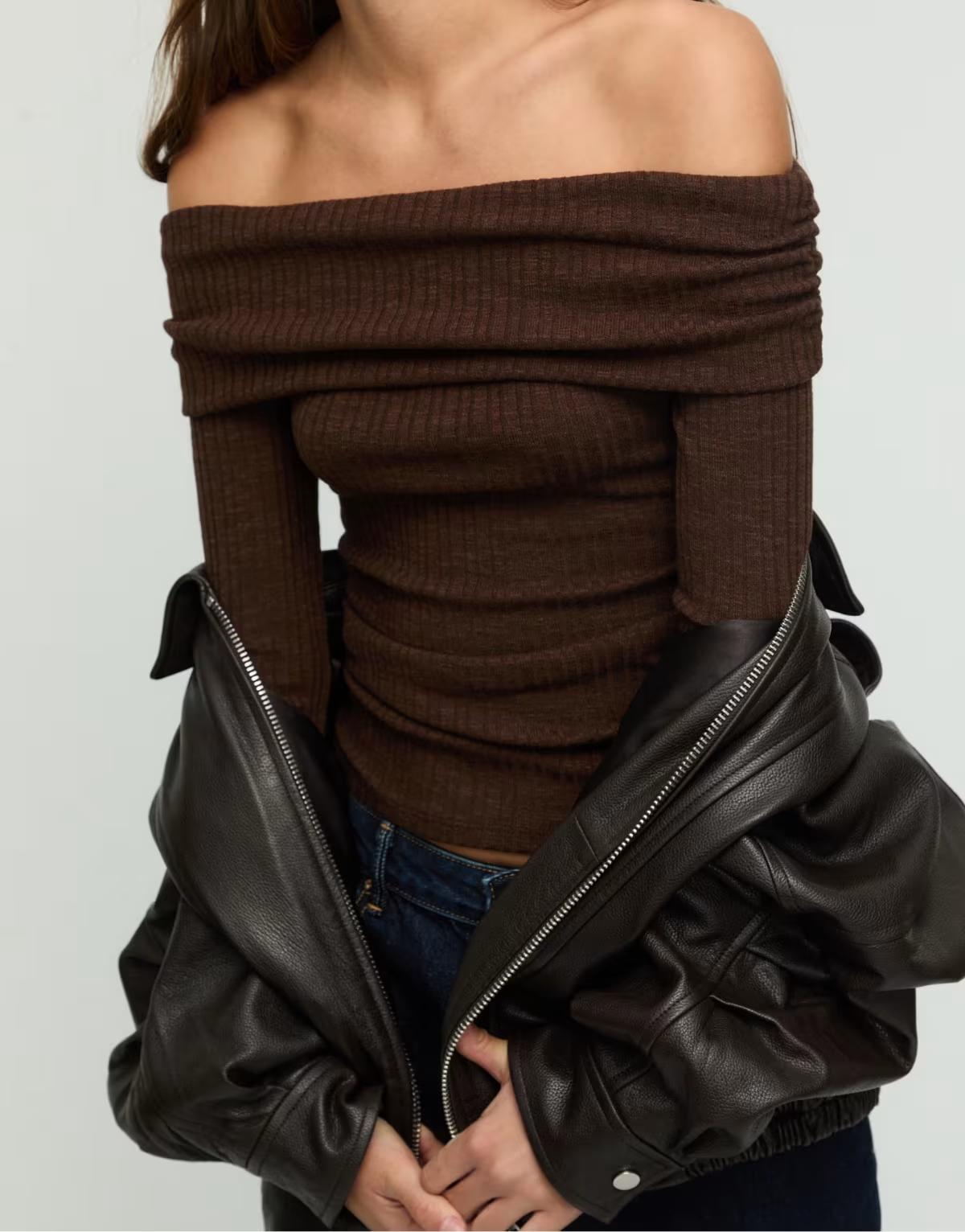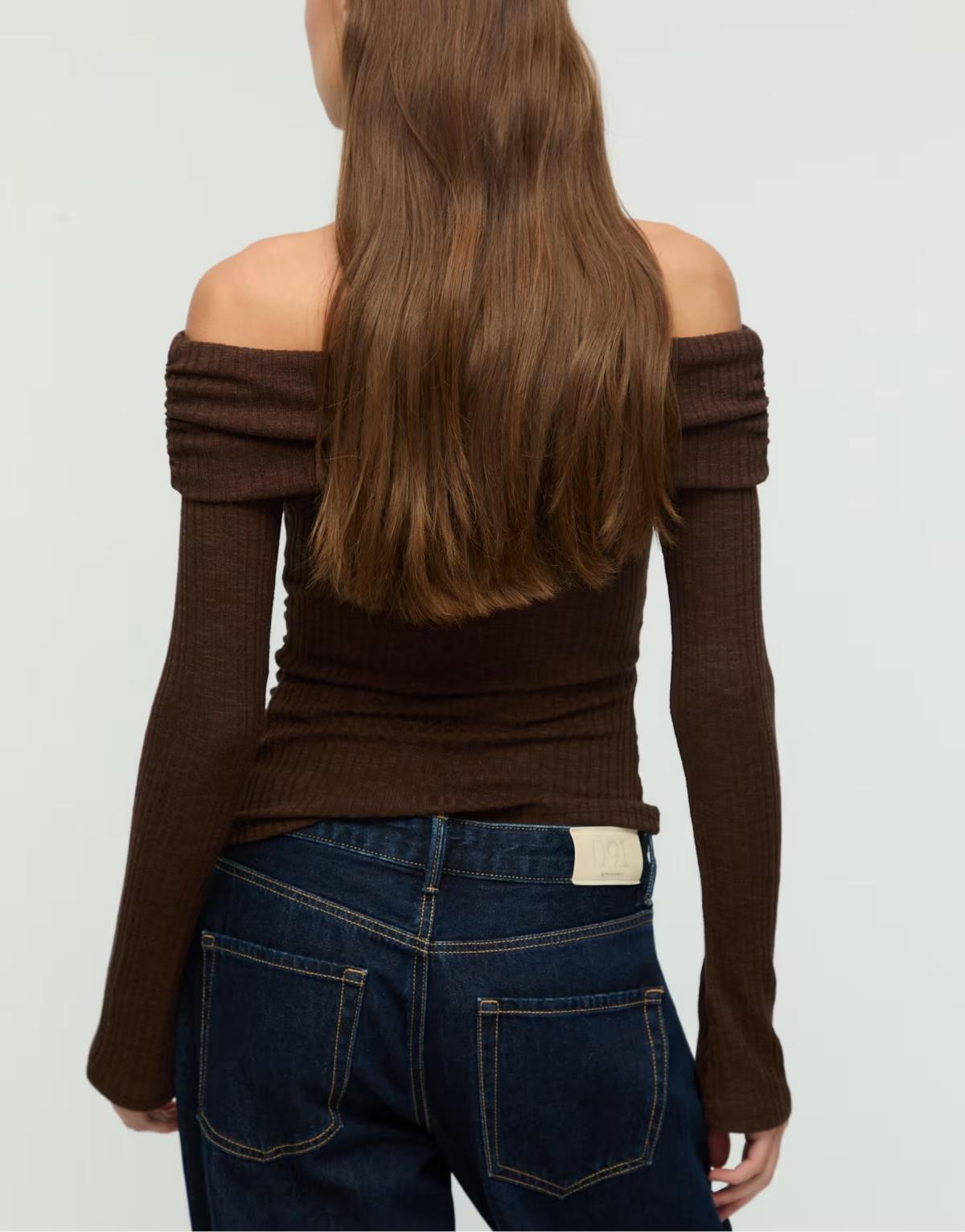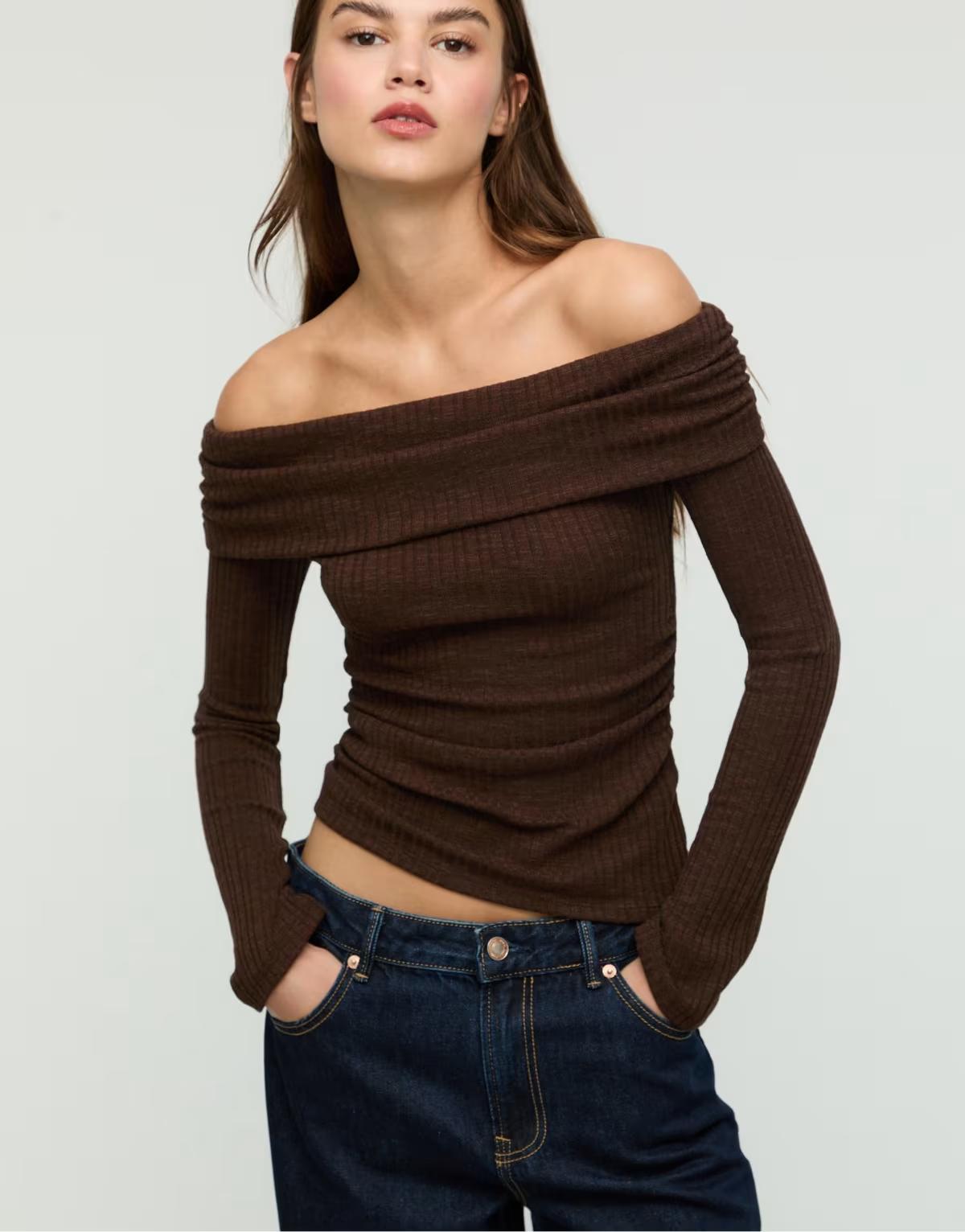 Stradivarius Off-the-shoulder gathered knit top in brown