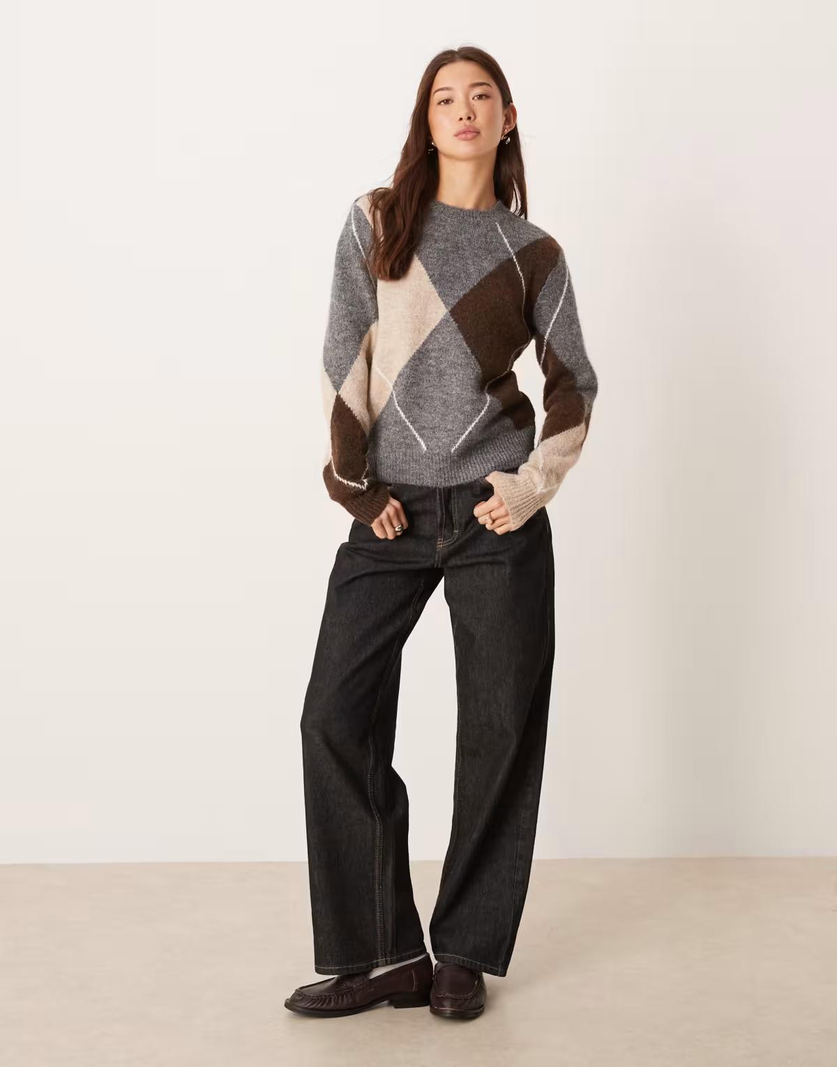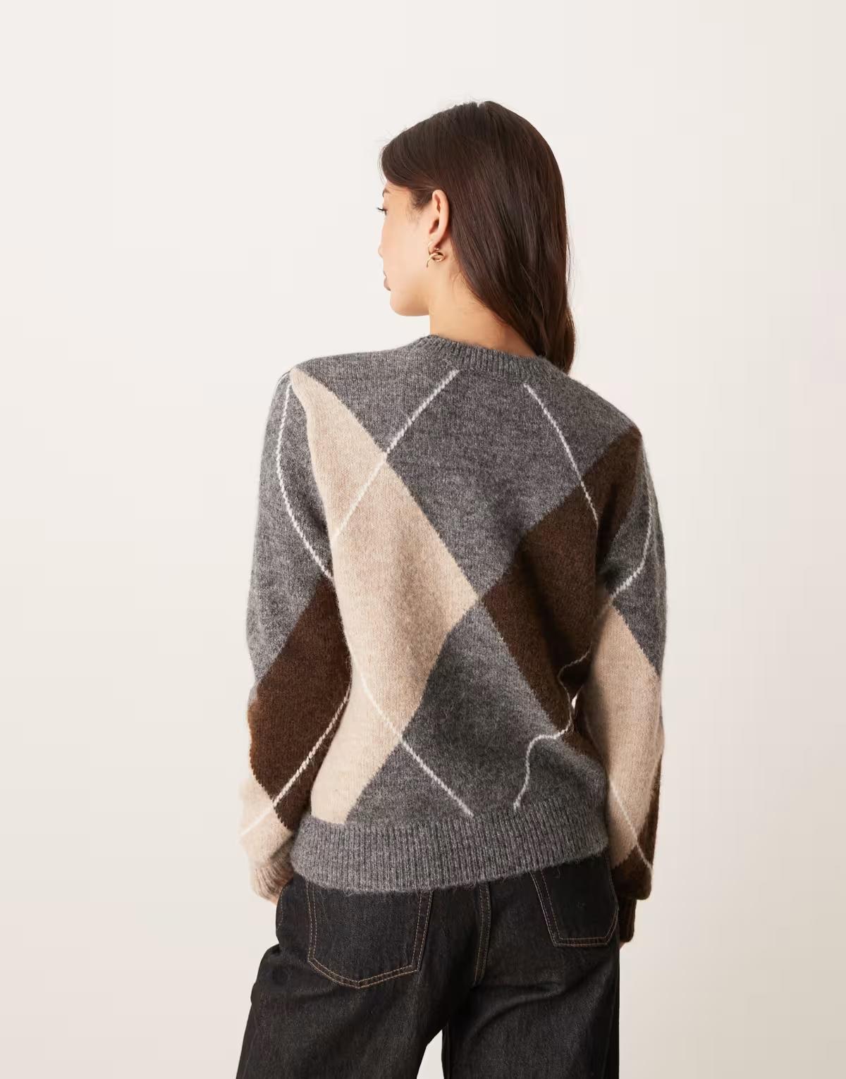 AWARE oversized hairy textured argyle print knitted jumper in grey and brown