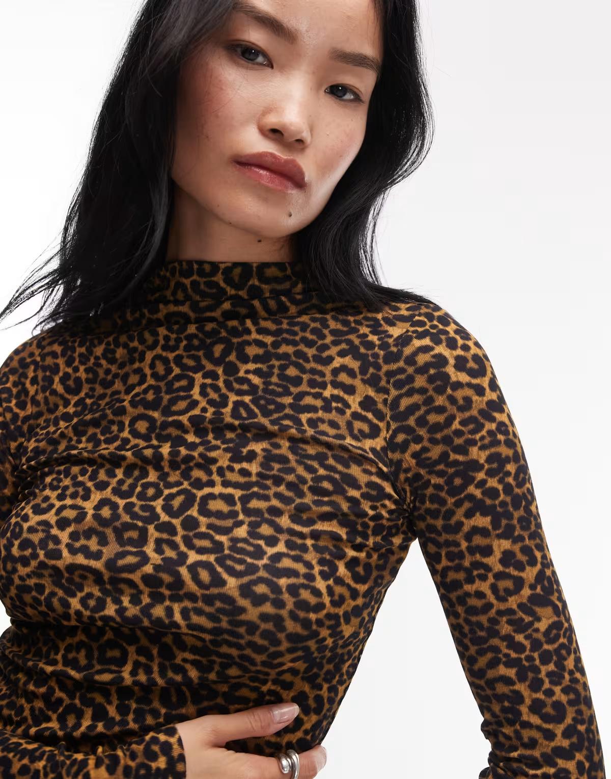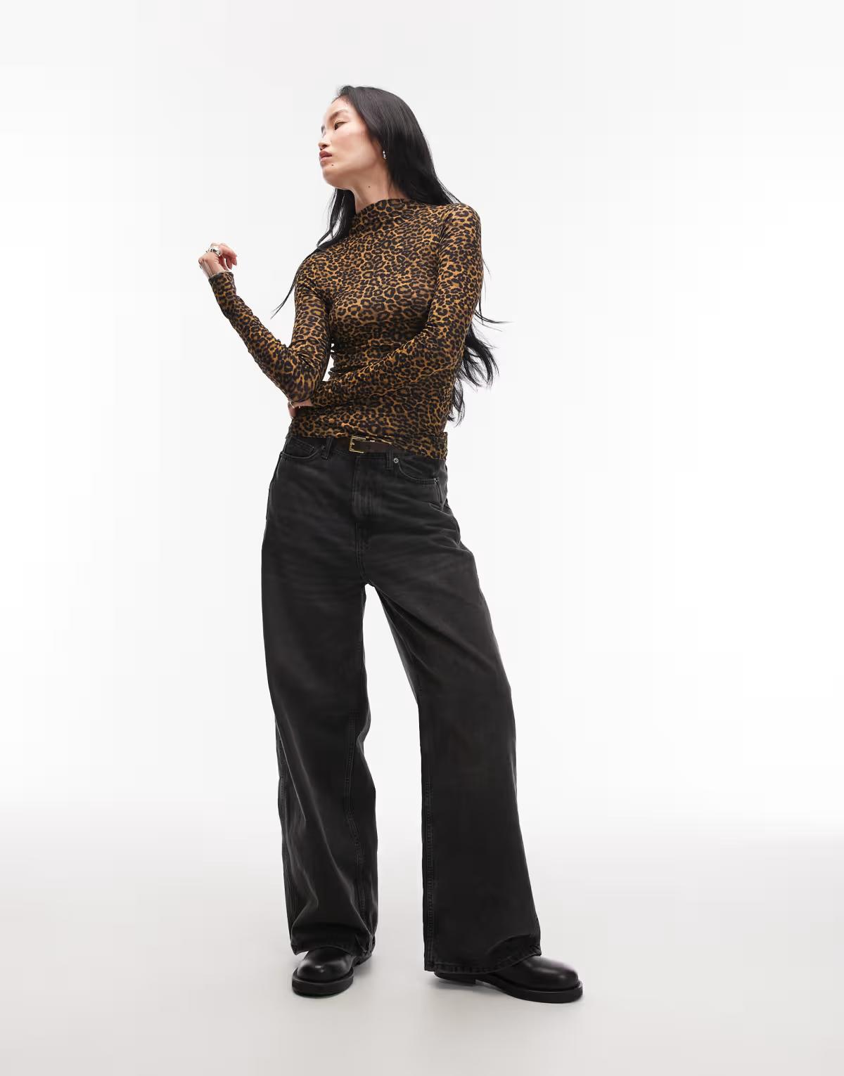 ARKET merino wool knitted semi sheer wide rib mock neck top in leo print