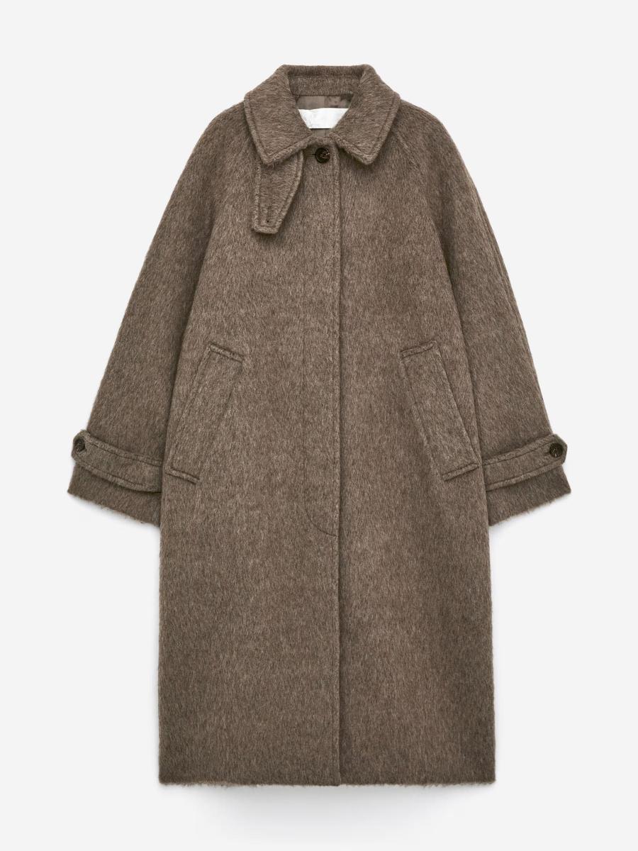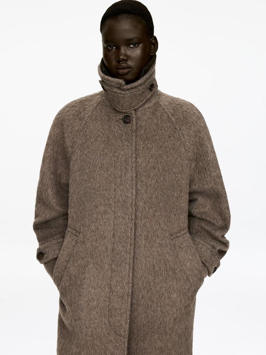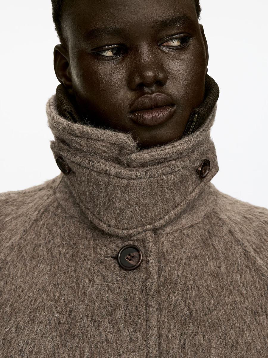 Single-breasted coat in a brushed wool and alpaca blend. Designed with raglan sleeves, collar featuring a detachable storm flap, and concealed button fastening. Welt pockets at sides and buttoned tab at cuffs. Fully lined. This style contains 12% RAS Alpaca and 50% RWS wool (TE-00047206). Products certified to the Responsible Wool Standard (RWS) and the Responsible Alpaca Standard (RAS) contain wool and alpaca fiber from farms independently certified to animal welfare and land management requirements.ARKET/Women's clothes/Women's coats and jackets/Women's coats