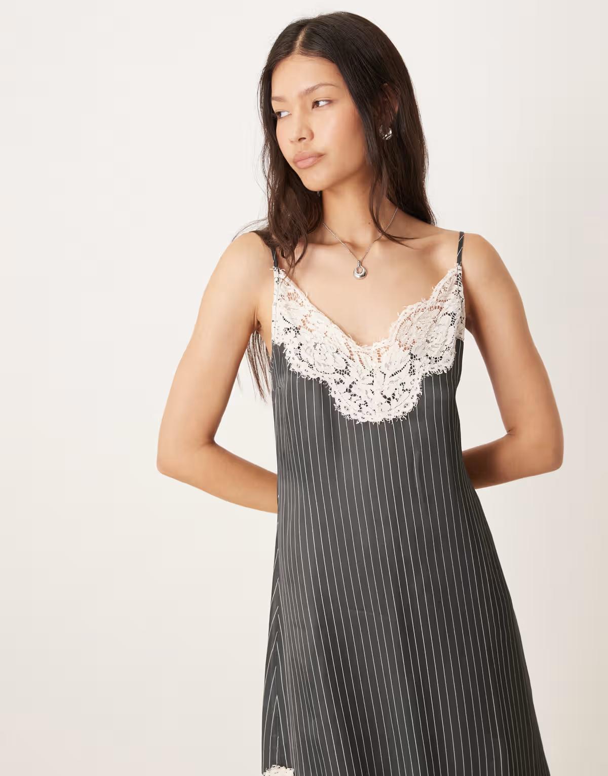 ASOS DESIGN lace bodice cami asymmetric satin mini dress in grey pinstripe