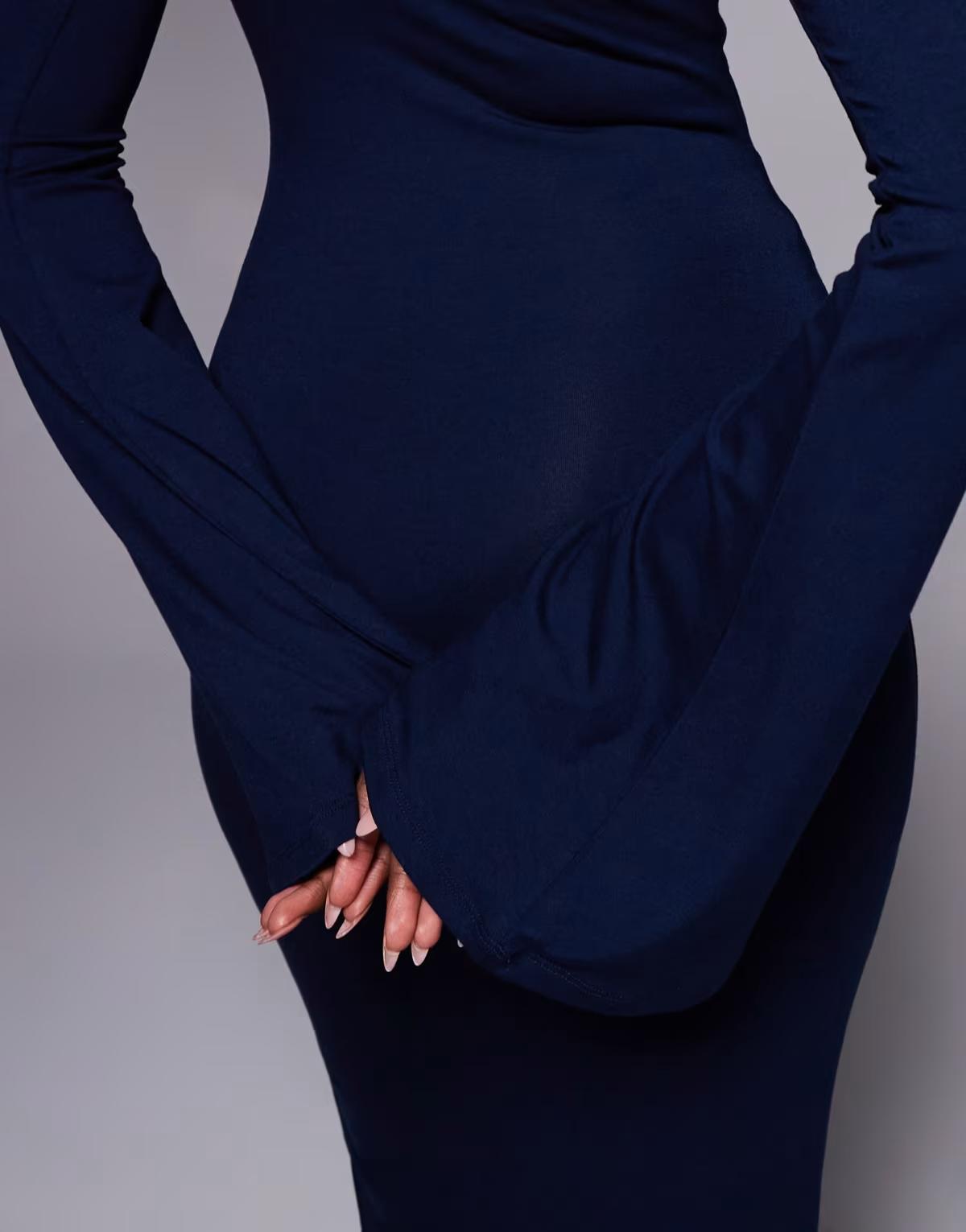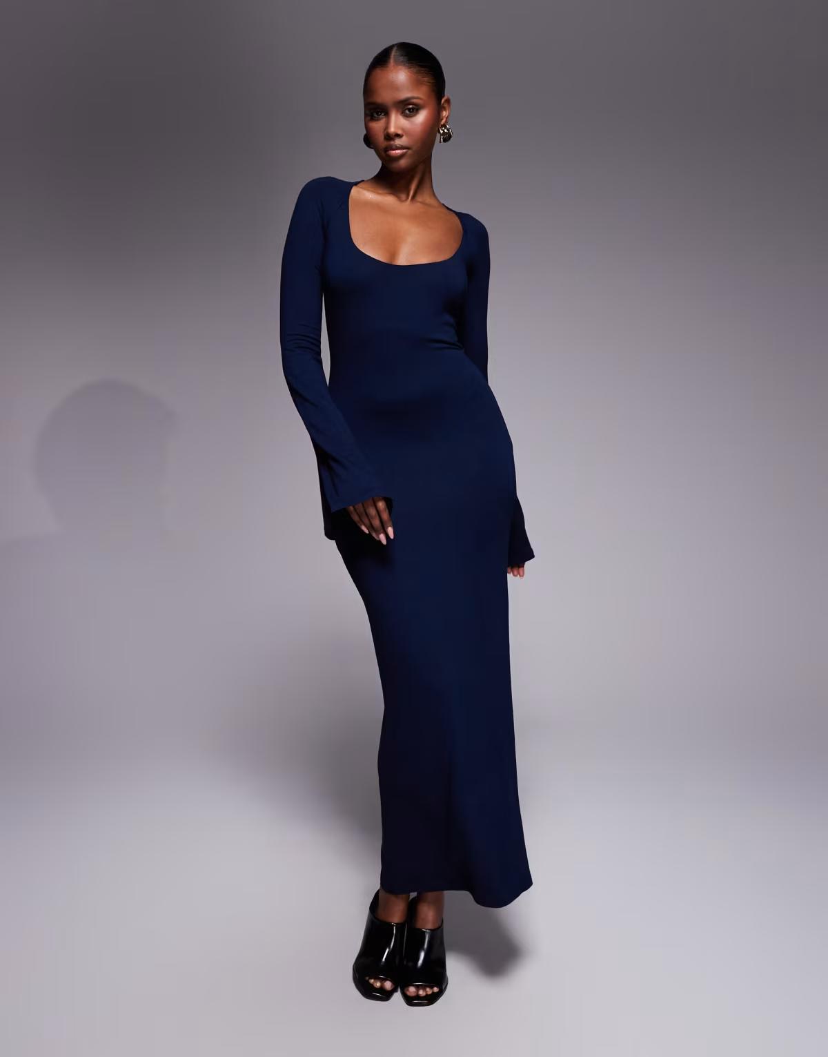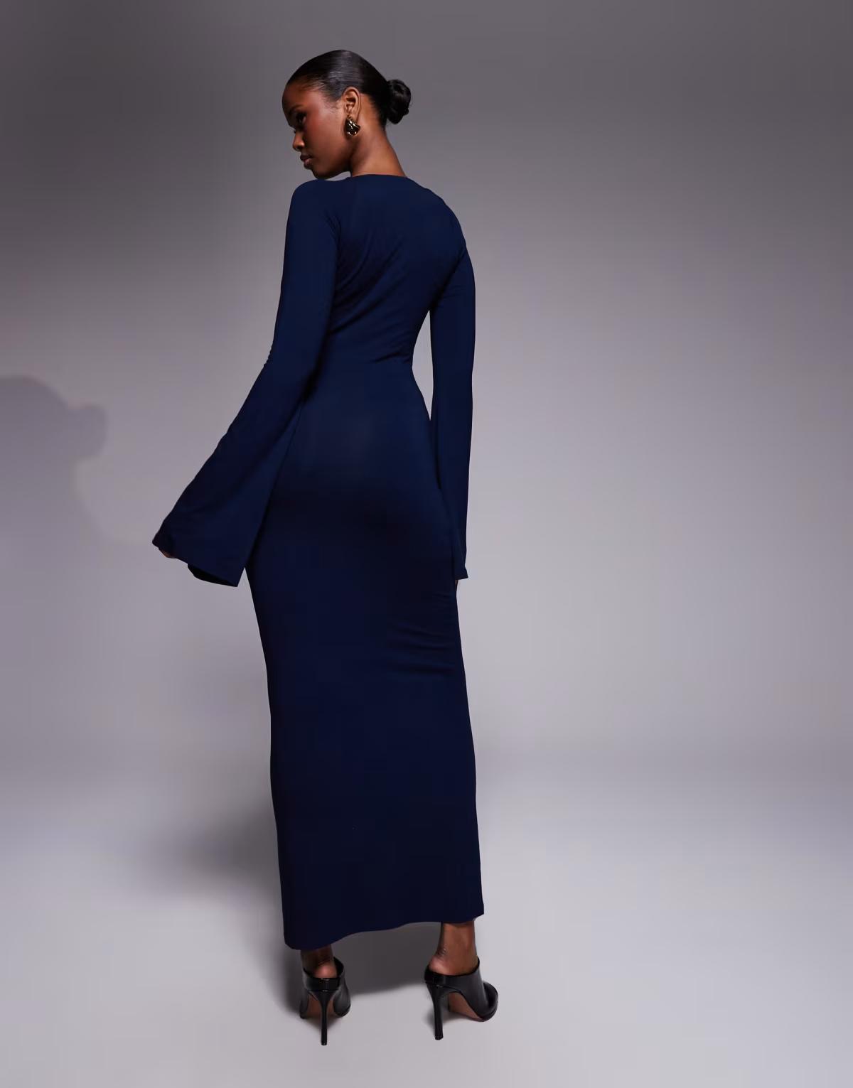 ASOS DESIGN long flute sleeves super scoop midi dress in navy