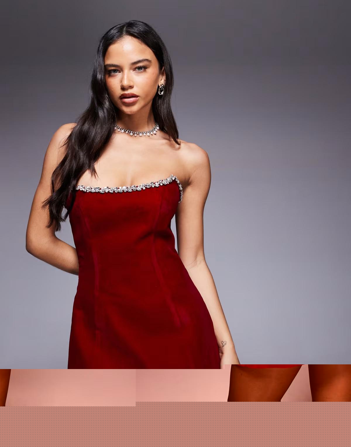 Murci structured bandeau velvet diamante trim lace up back detail mini dress in red
