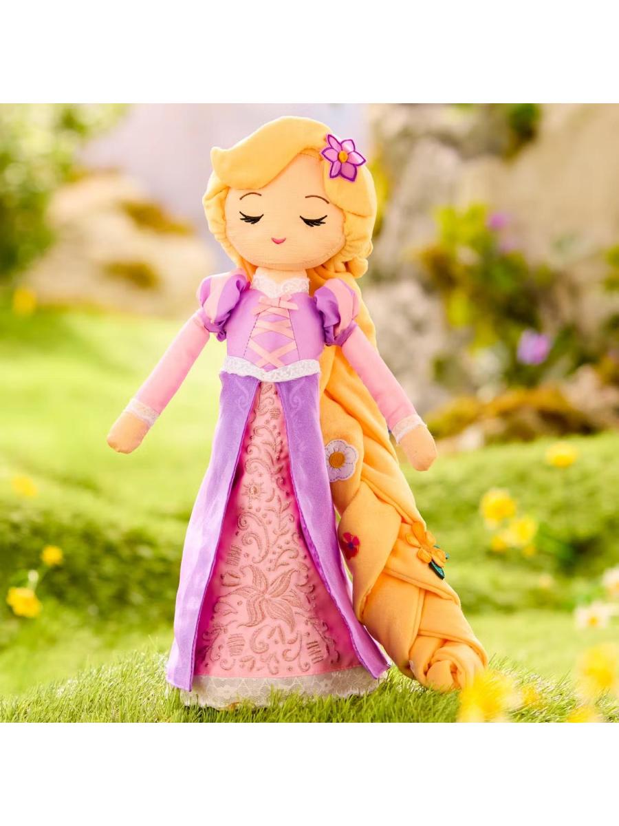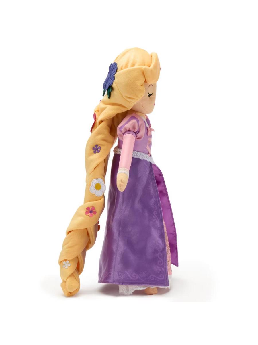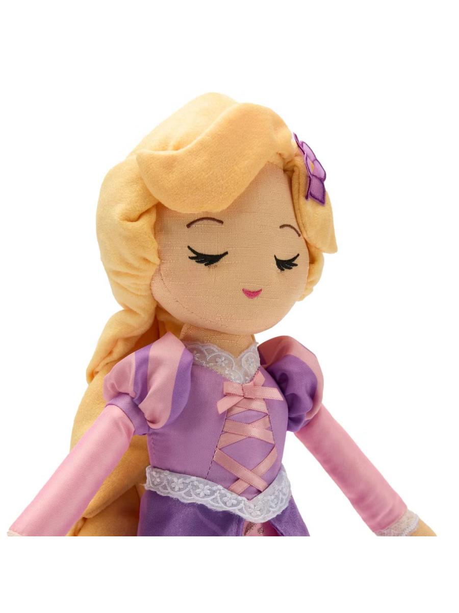 See the light of this very special Tangled 15th Anniversary soft toy doll. Soft doll Rapunzel dreams of towering adventures. Fully costumed in intricate detail, her long, braided hair shimmers with golden metallic flecks and floral appliques. Rapunzel's signature dress is accented by golden embroidery, sheer organza peplum with satin lining, puff sleeves, satin ribbon lacing and fine lace trims. She's sure to tangle with your affections!