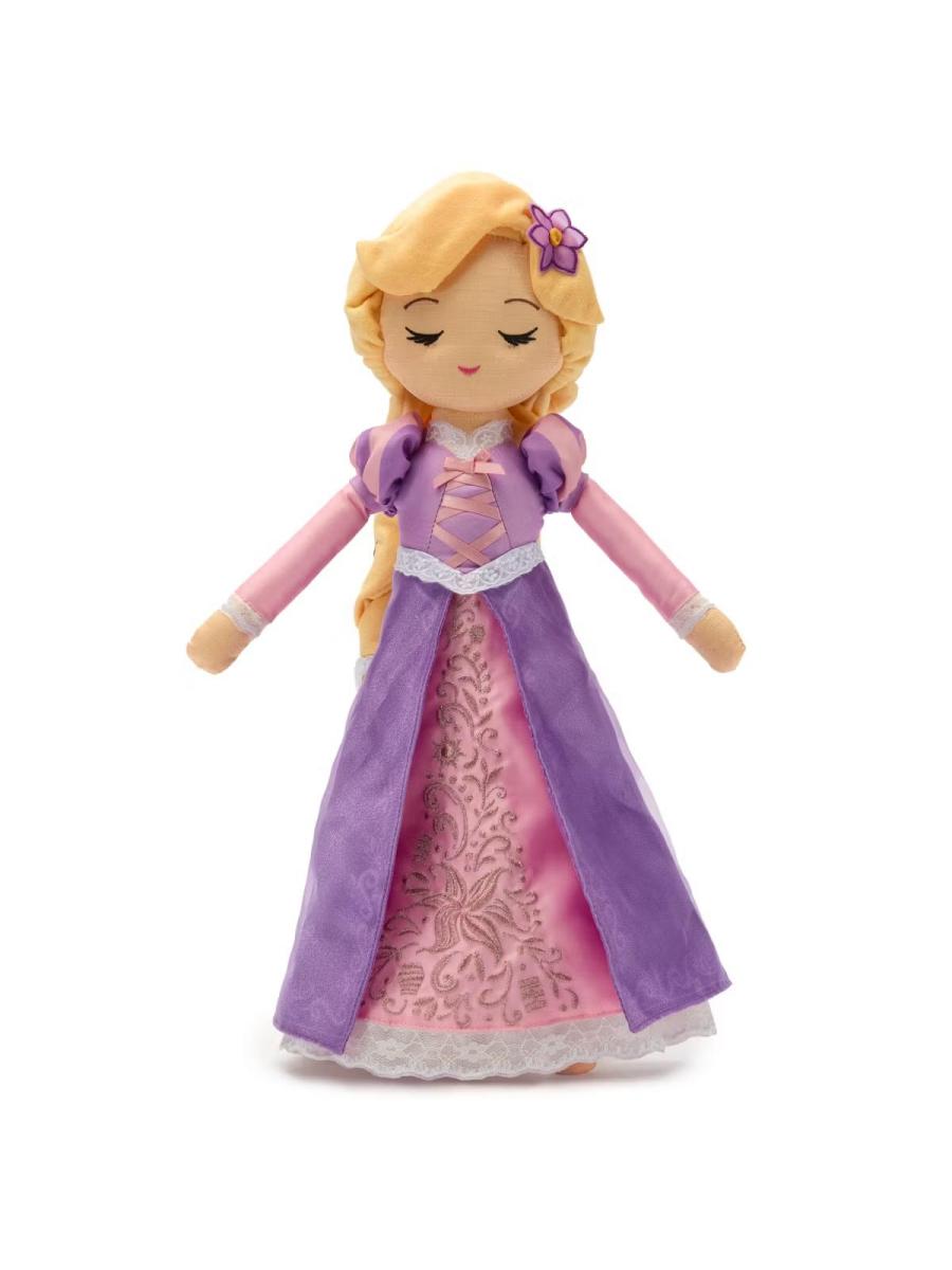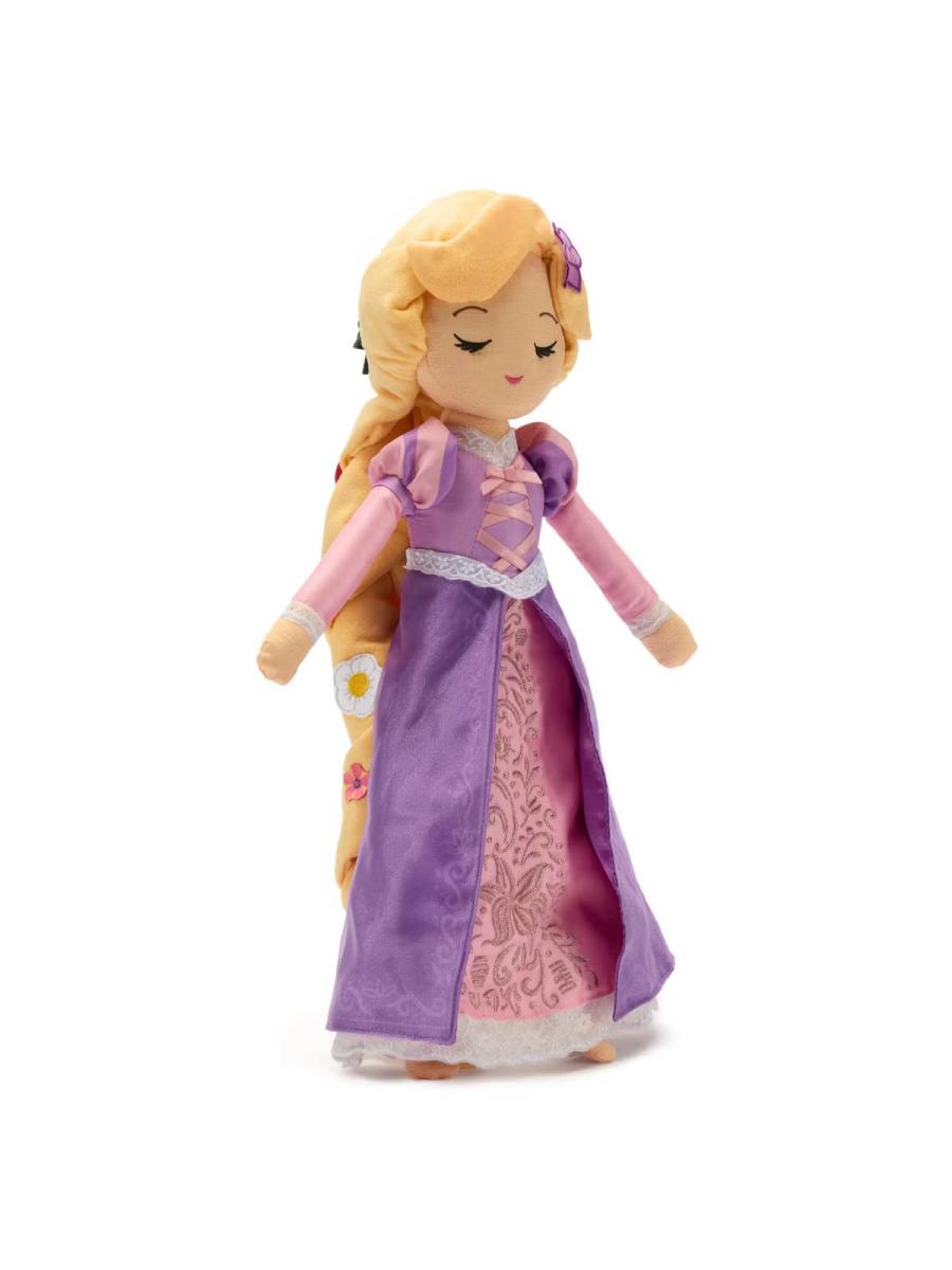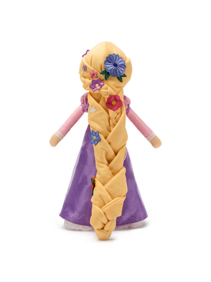 See the light of this very special Tangled 15th Anniversary soft toy doll. Soft doll Rapunzel dreams of towering adventures. Fully costumed in intricate detail, her long, braided hair shimmers with golden metallic flecks and floral appliques. Rapunzel's signature dress is accented by golden embroidery, sheer organza peplum with satin lining, puff sleeves, satin ribbon lacing and fine lace trims. She's sure to tangle with your affections!