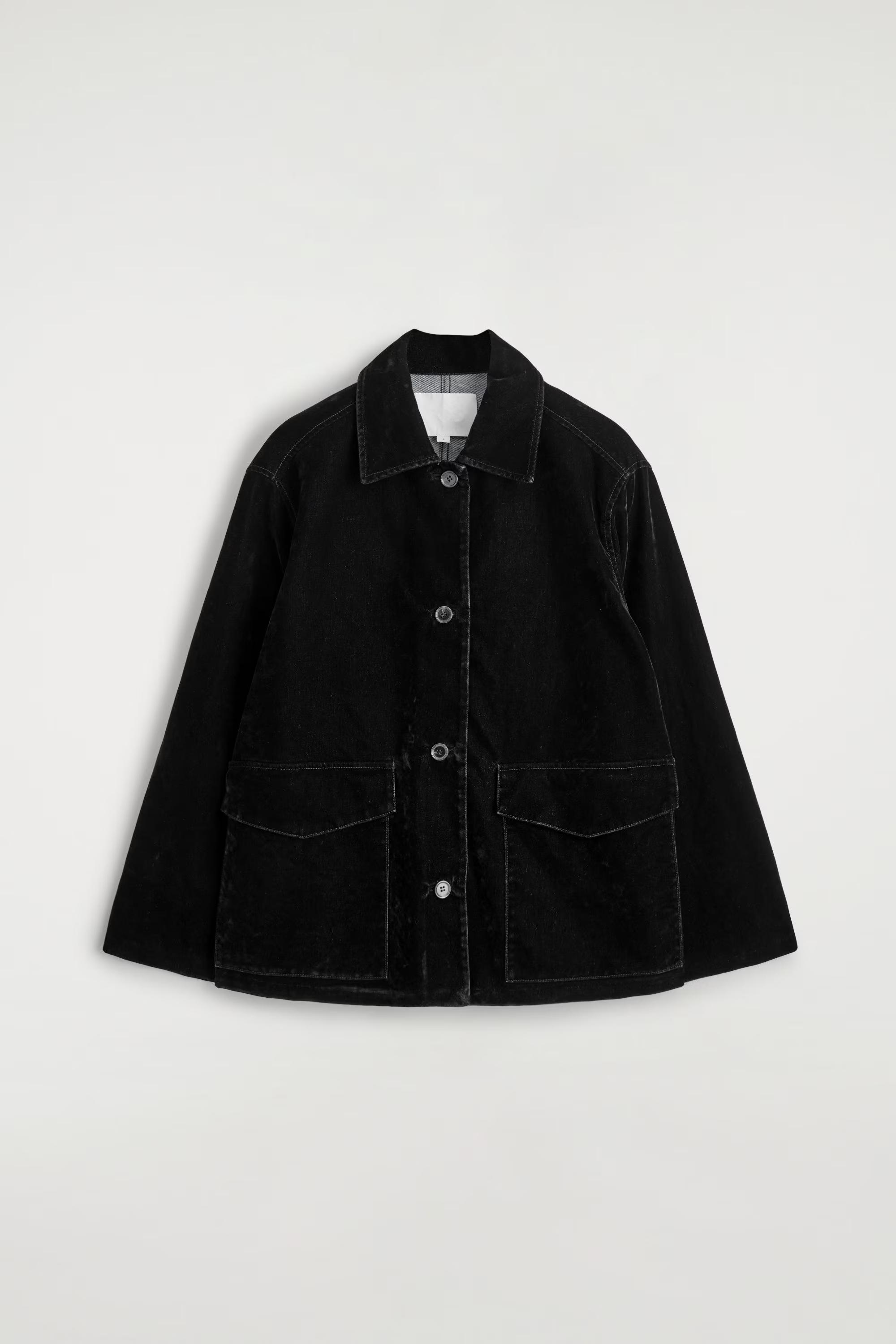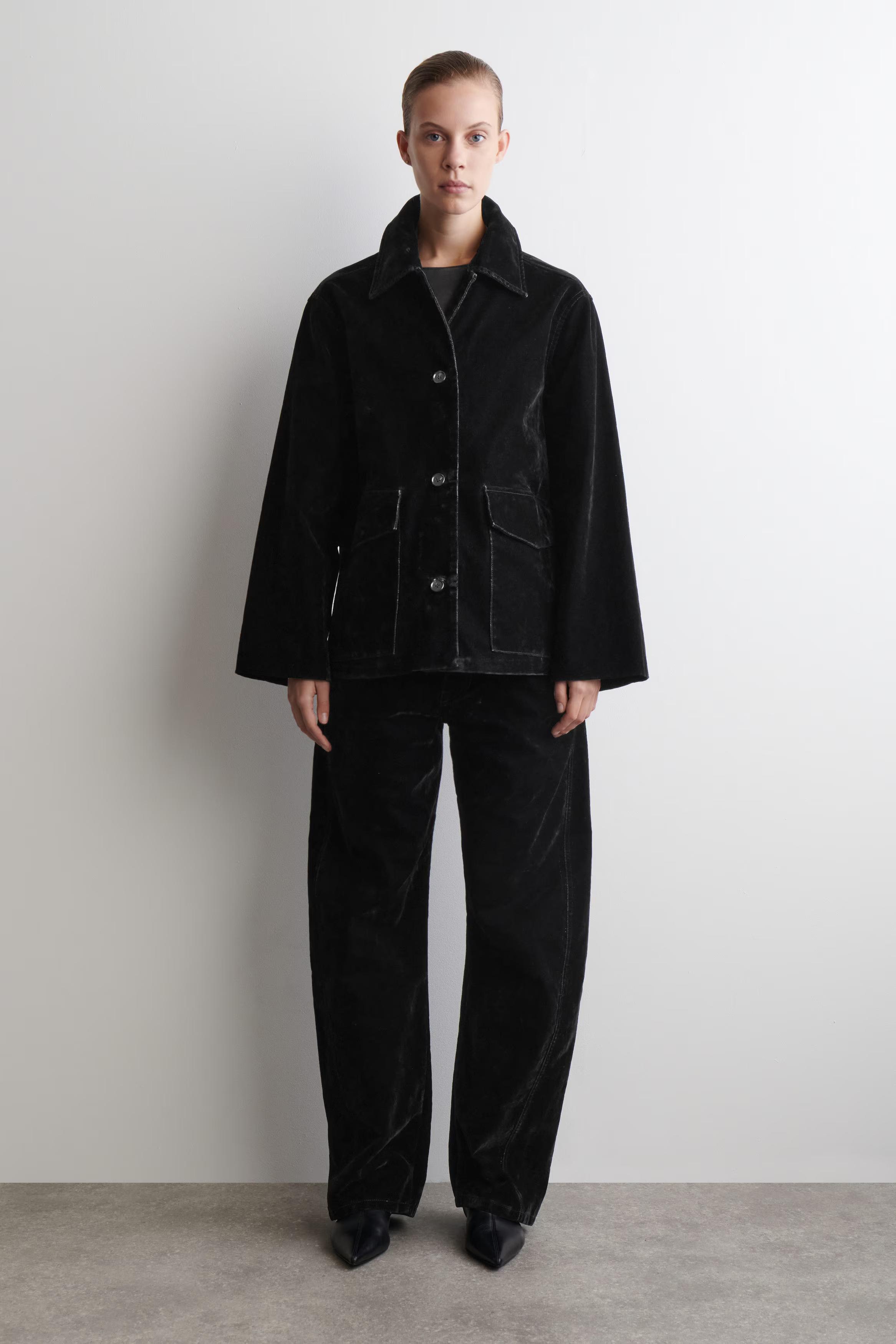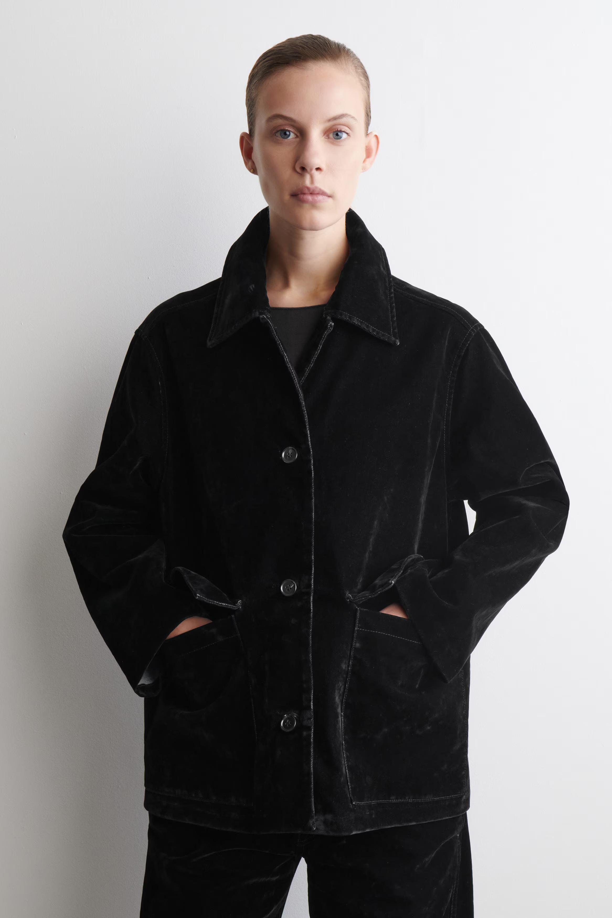 The COS womenswear team offer a fresh perspective on this season's denim. Crafted from tactile flocked cotton, this jacket is cut in a laid-back, sculptural shape and features a classic collar, patch pockets and tonal topstitching. It's washed an enduring black hue that complements neutral tones.\u0026nbsp;\u0026nbsp;Relaxed fitButton closure\u0026nbsp;Shell: 100% Cotton. Excluding trims / Machine wash\u0026nbsp;Back length of size S is 67cm / Model wears a size S