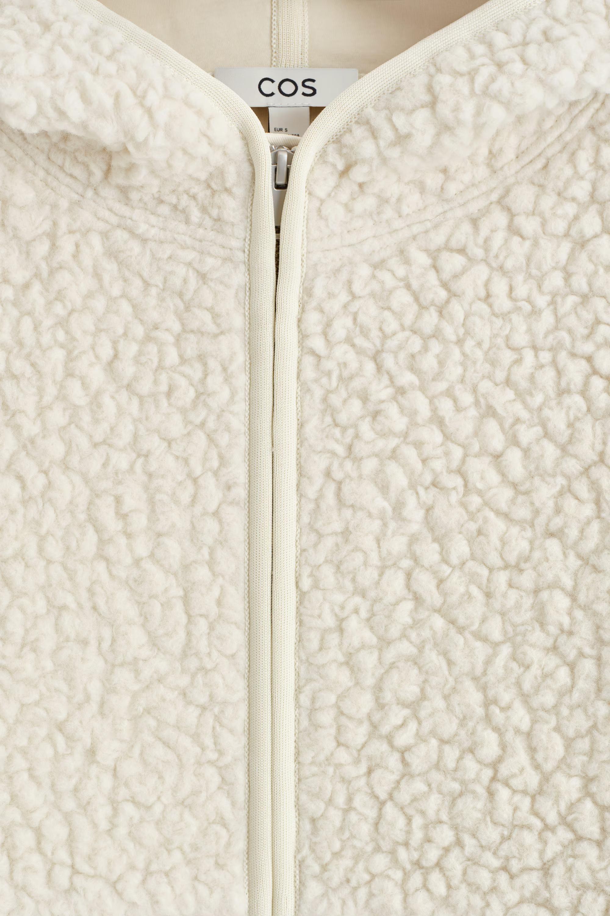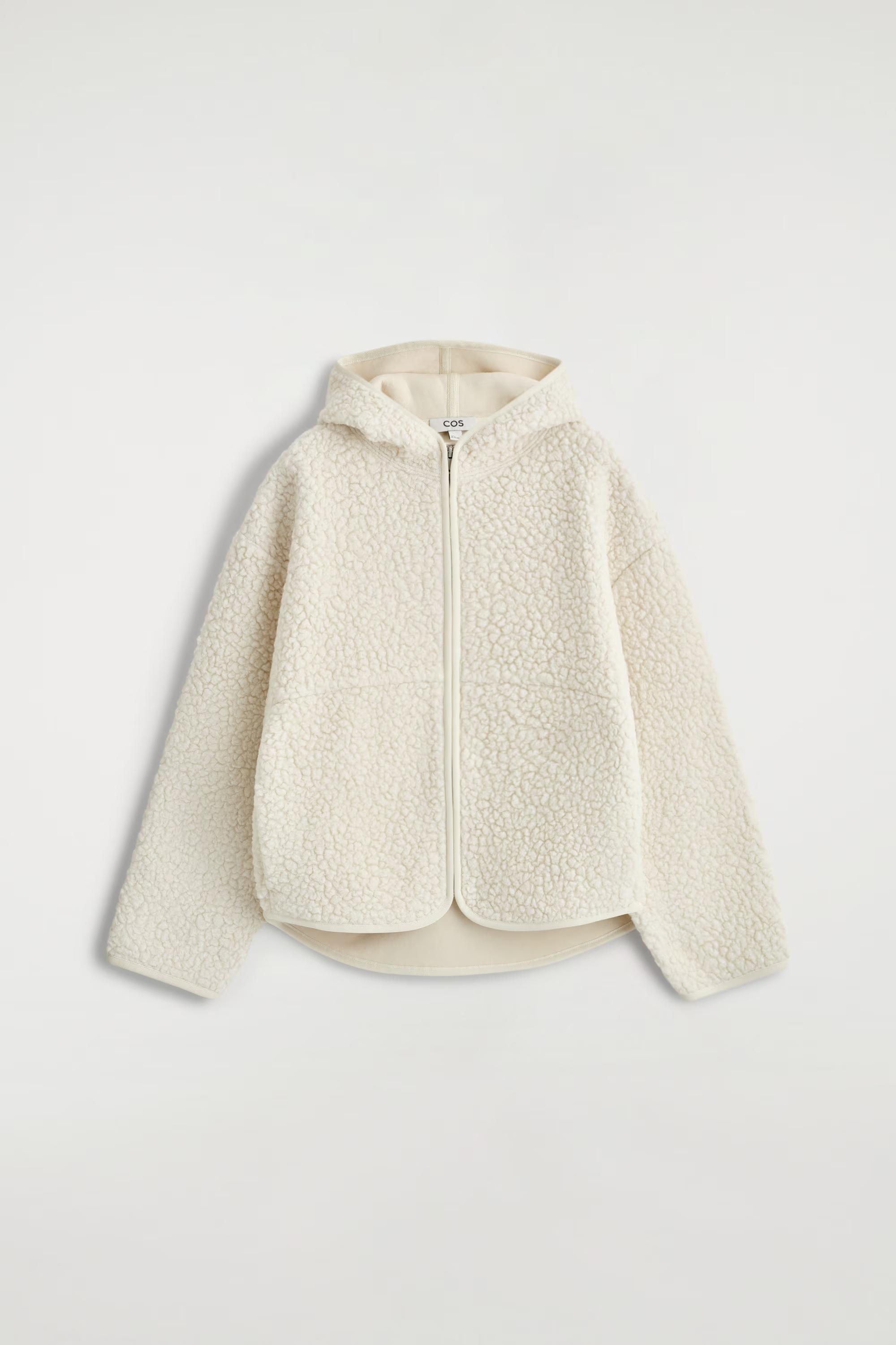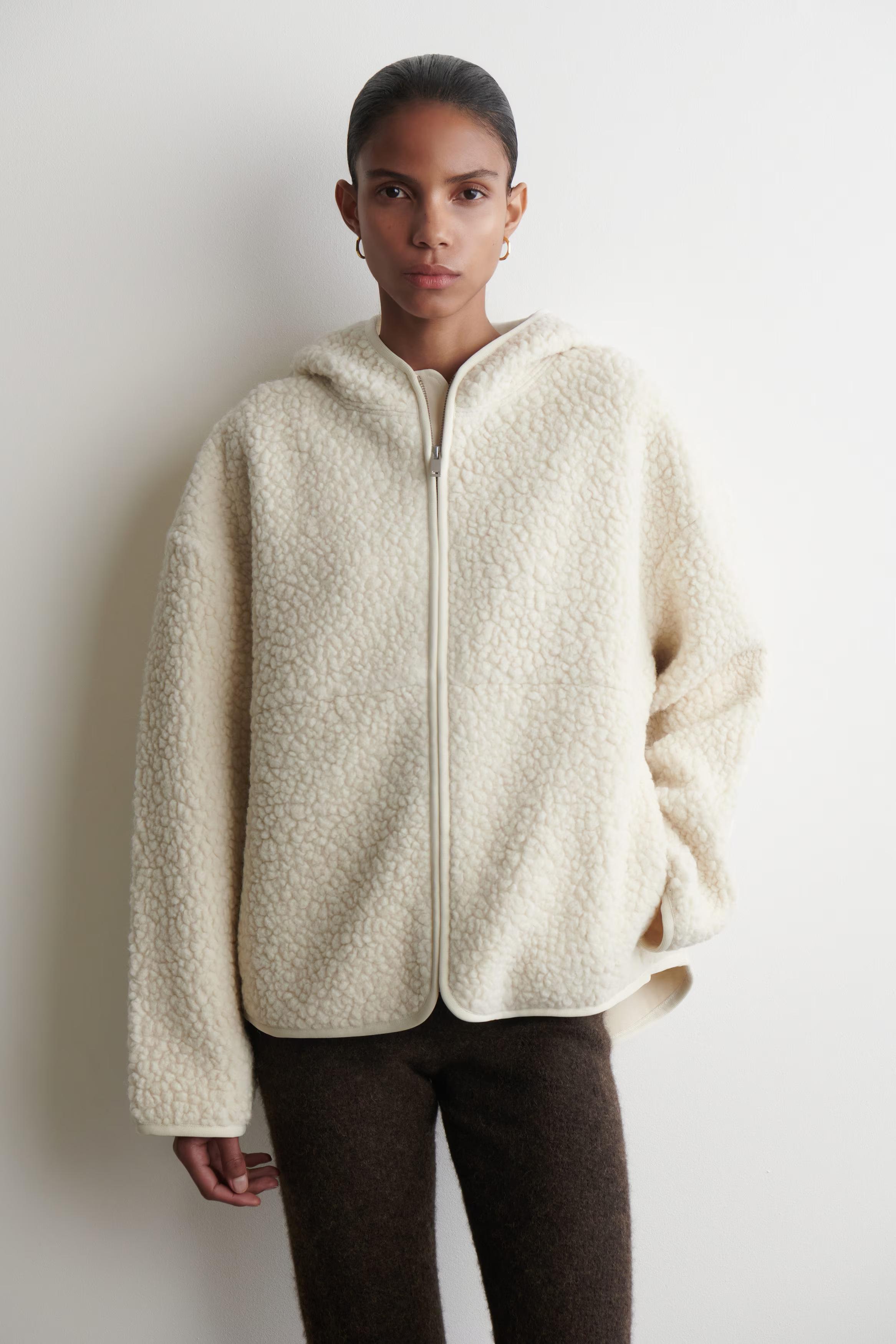 This season, the COS designers reframe winter sportswear through an elevated lens. This cosy jacket is made from luxuriously tactile teddy with a hint of wool for warmth and features an enveloping hood, side pockets and woven panels on each elbow. Style it with leggings.\u0026nbsp;Relaxed fitZip closureRecycled polyester is polyester made from PET bottles or end-of-life textile waste. The PET bottles or textile waste is mechanically recycled and processed into new yarn\u0026nbsp;Shell: 58% Recycled polyester, 25% Cotton, 17% RWS Wool. Excluding trims / Machine wash\u0026nbsp;Back length of size S is 67cm / Model wears a size S