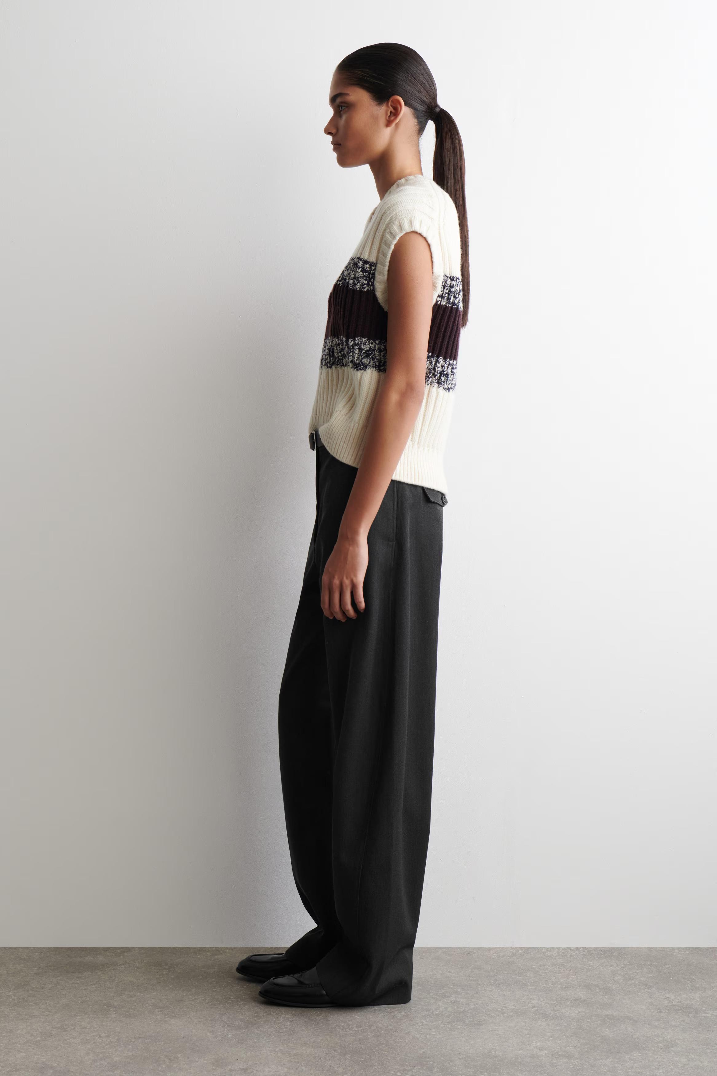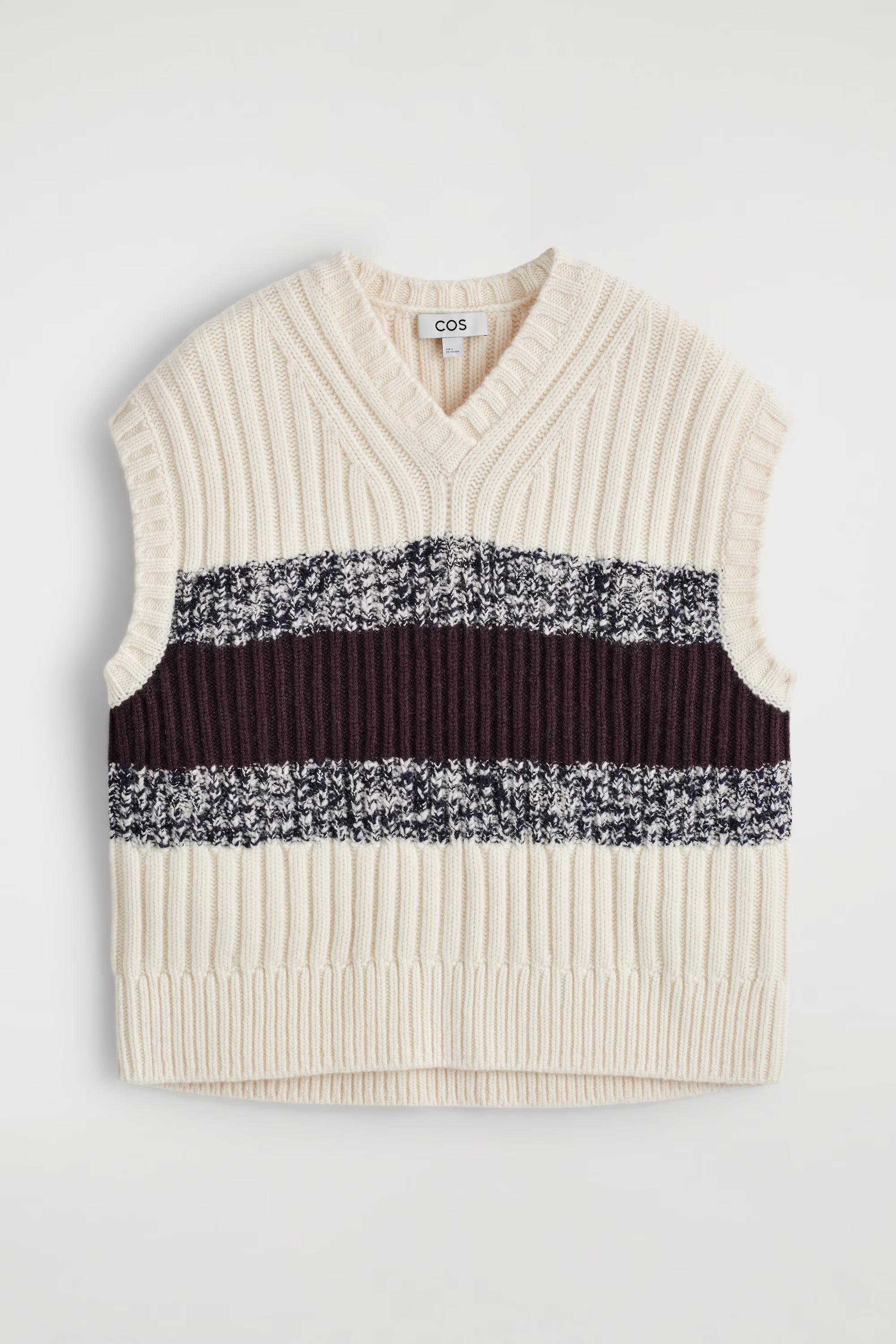 This season, the COS designers renew classic knitwear through rich texture and dynamic pattern. This cream V-neck vest is rib-knitted from premium merino wool and features contrasting burgundy and m\u0026eacute;lange stripes across the front.\u0026nbsp;\u0026nbsp;Regular fitThis product contains Responsible Wool Standard TE-00047206 (RWS) wool fibre from farms certified to animal welfare and land-management requirements\u0026nbsp;Shell: 99% Merino wool, 1% Recycled polyamide (Recycled nylon). Excluding trims / Dry clean\u0026nbsp;Back length of size S is 58cm / Model wears a size S\u0026nbsp;