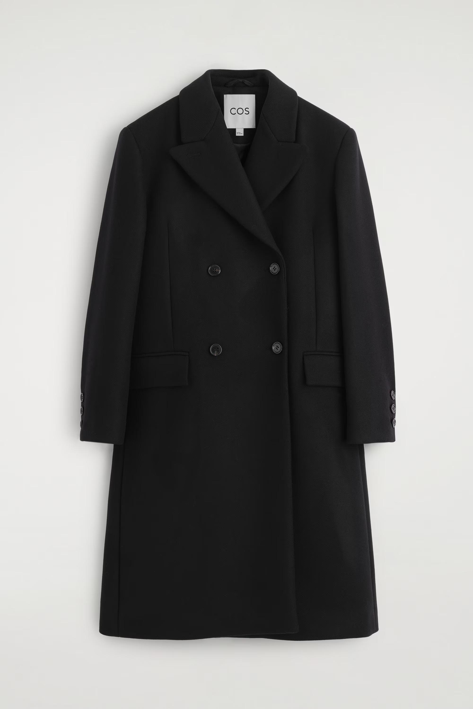 Impeccable tailoring is a cornerstone of the COS wardrobe. Classic in silhouette, this double-breasted coat is crafted from premium Italian wool from the esteemed Manteco mill and designed with flap pockets, a back vent and shaped seams at the waist.\u0026nbsp;Regular fitButton closureThis product contains Responsible Wool Standard TE-00047206 (RWS) wool fibre from farms certified to animal welfare and land-management requirements\u0026nbsp;Shell: 75% RWS Wool, 25% Polyamide (Nylon). Lining: 100% Viscose. Excluding trims / Dry clean\u0026nbsp;Back length of size EU 36 is 103.5cm / Model wears a size EU 36