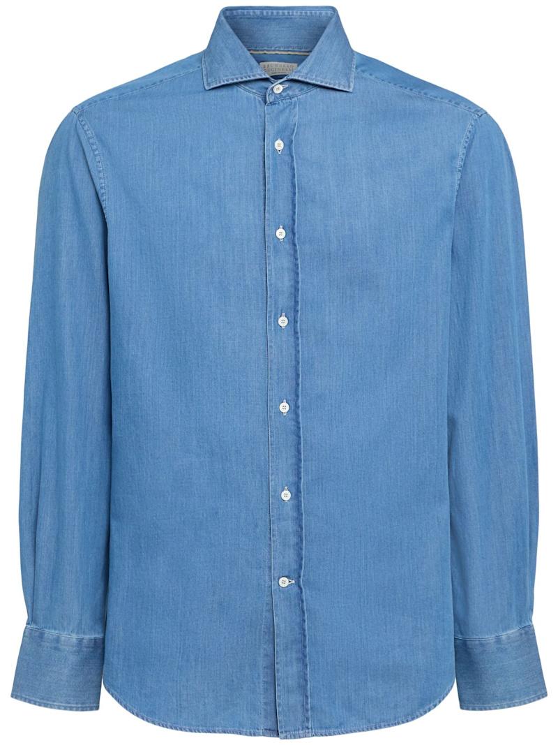 棉质牛仔衬衫 - Denim Medio - 男士 - Brunello Cucinelli - 正面纽扣开合.