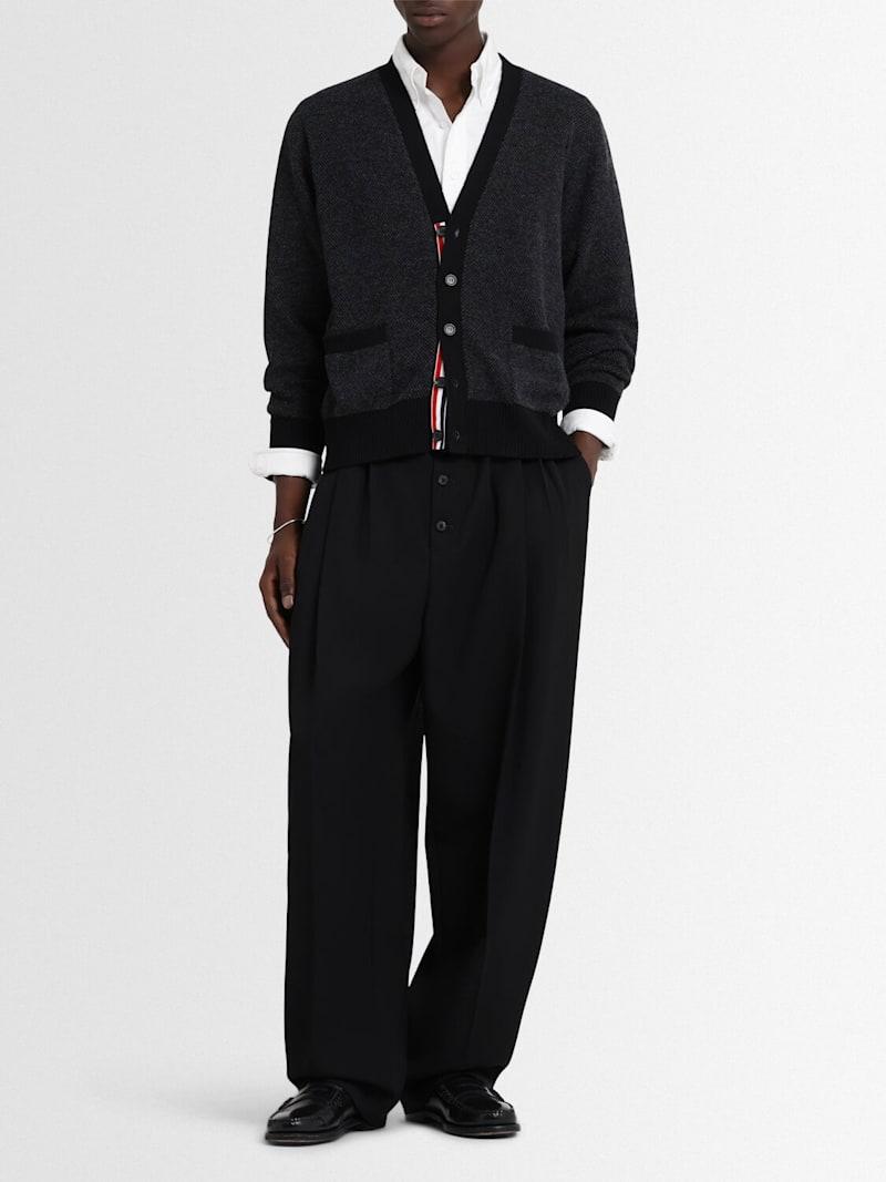 纹理缝线V领羊毛开衫 - 黑色 - 男士 - Thom Browne - 罗纹领口、袖口和下摆.