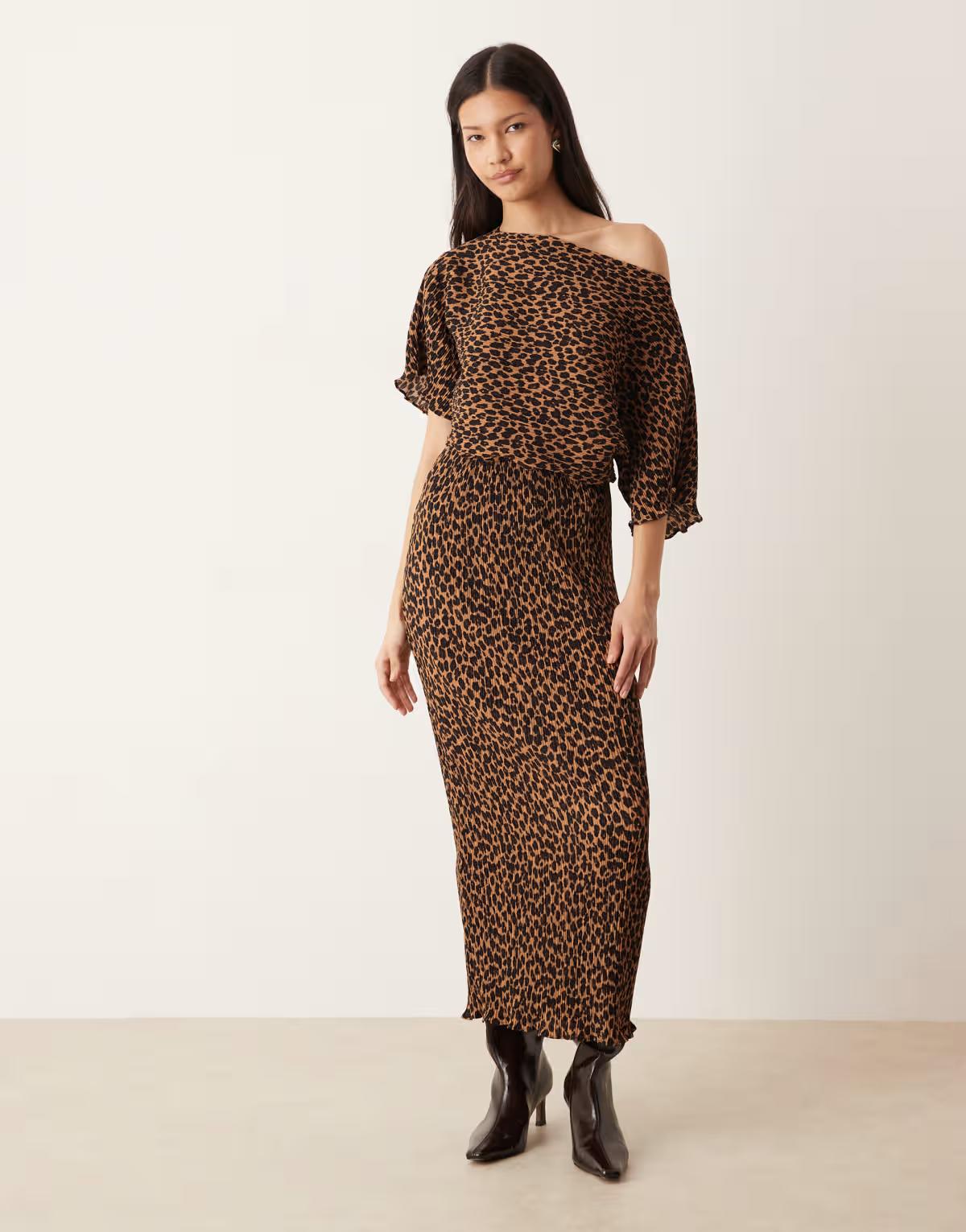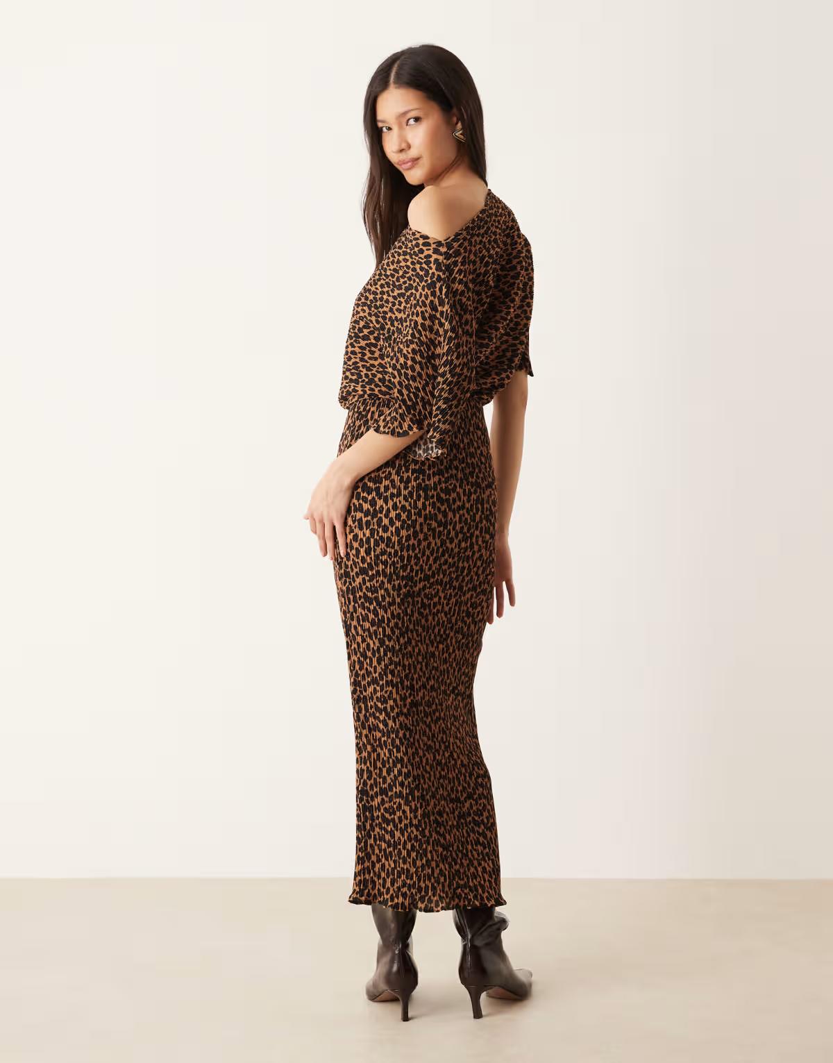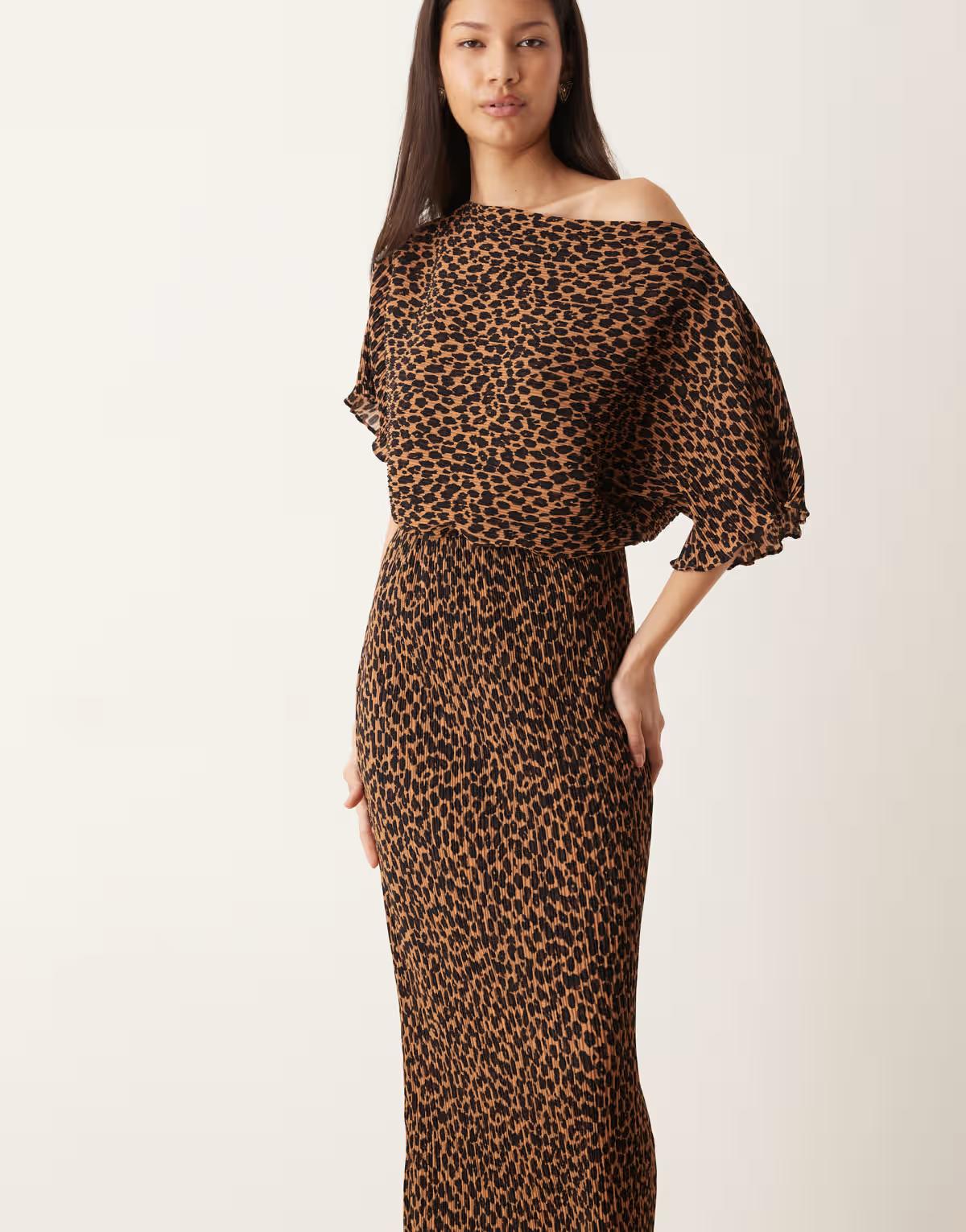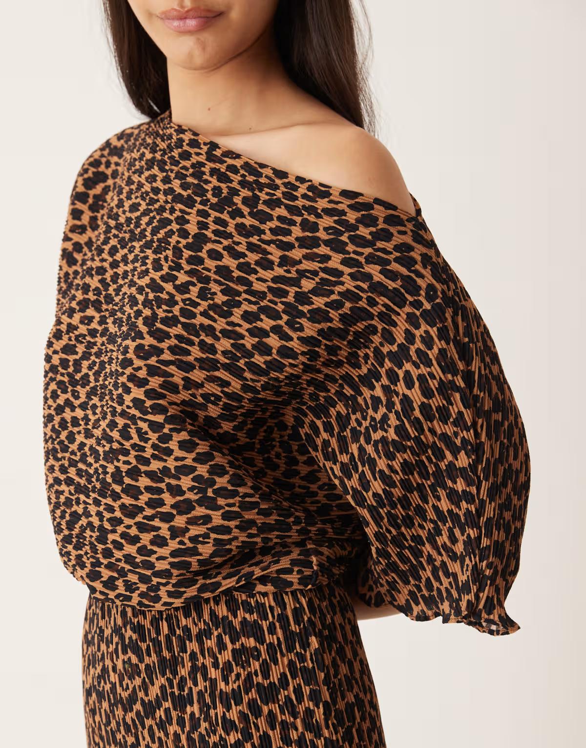 Never Fully Dressed Tilly off shoulder plisse midaxi dress in leopard