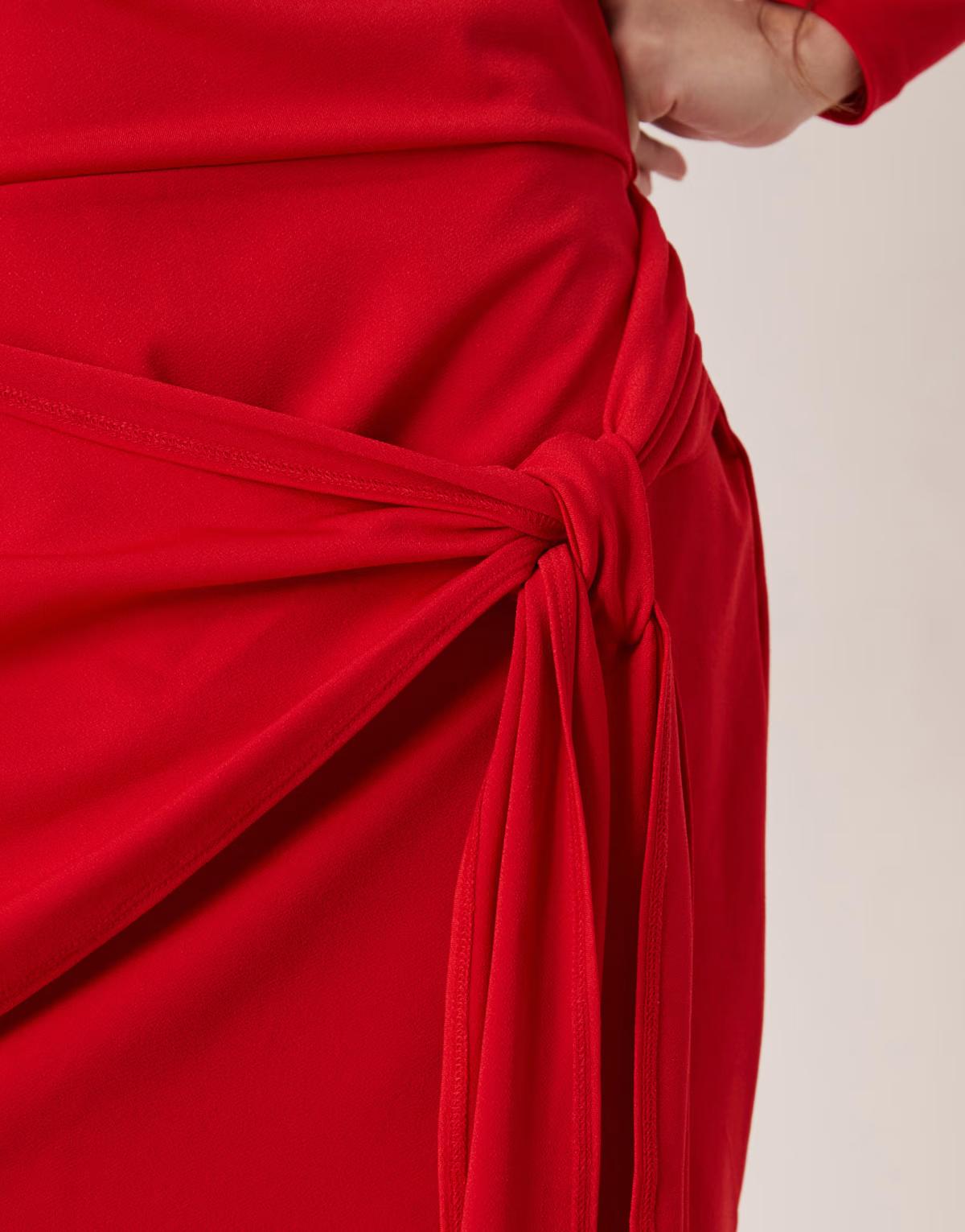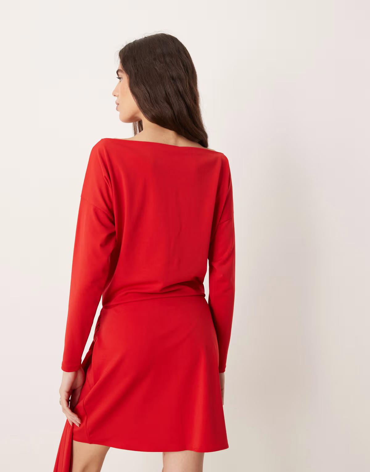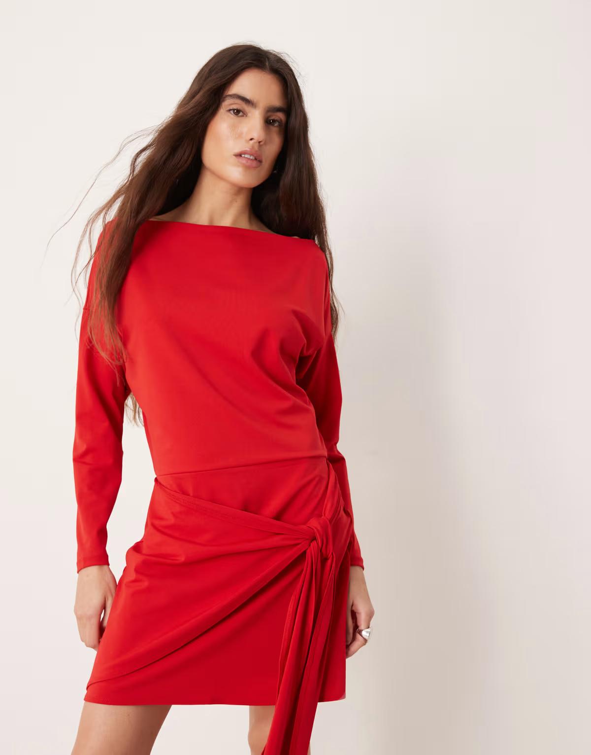 Abercrombie & Fitch slash neck long sleeve mini dress with tie up front detail in red