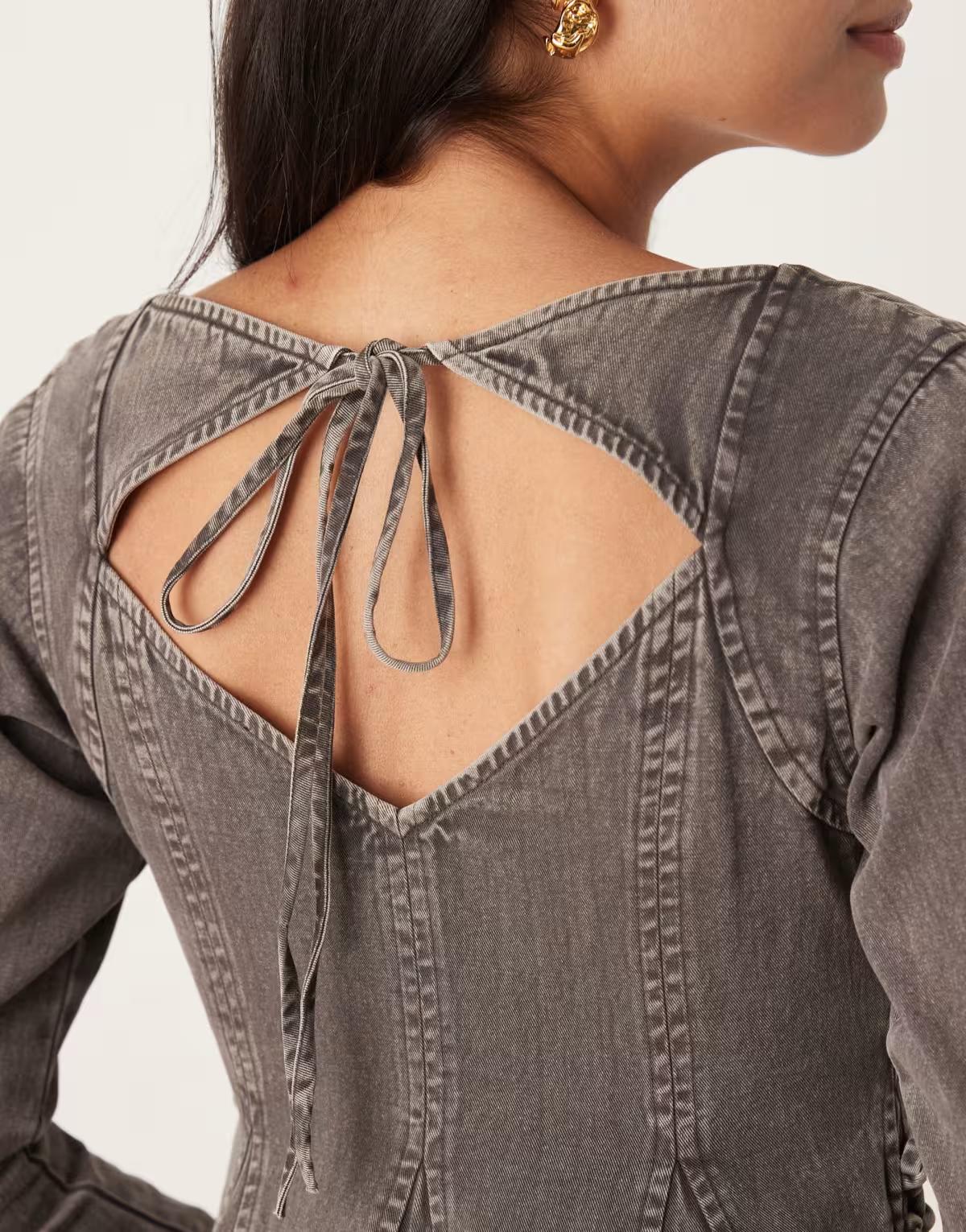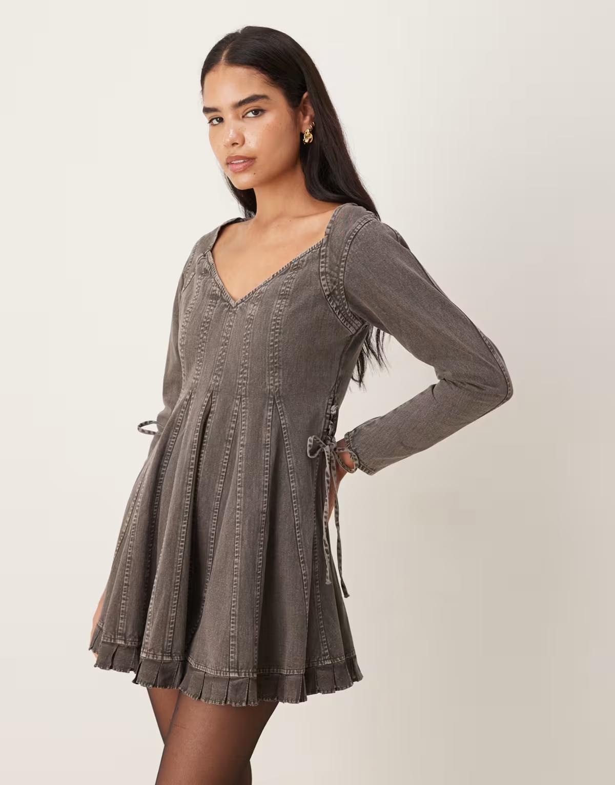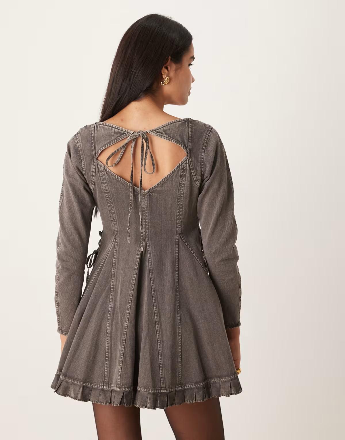 ASOS DESIGN v neck washed lace up side skater mini dress in charcoal grey