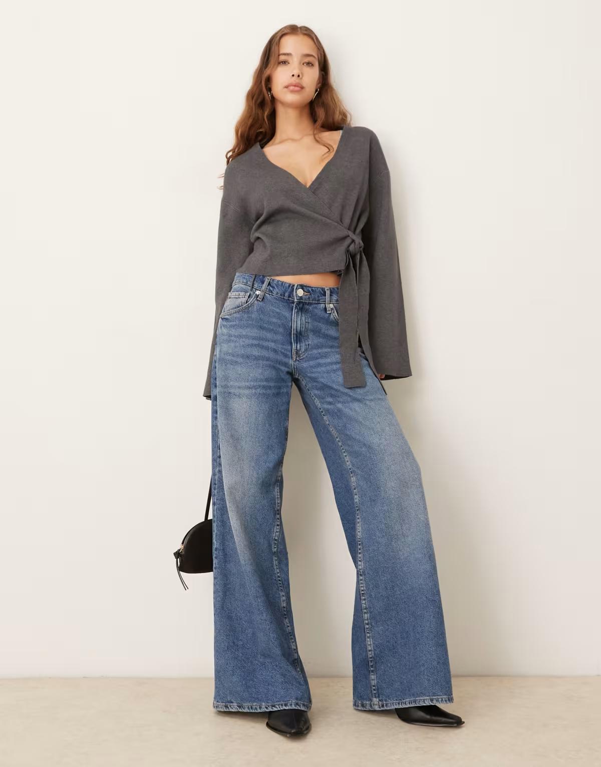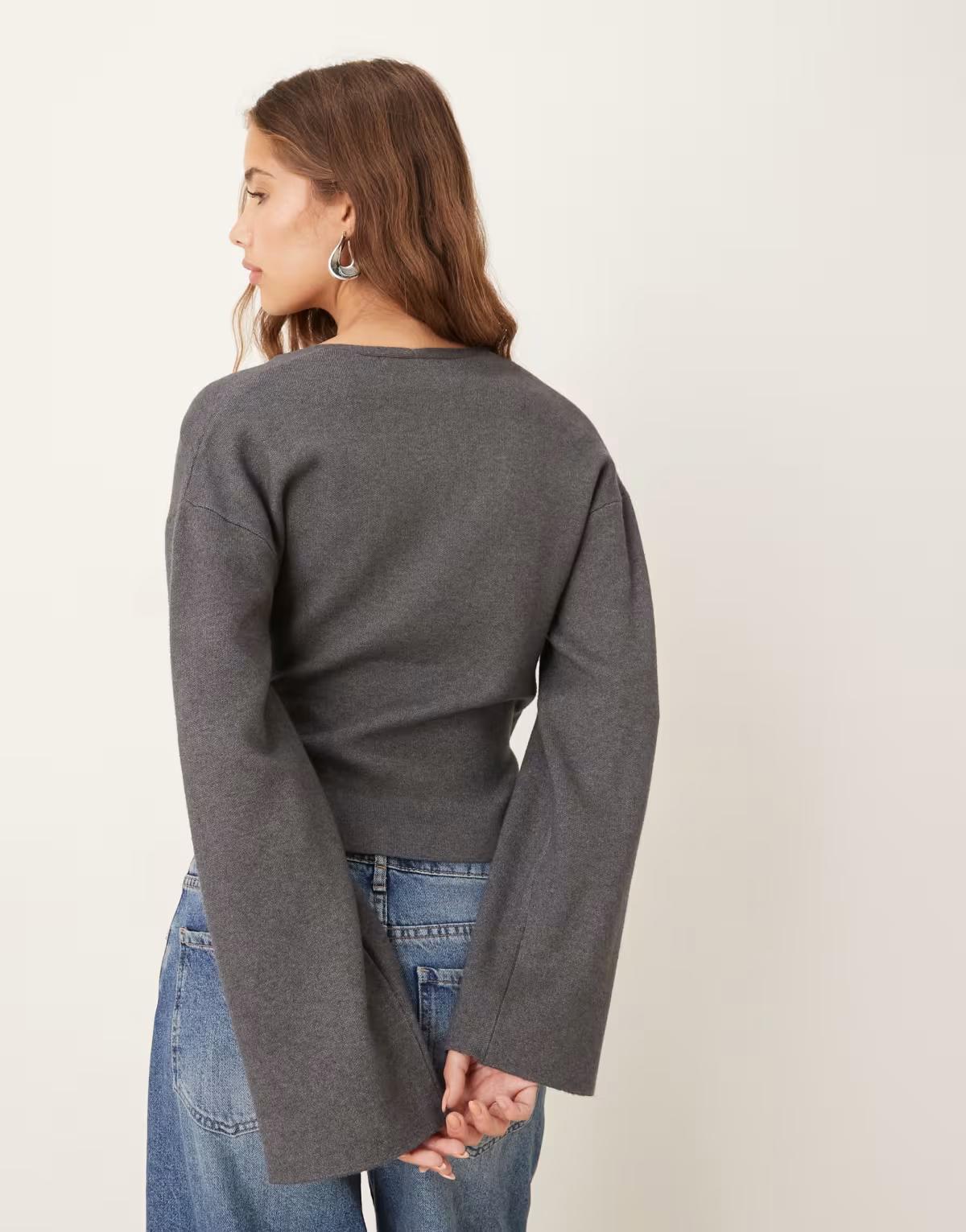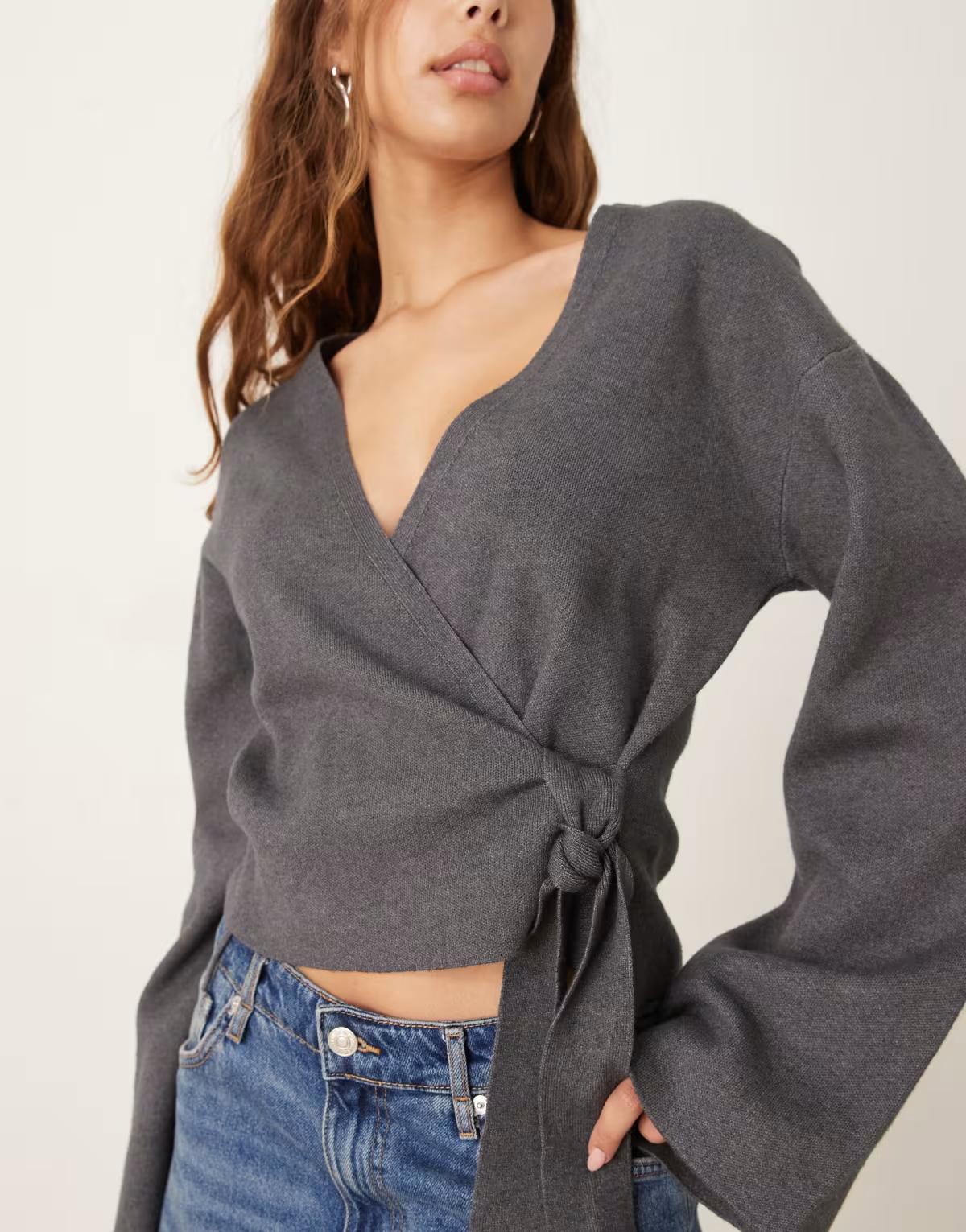Gina Tricot v neck knitted wrap cardigan with wide sleeves in dark grey melange