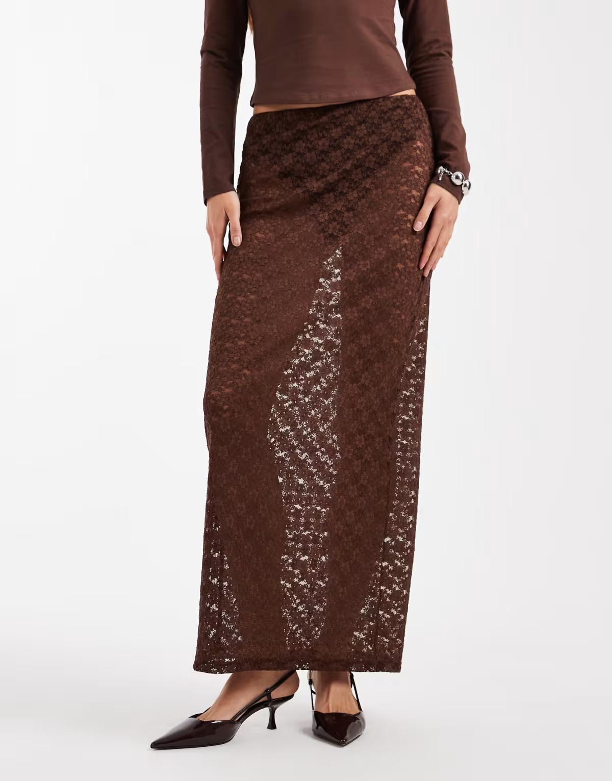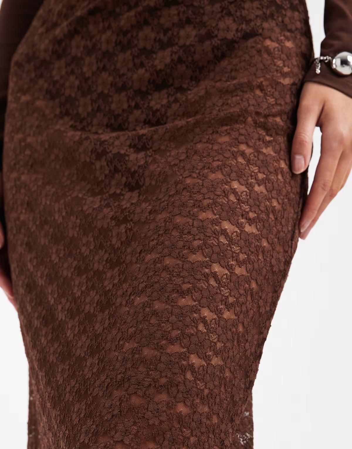 ASOS DESIGN lace sheer column maxi skirt in chocolate