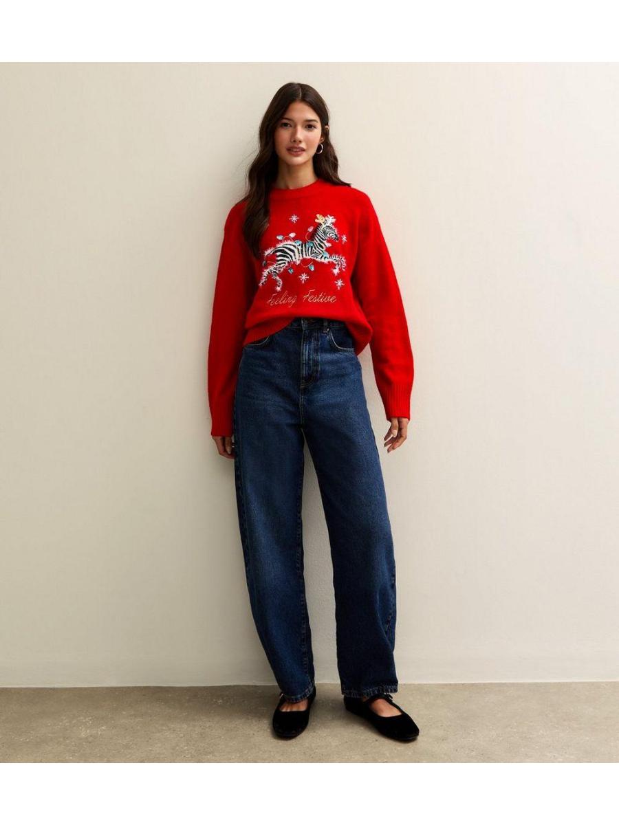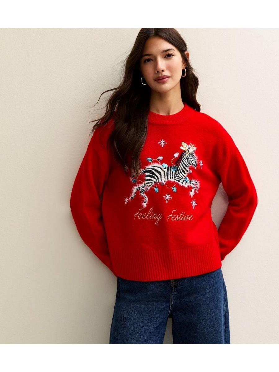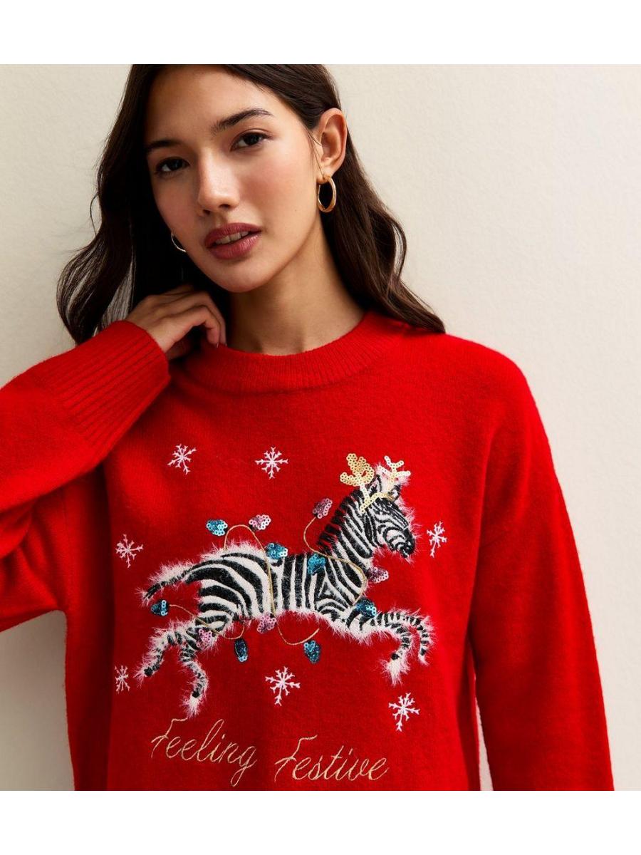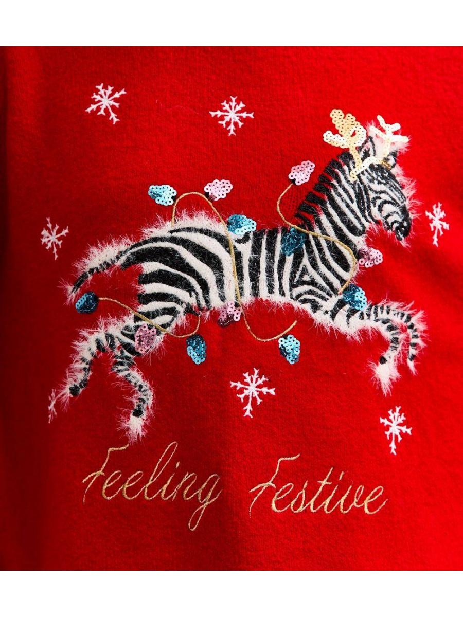 Red Christmas Embroidered Zebra Feeling Festive Jumper