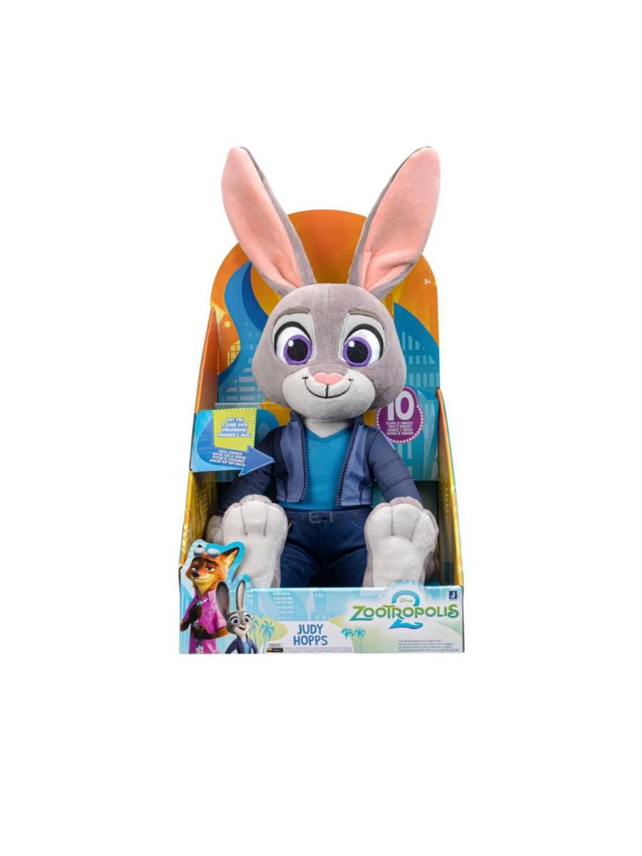 Experience the adventure of Zootropolis 2 with the 35.5cm Judy Hopps feature soft toy inspired by Disney's beloved animated film. Judy Hopps is a female rabbit who is Zootropolis’s first bunny to become an officer. Press her belly to activate 10+ sounds and phrases! Perfect for storytelling and cuddling, this soft toy friend is designed to join young fans on thrilling adventures and reenact their favourite movie scenes. Complete your Zootropolis 2 collection by collecting the other feature soft toy inspired by Nick Wilde and Gary De’Snake, and additional Zootropolis toys and soft toys!