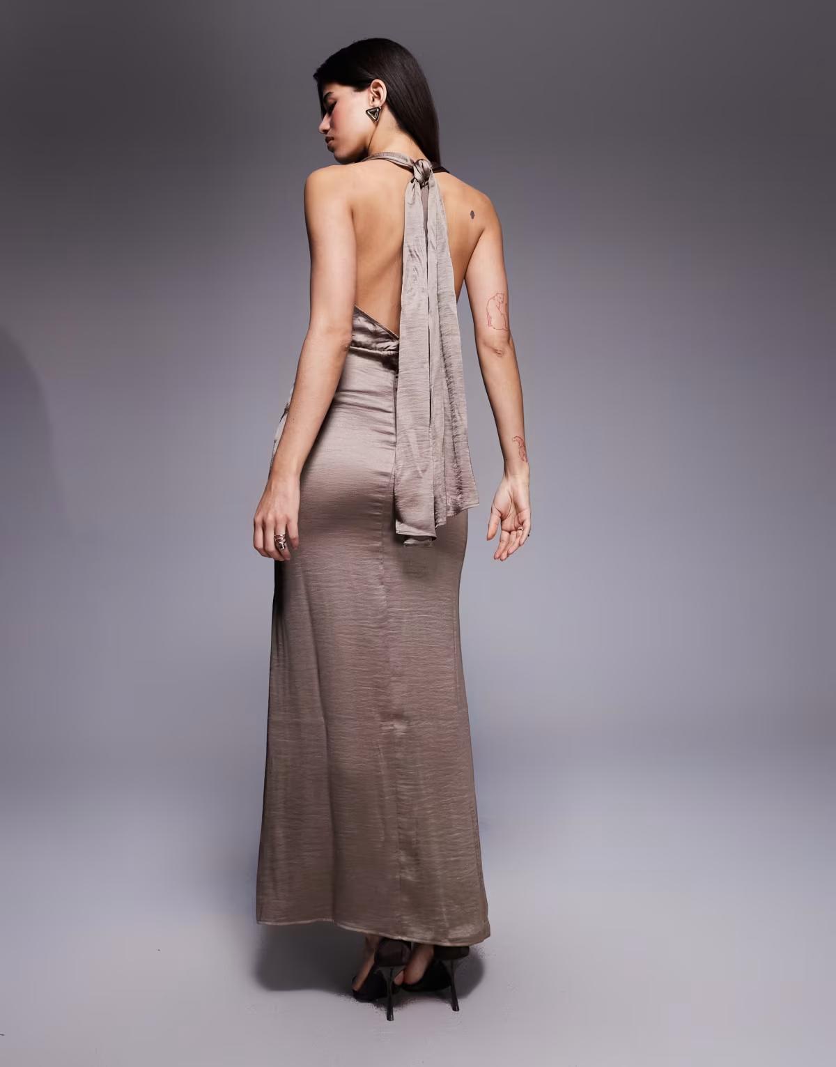TFNC satin deep v halter neck knot detail drape front maxi dress in pewter