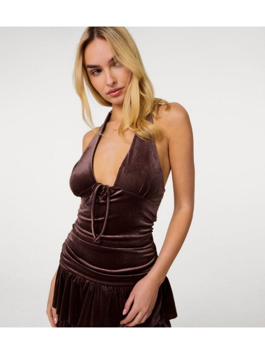 Pink Vanilla Dark Brown Velvet Halter Mini Dress