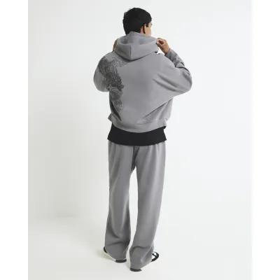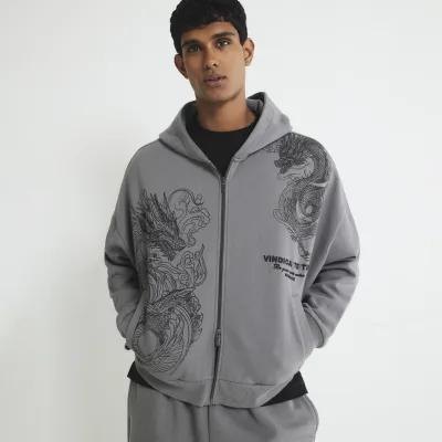 Grey Oversized Fit Zip Through Dragon Hoodie