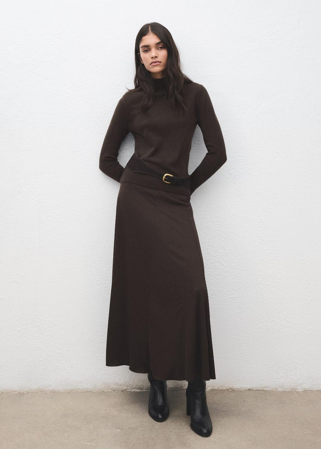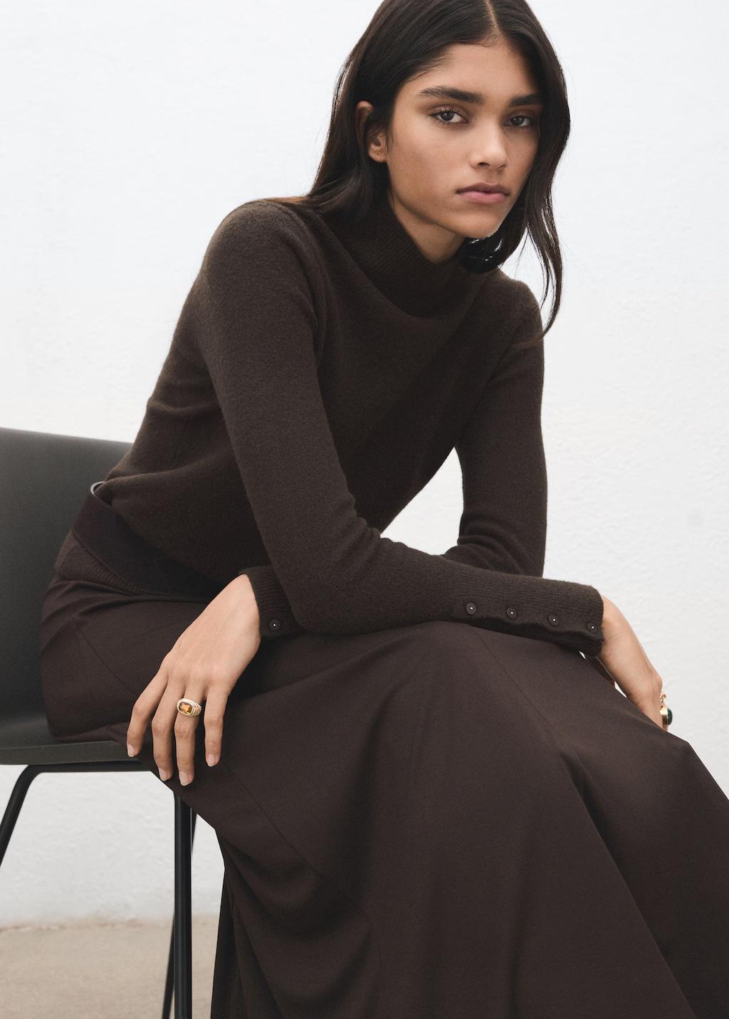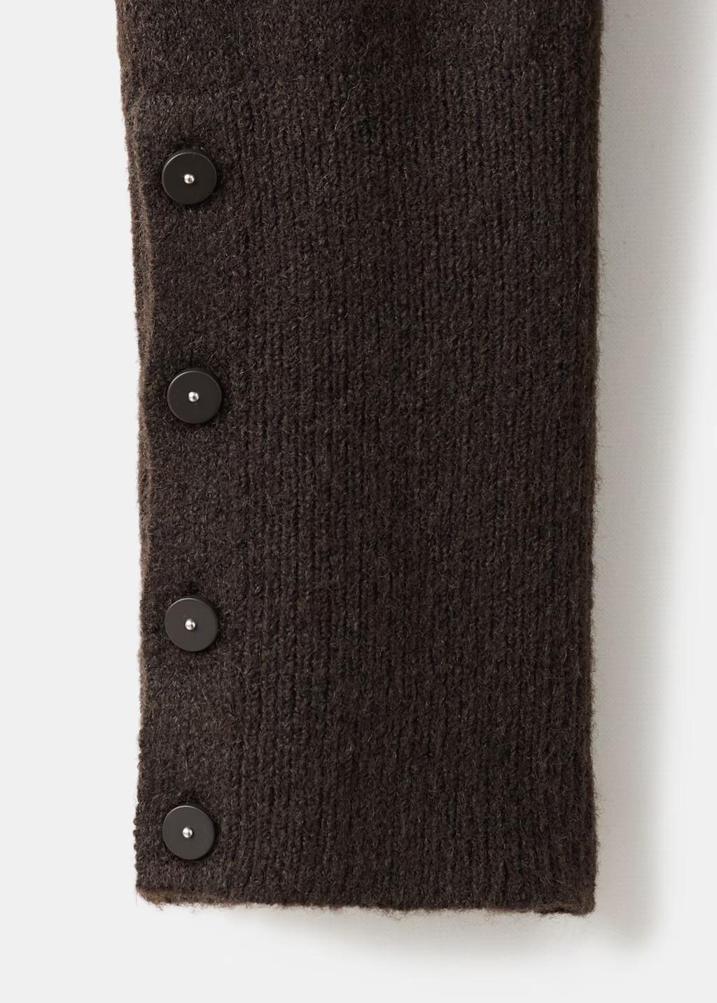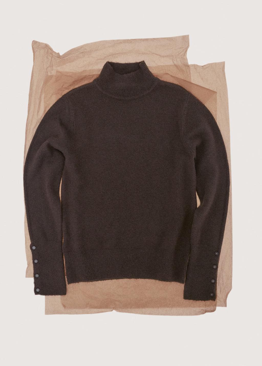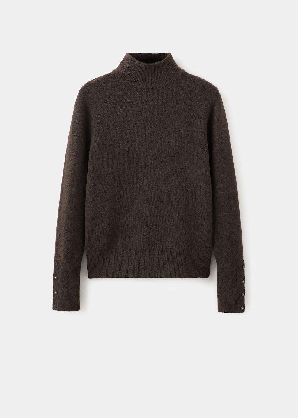 Tejido de punto medio. Diseño recto. Cuello perkins. Manga larga. Puños abotonados. Sin cierre