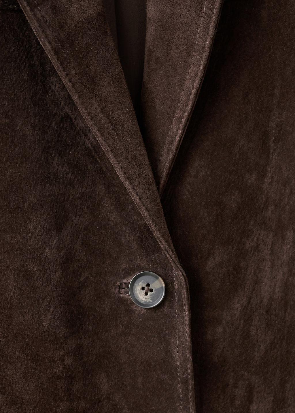 100% piel de ante. Diseño recto. Cuello pico con solapa. Solapas con muesca. Manga larga con puños abotonados. Dos bolsillos de solapa laterales. Cierre de botones en la parte delantera. Forro interior. Exclusivo Online