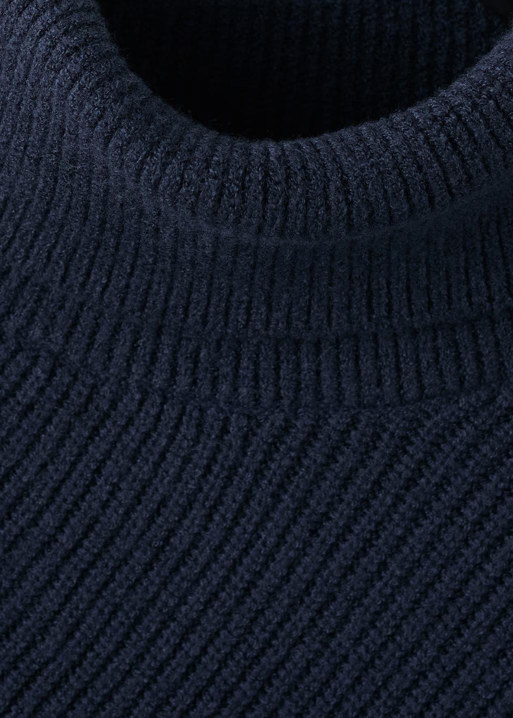 Tejido de punto fino. Diseño recto. Cuello vuelto. Manga larga. Bajo asimétrico. Sin cierre