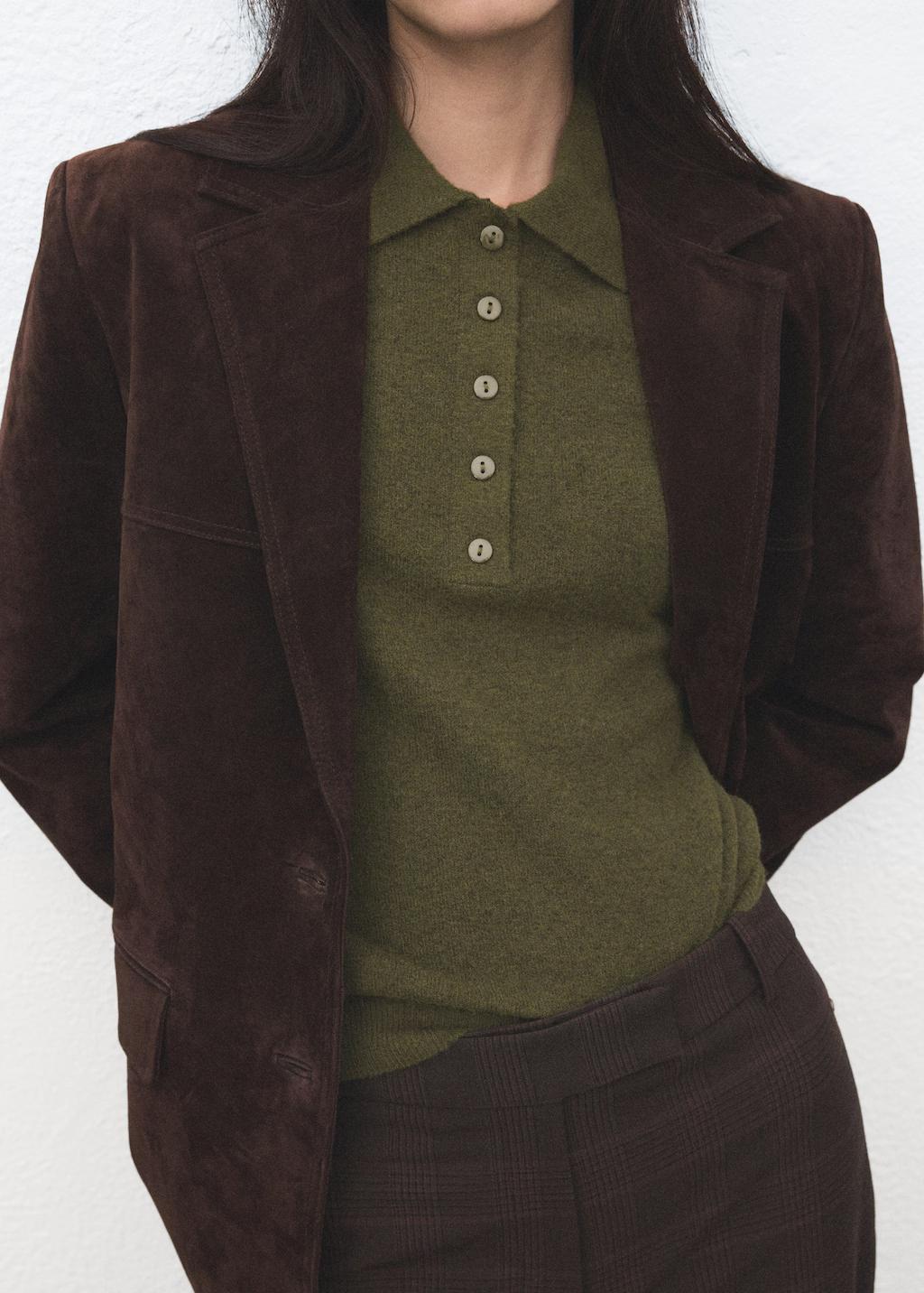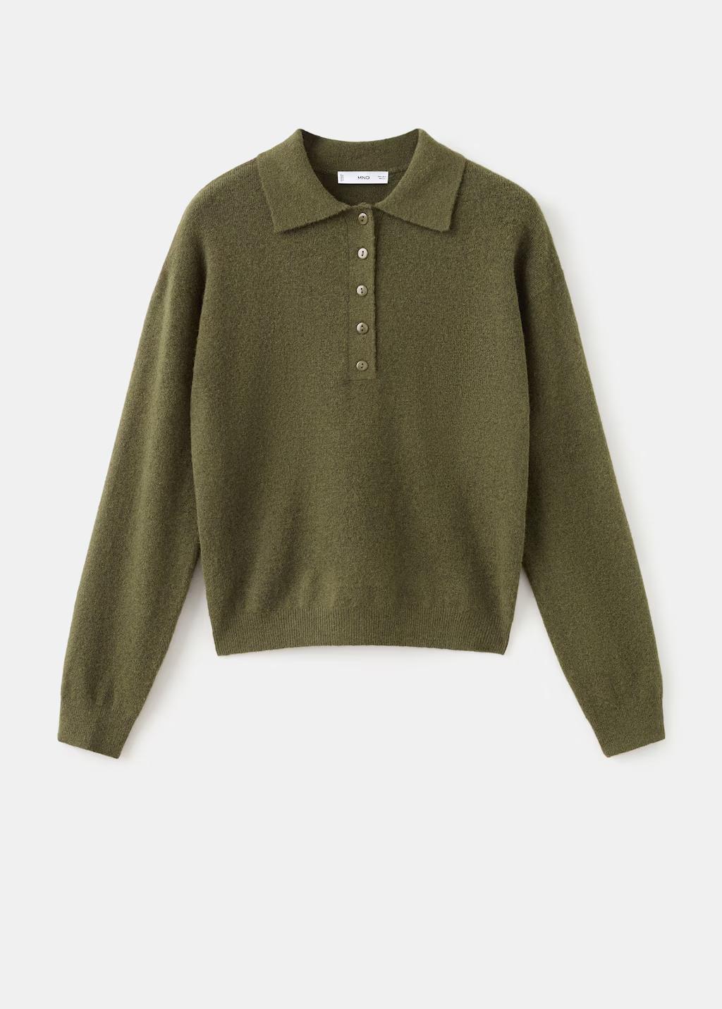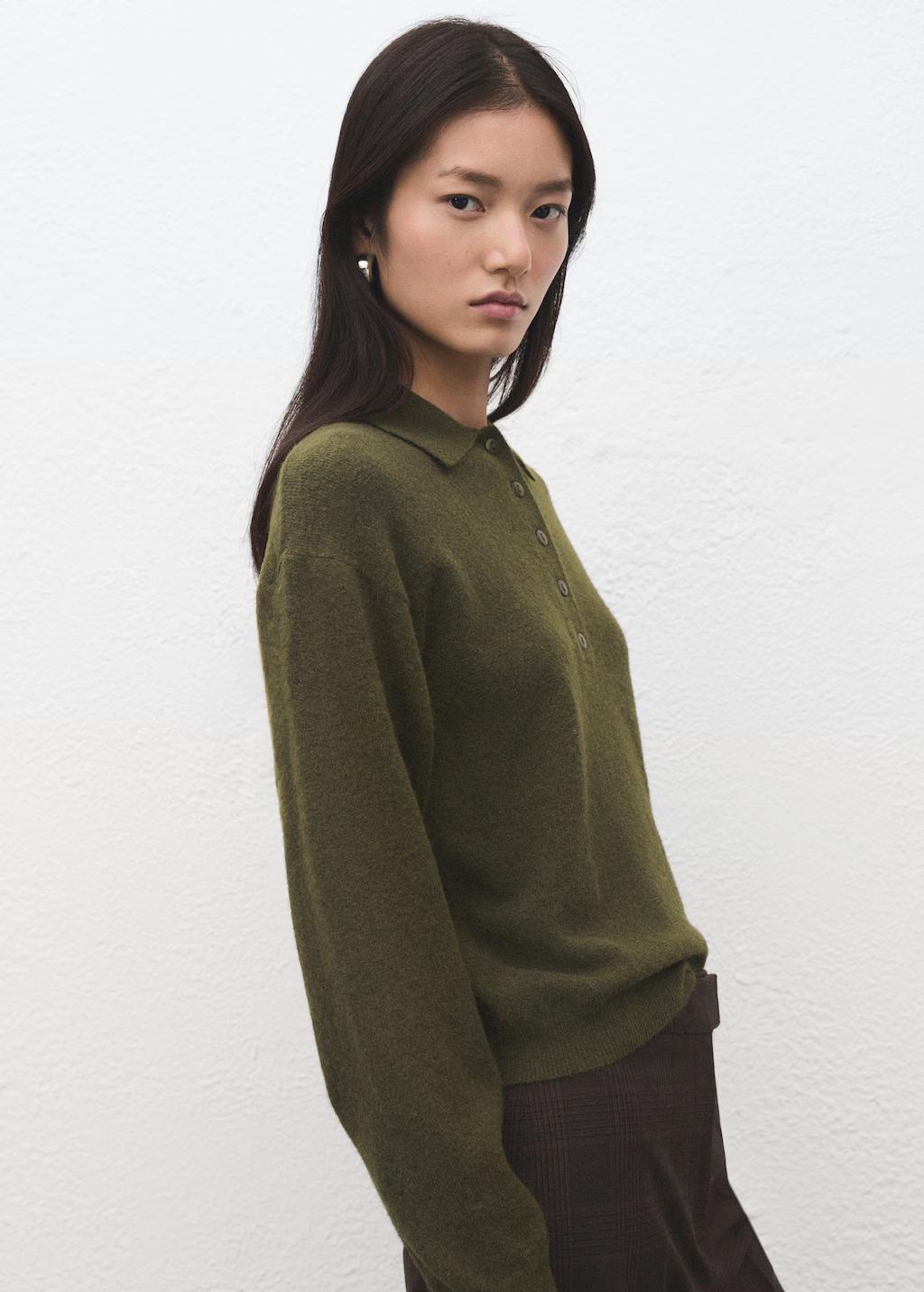 Tejido de punto fino. Diseño recto. Cuello polo con cierre de botones. Manga larga. Disponible Plus