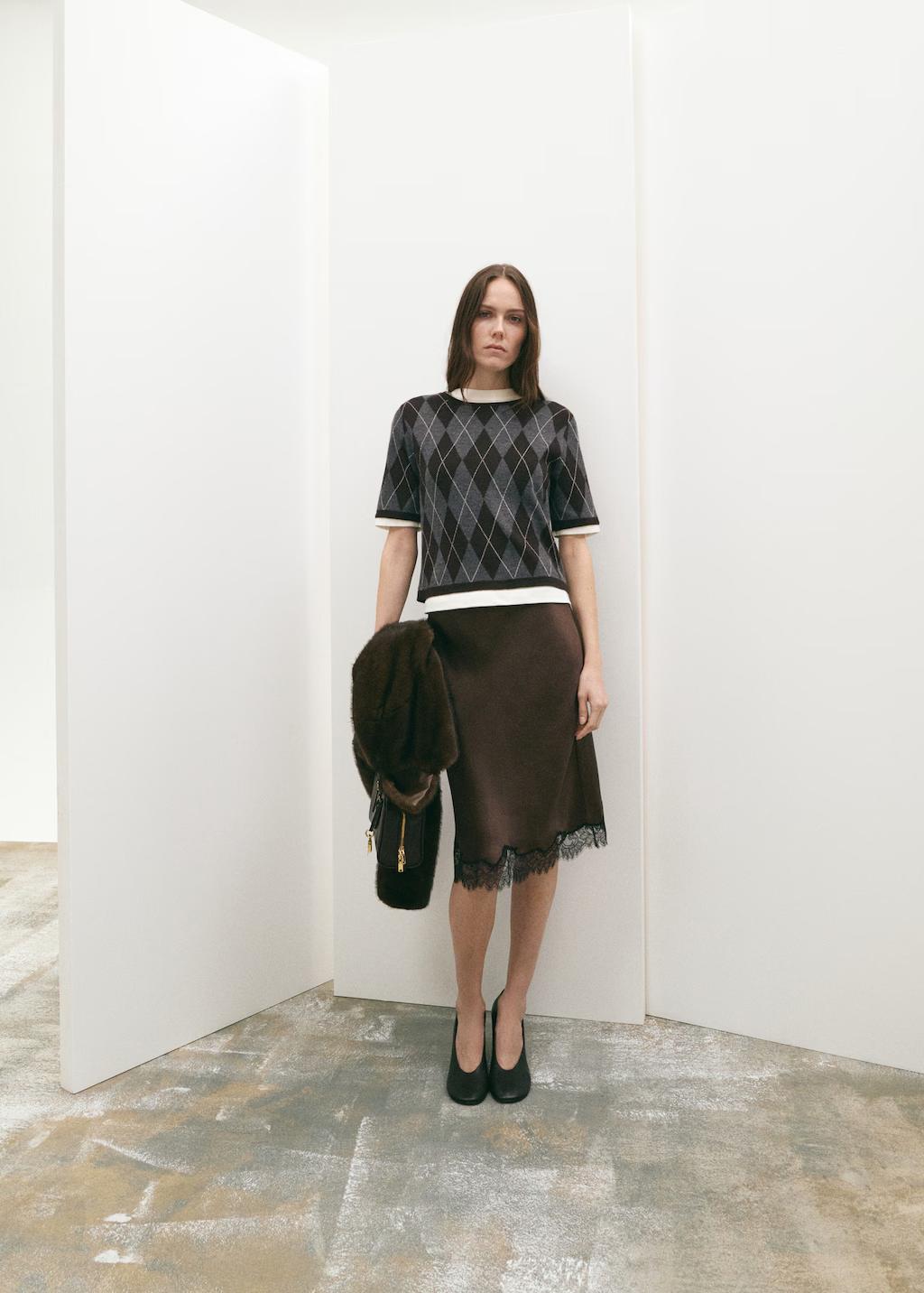 Tejido de punto fino. Diseño recto. Diseño de rombos. Cuello redondo. Manga corta. Sin cierre
