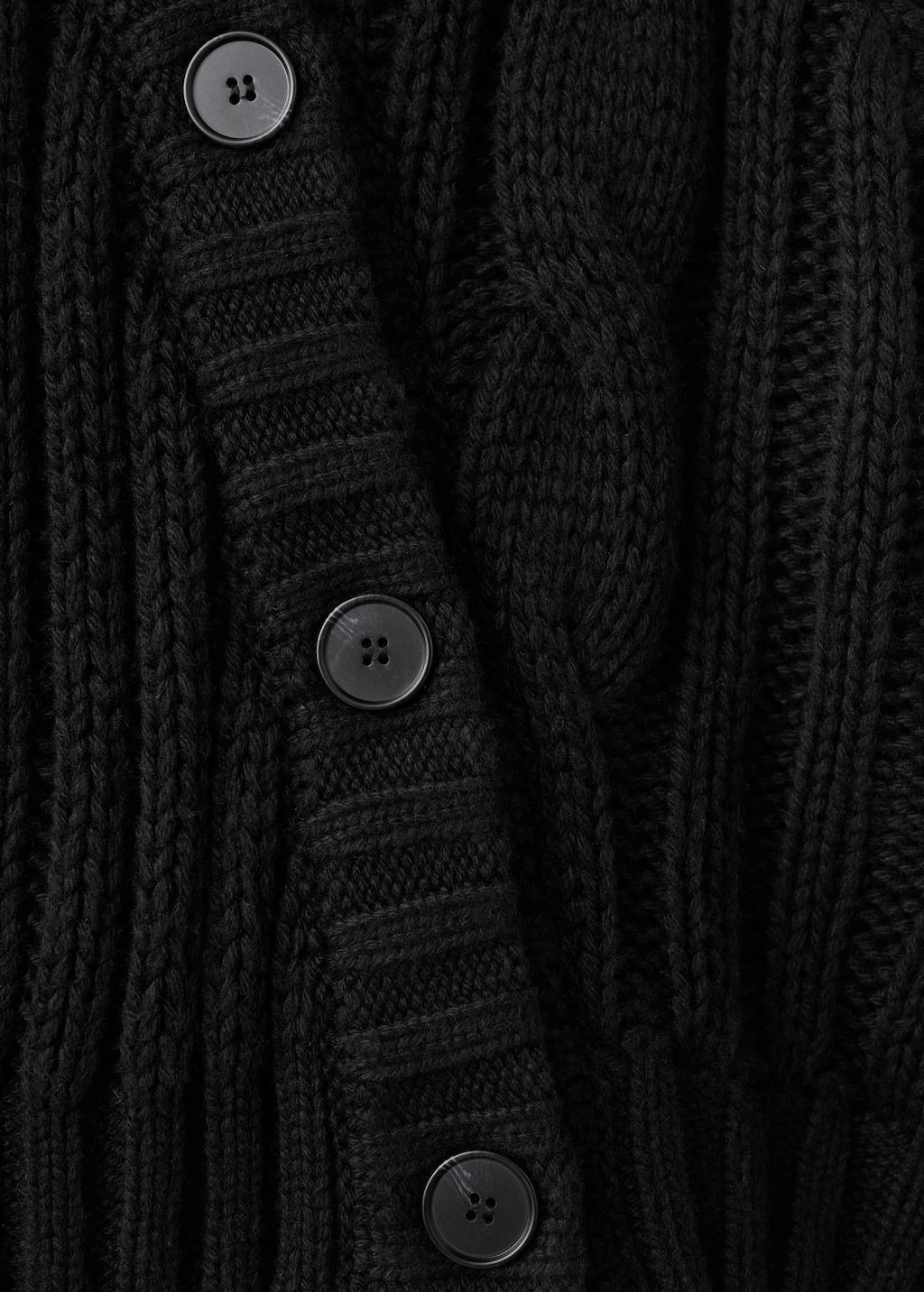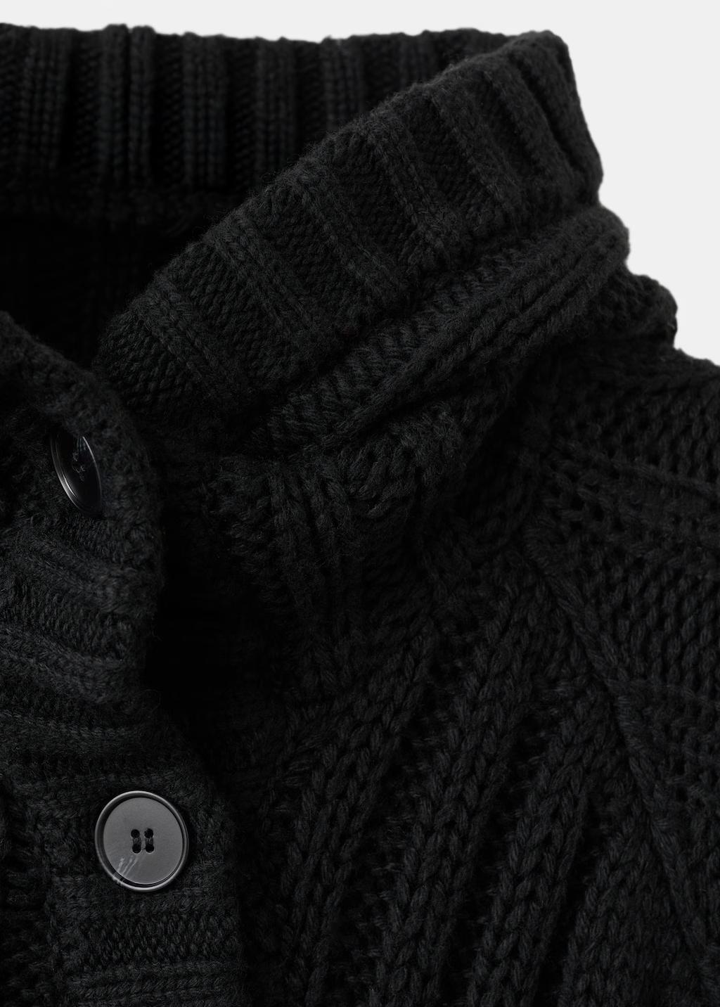 Tejido de punto grueso. Diseño recto. Estilo cruzado. Cuello con capucha. Manga larga. Cierre de botones