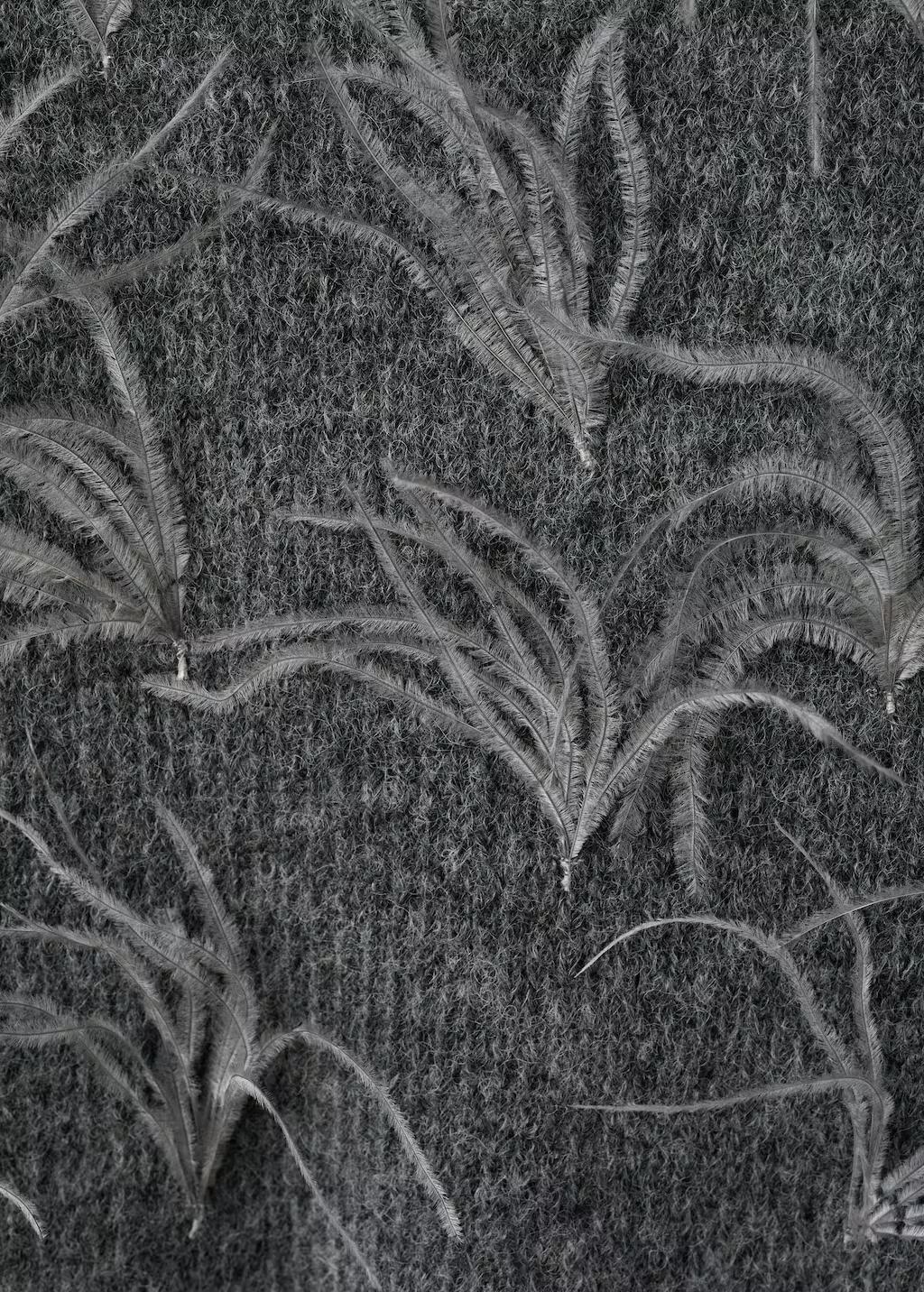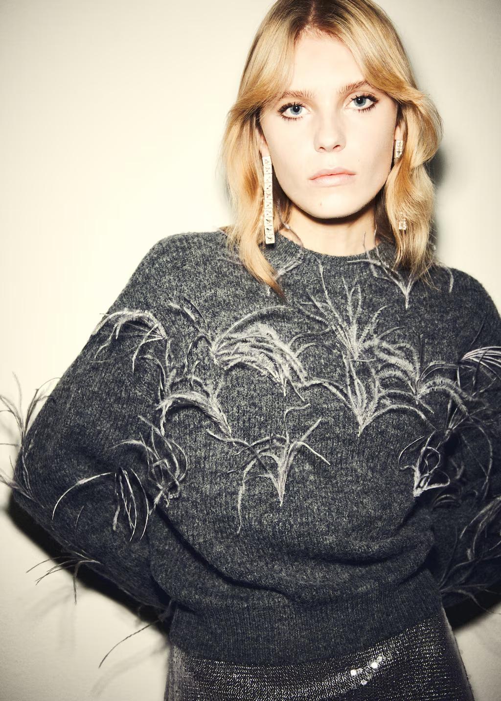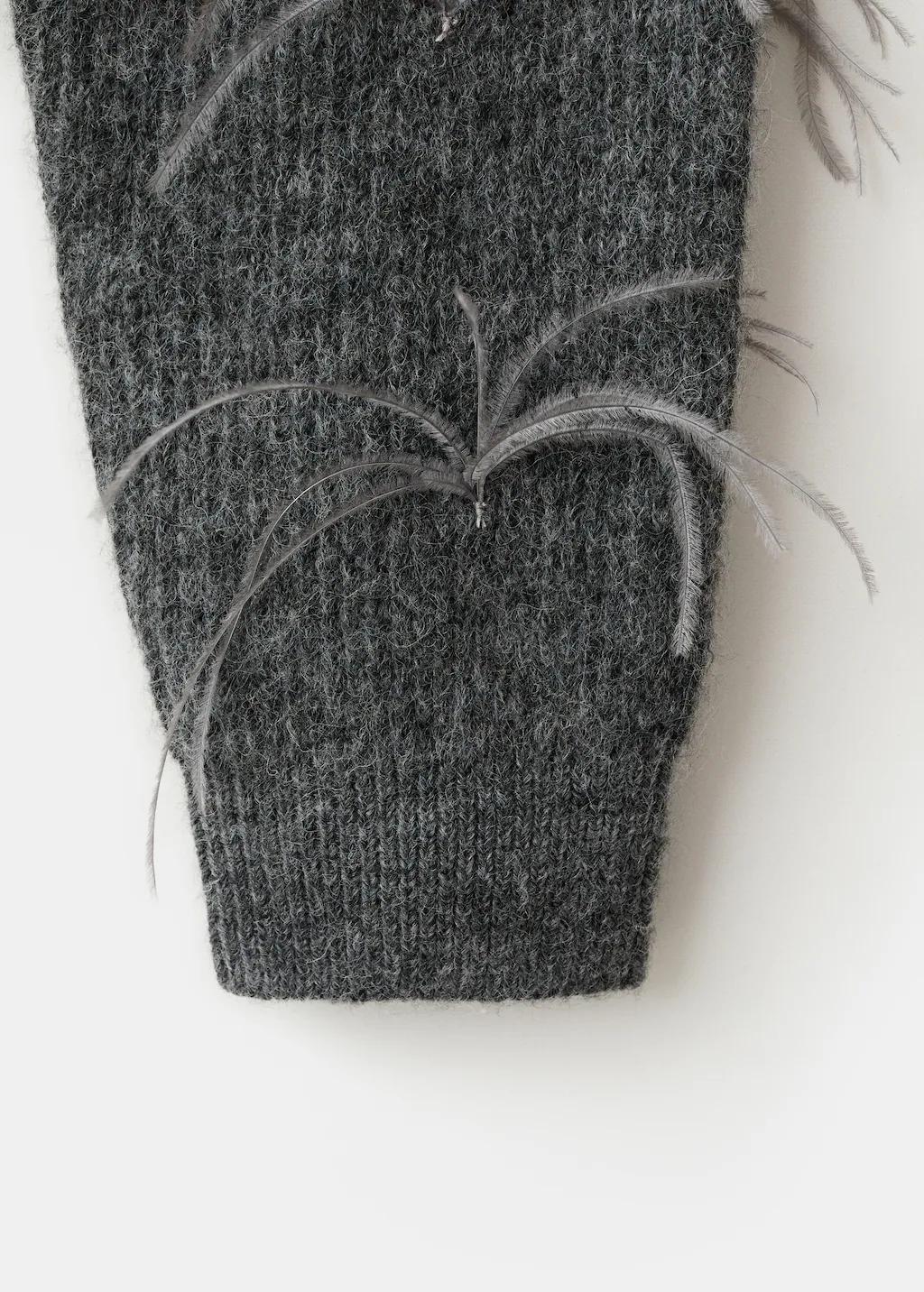 Confeccionado en tejido de punto medio, este diseño recto presenta cuello caja y manga larga, adornado con plumas de avestruz
