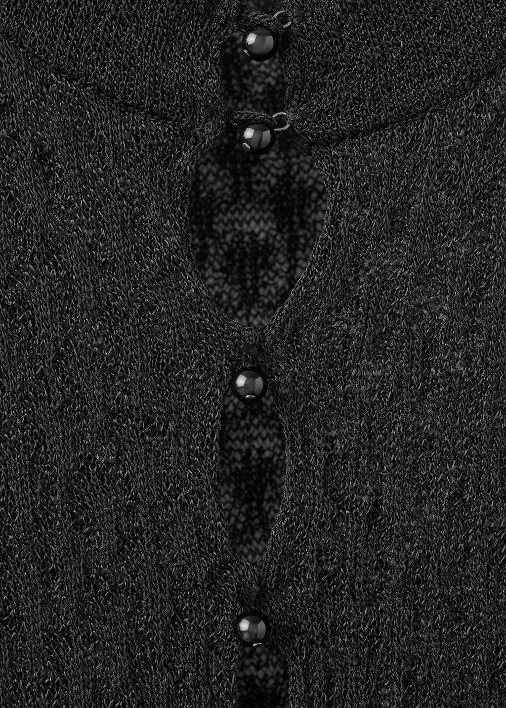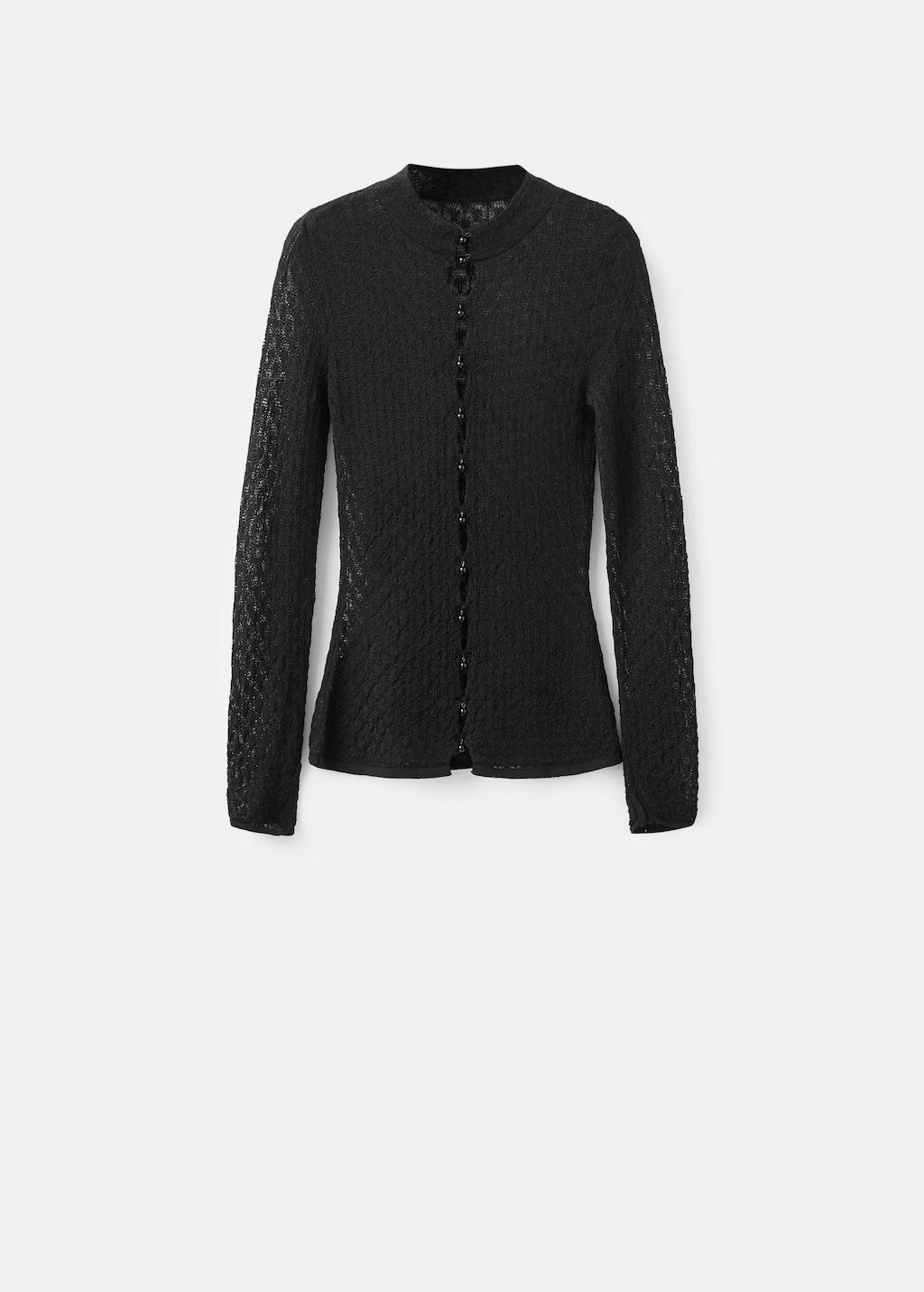 Tejido de punto fino. Tejido de punto calado. Cuello perkins. Manga larga. Diseño entallado. Cierre delantero con abalorios. Colección Selection. Esta prenda pertenece a nuestra colección de fiesta y evento, diseñada para elevar tus looks en ocasiones especiales. Una selección de prendas refinadas, confeccionadas con tejidos de calidad para construir un armario femenino y contemporáneo
