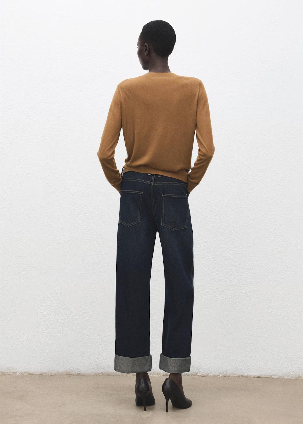 Confeccionado en tejido de punto fino, este diseño recto presenta un cuello de pico y manga larga