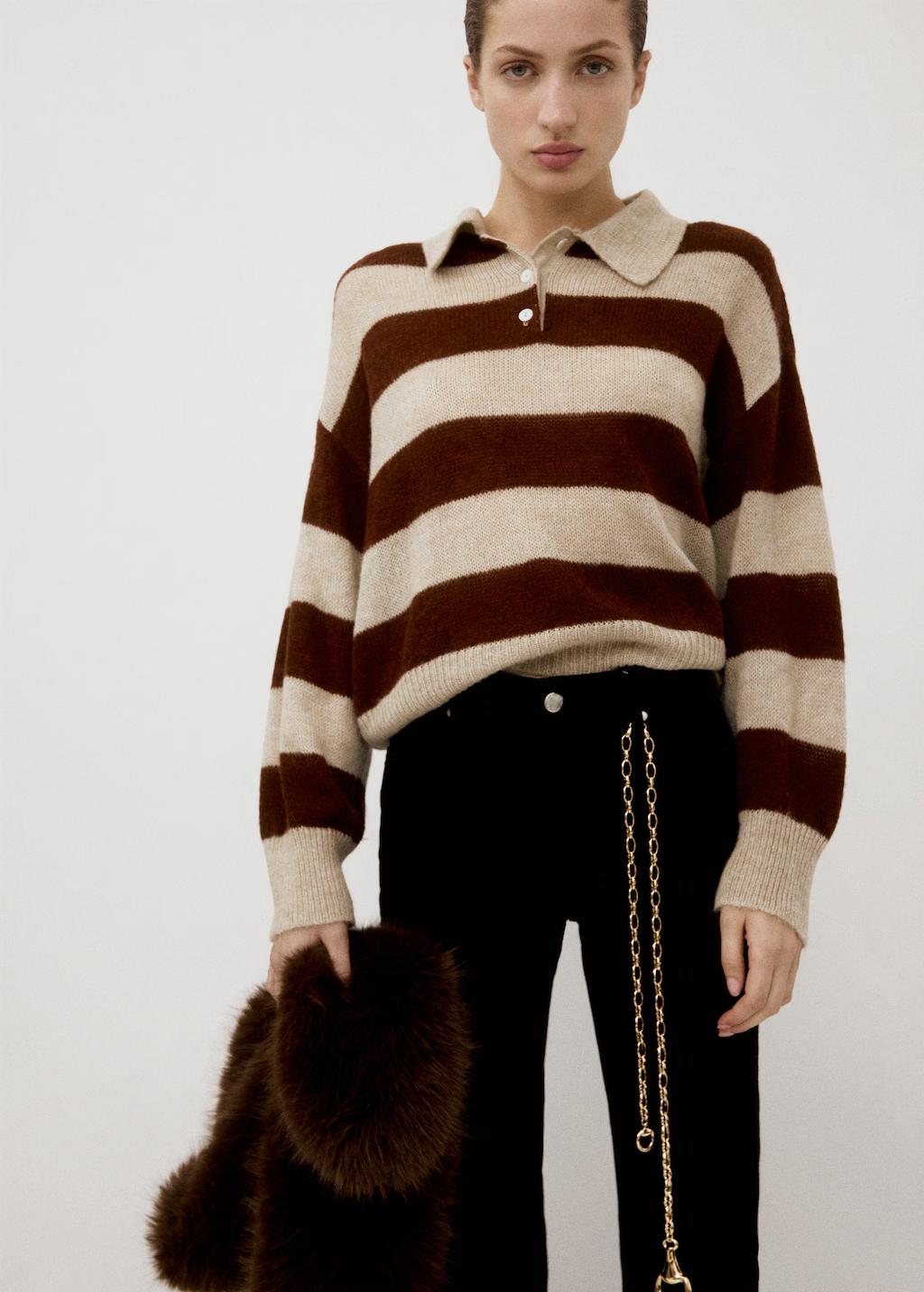 Tejido de punto medio. Tejido mezcla de alpaca. Diseño de rayas. Diseño oversize. Cuello polo. Manga larga. Cierre de botones en el cuello