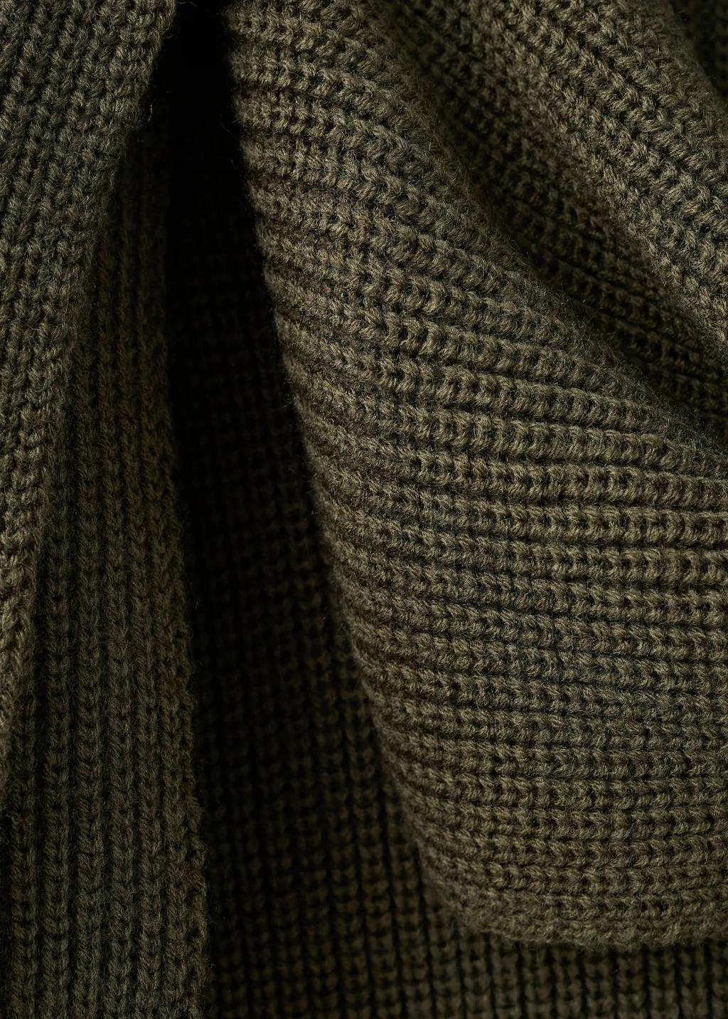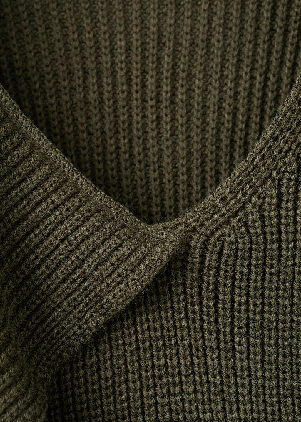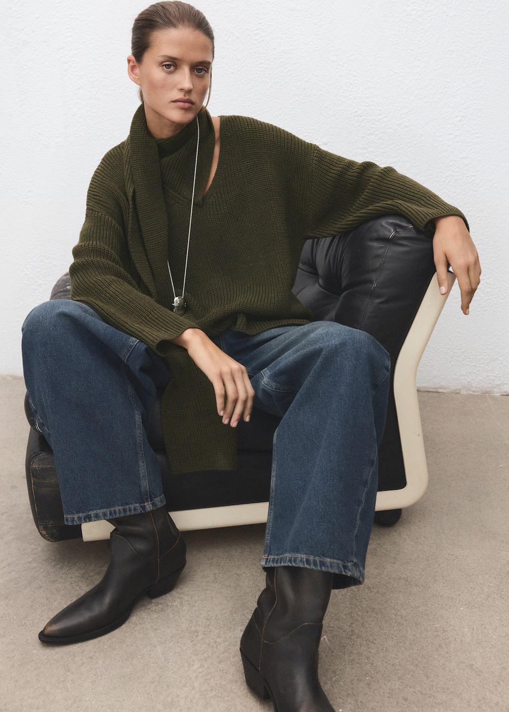 Confeccionado en tejido de punto, este diseño recto presenta un cuello pico adornado con fular. La manga larga completa el estilo