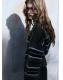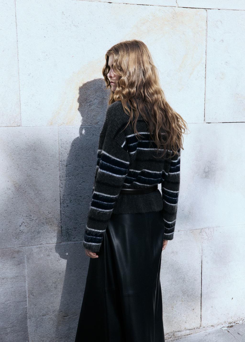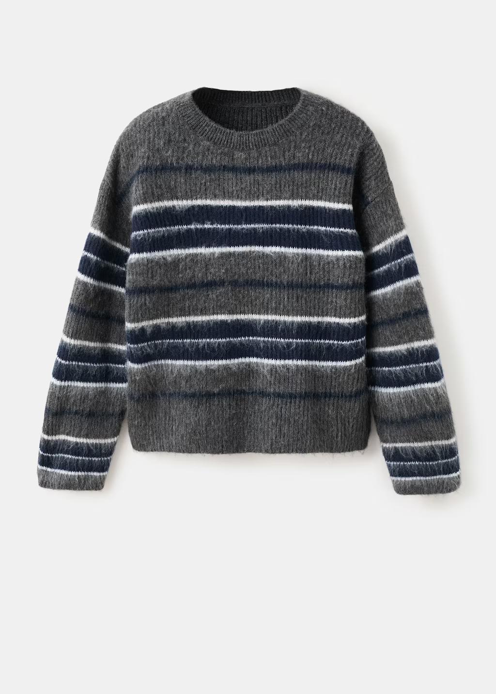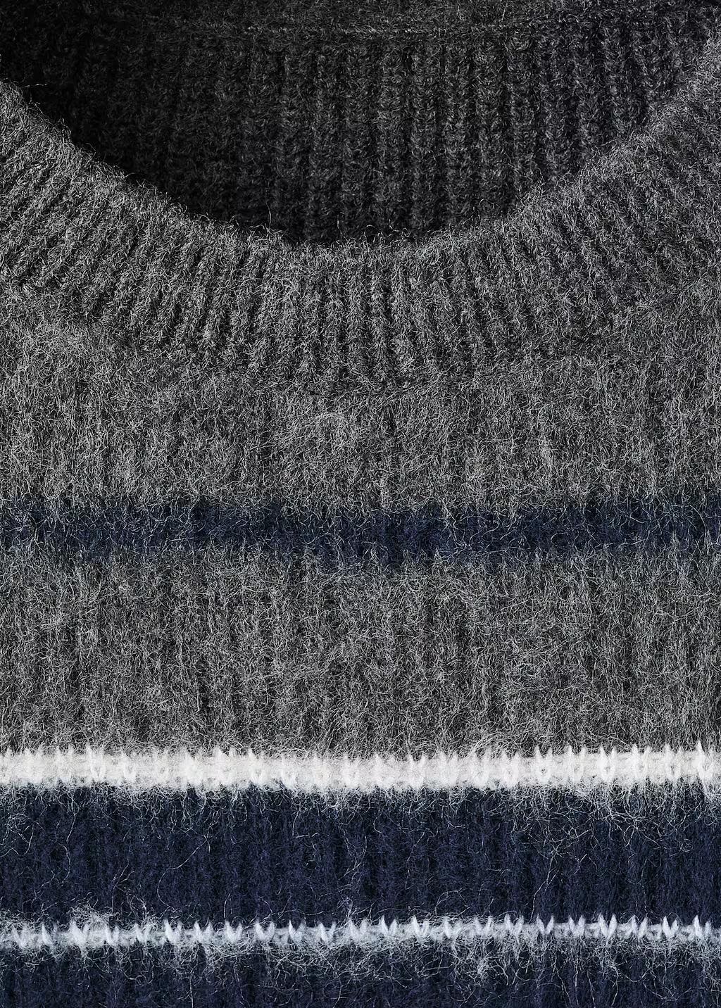 Confeccionado en tejido de punto medio con patrón de rayas, este diseño presenta cuello caja y manga larga