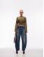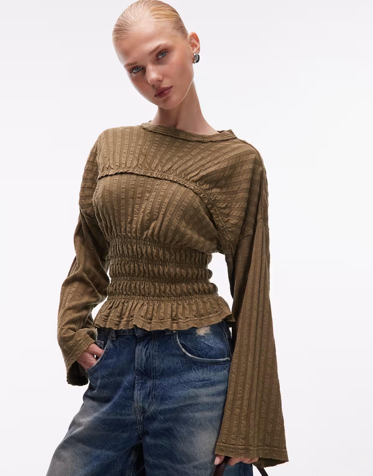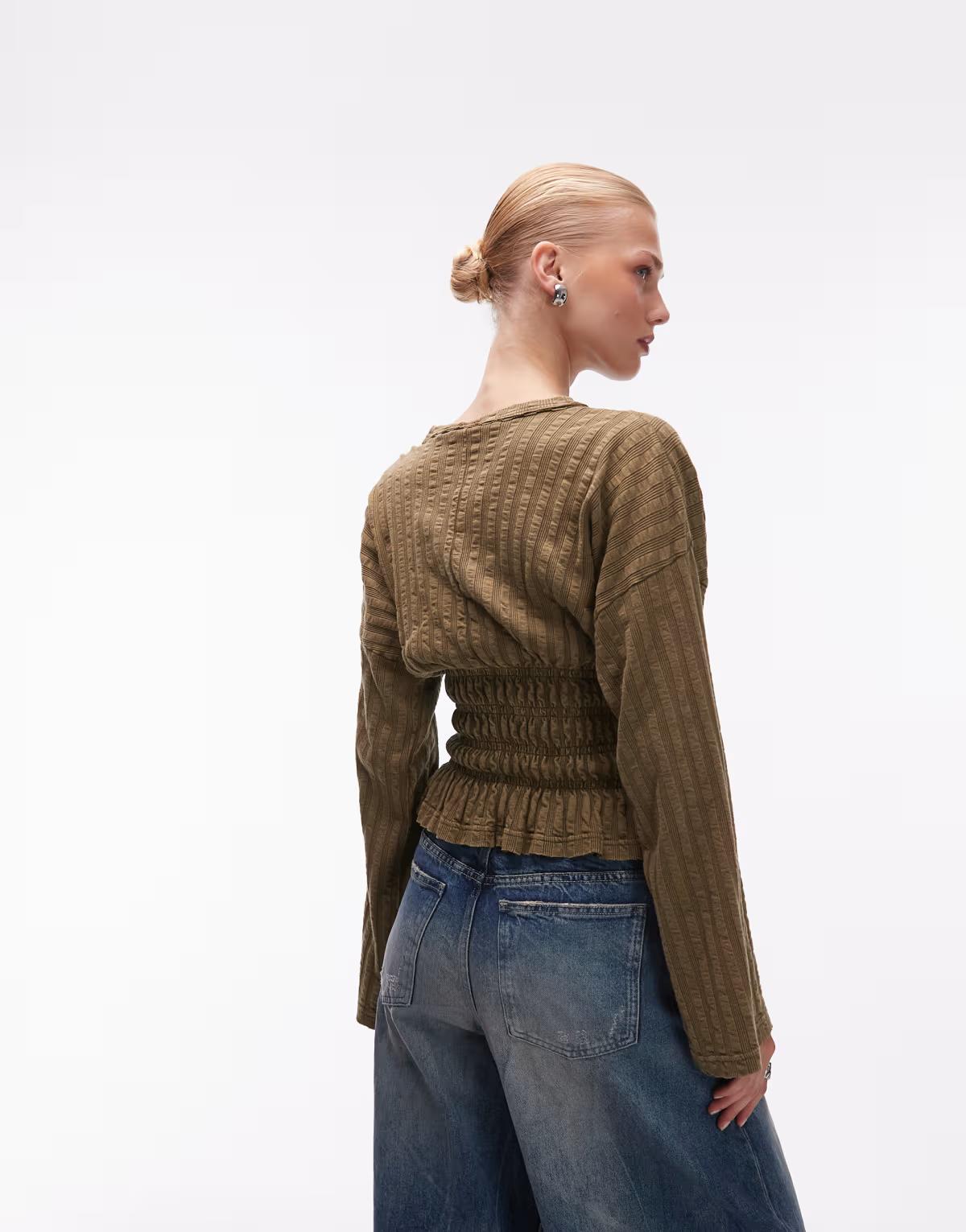 ASOS DESIGN textured rib shirred waist long sleeve tee in khaki