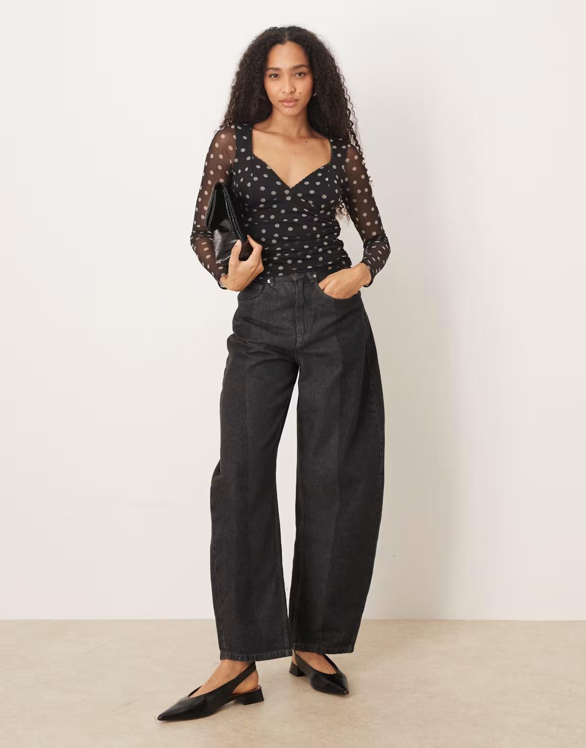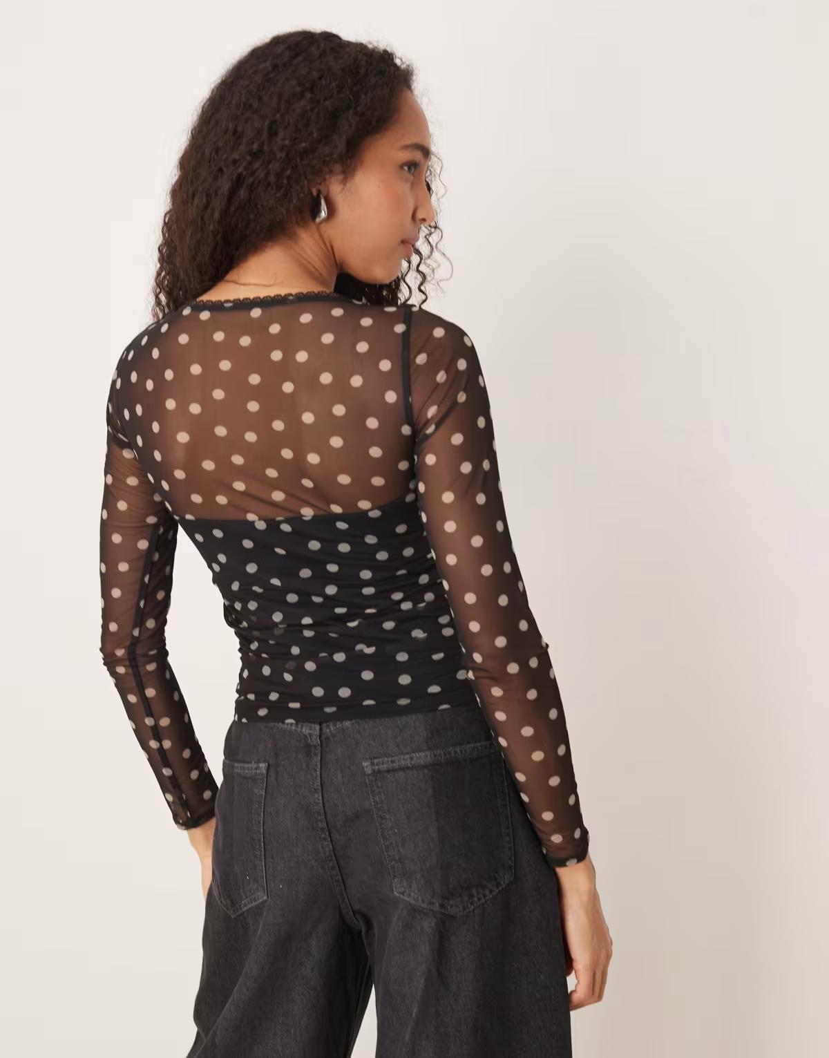Abercrombie & Fitch sweetheart neckline long sleeve top in black polka dot
