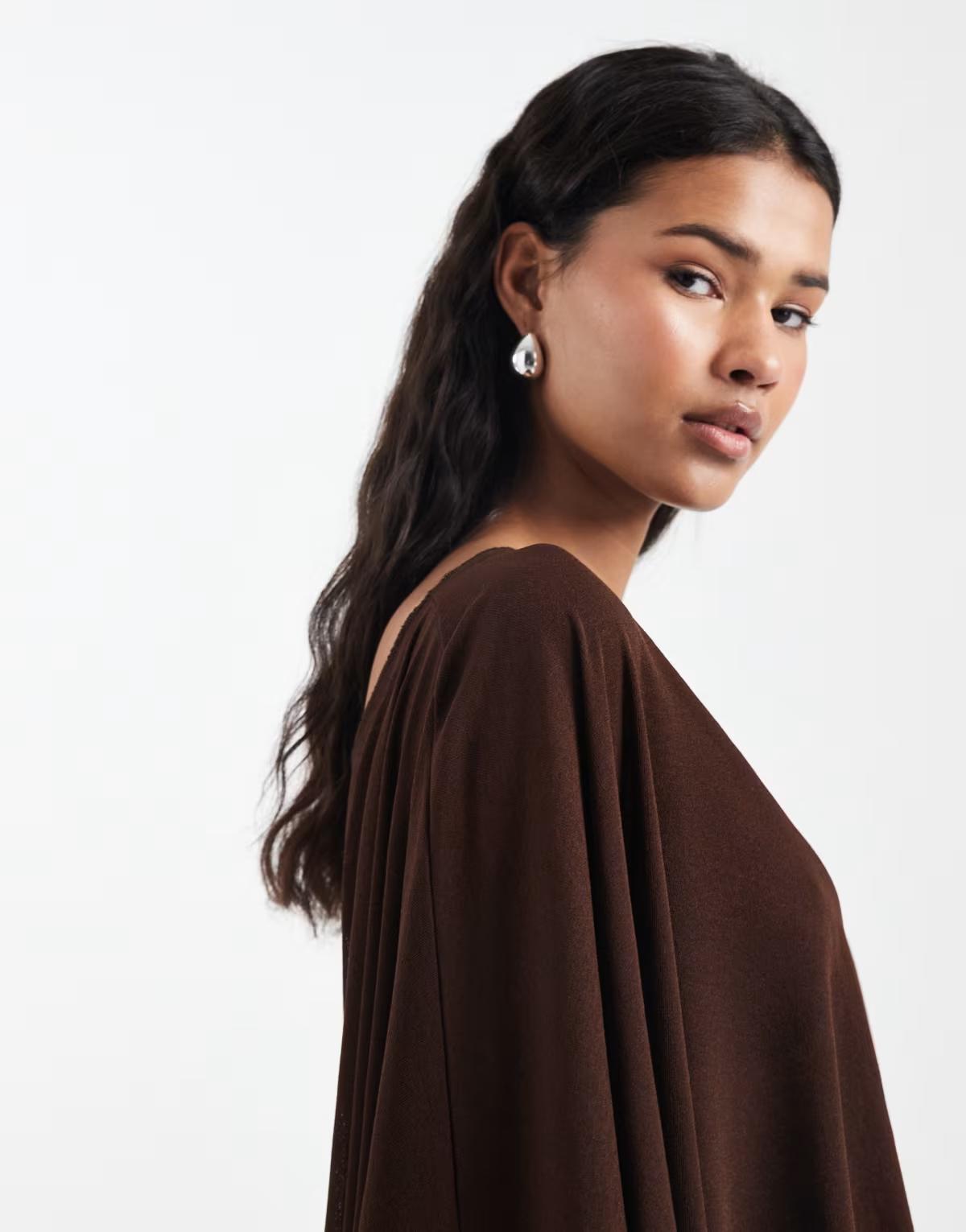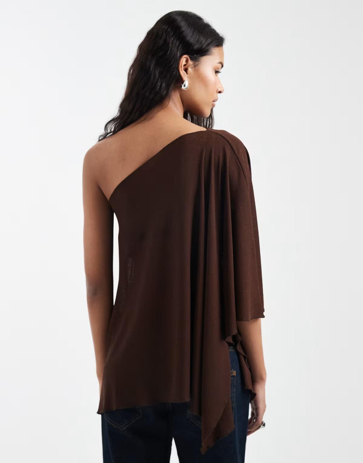 ASOS DESIGN sheer off shoulder asymmetric cape in chocolate