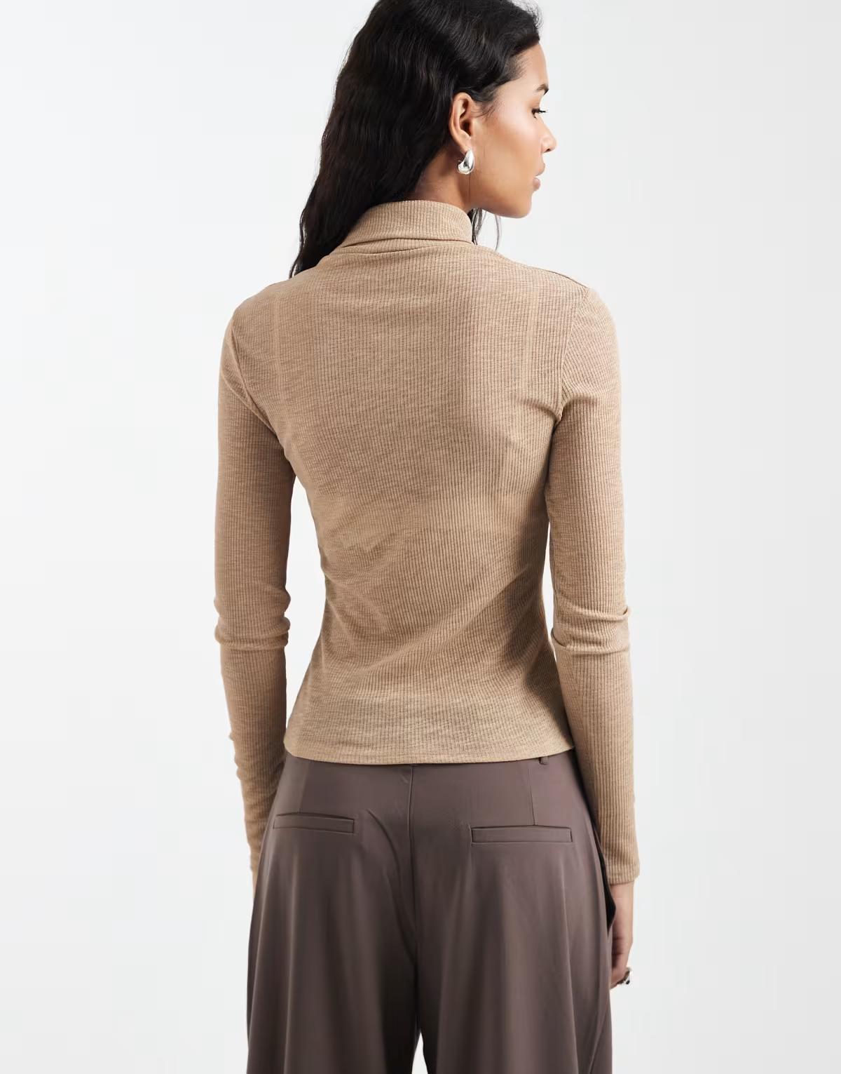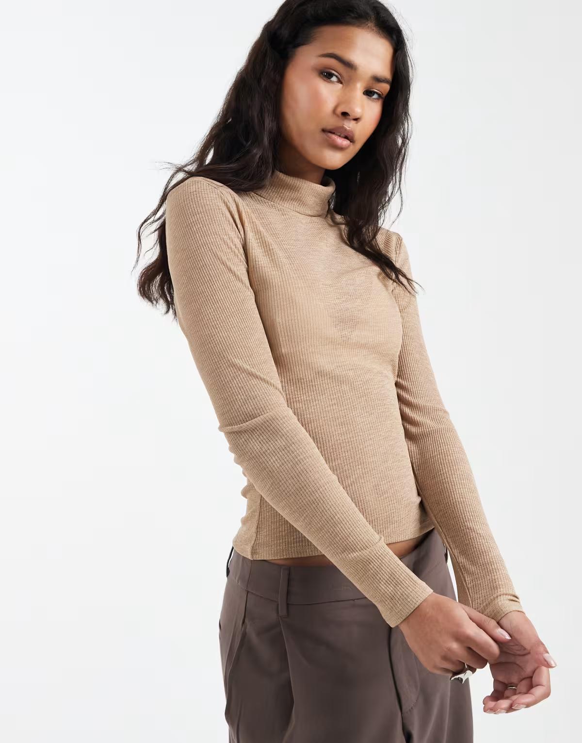 ASOS DESIGN sheer double layer long sleeve funnel neck top in beige