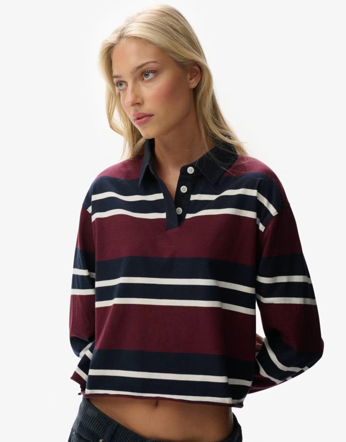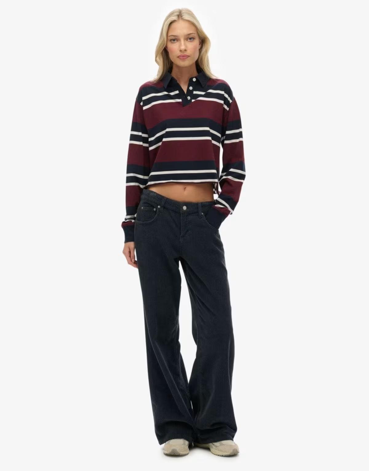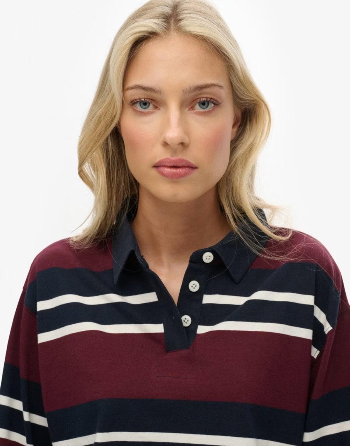 Superdry Athletic essentials cropped stripe rugby top in port red/ecru stripe