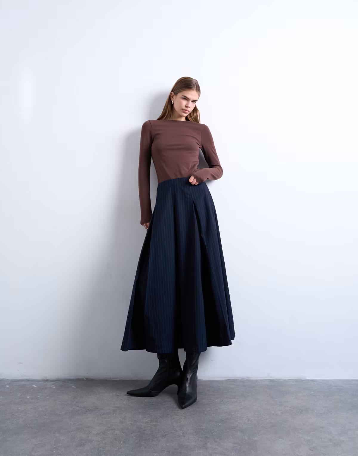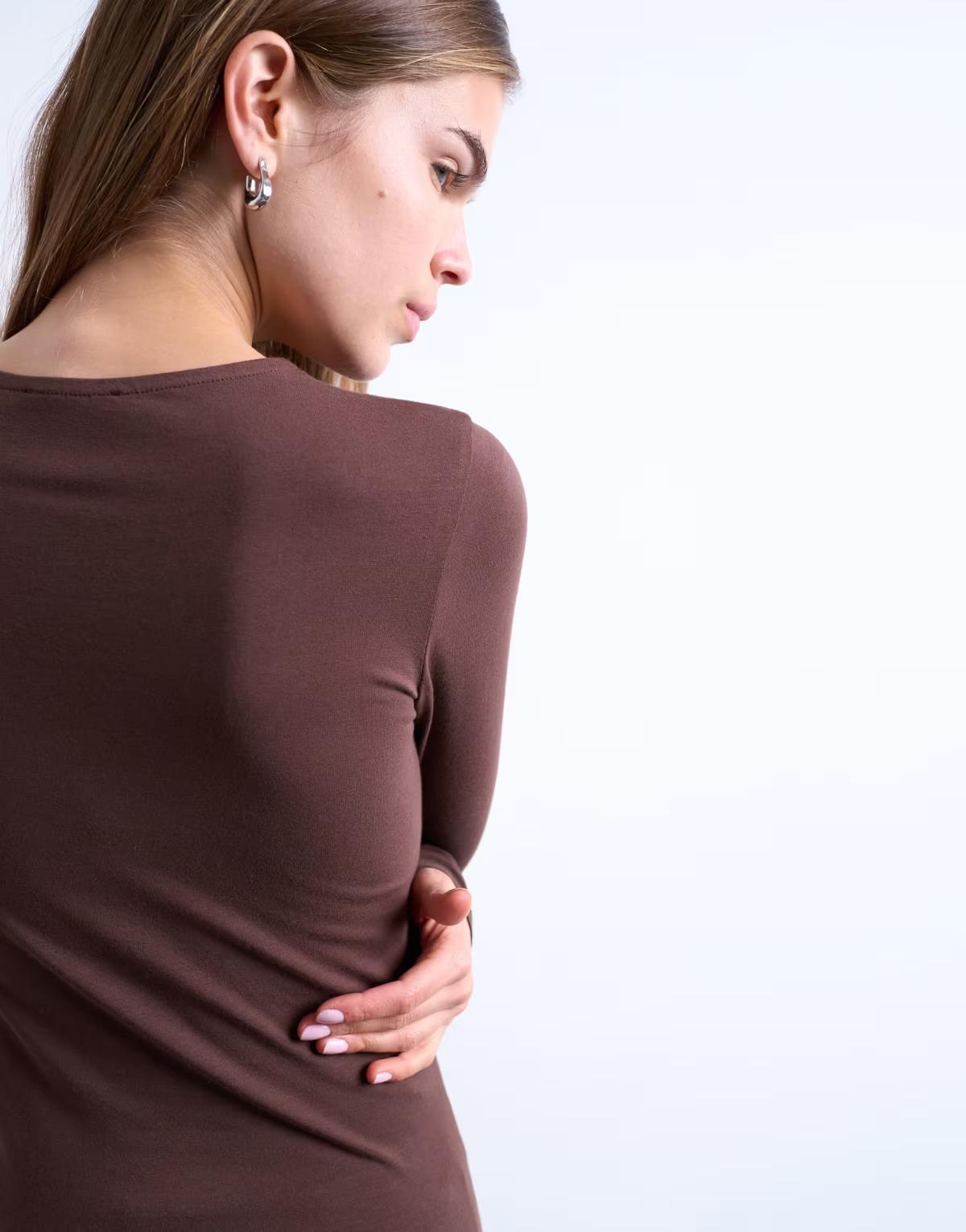 This top is crafted from soft, stretchy jersey in a chocolate-brown shade. It features a crew neck, long sleeves and is cut to a slim fit.