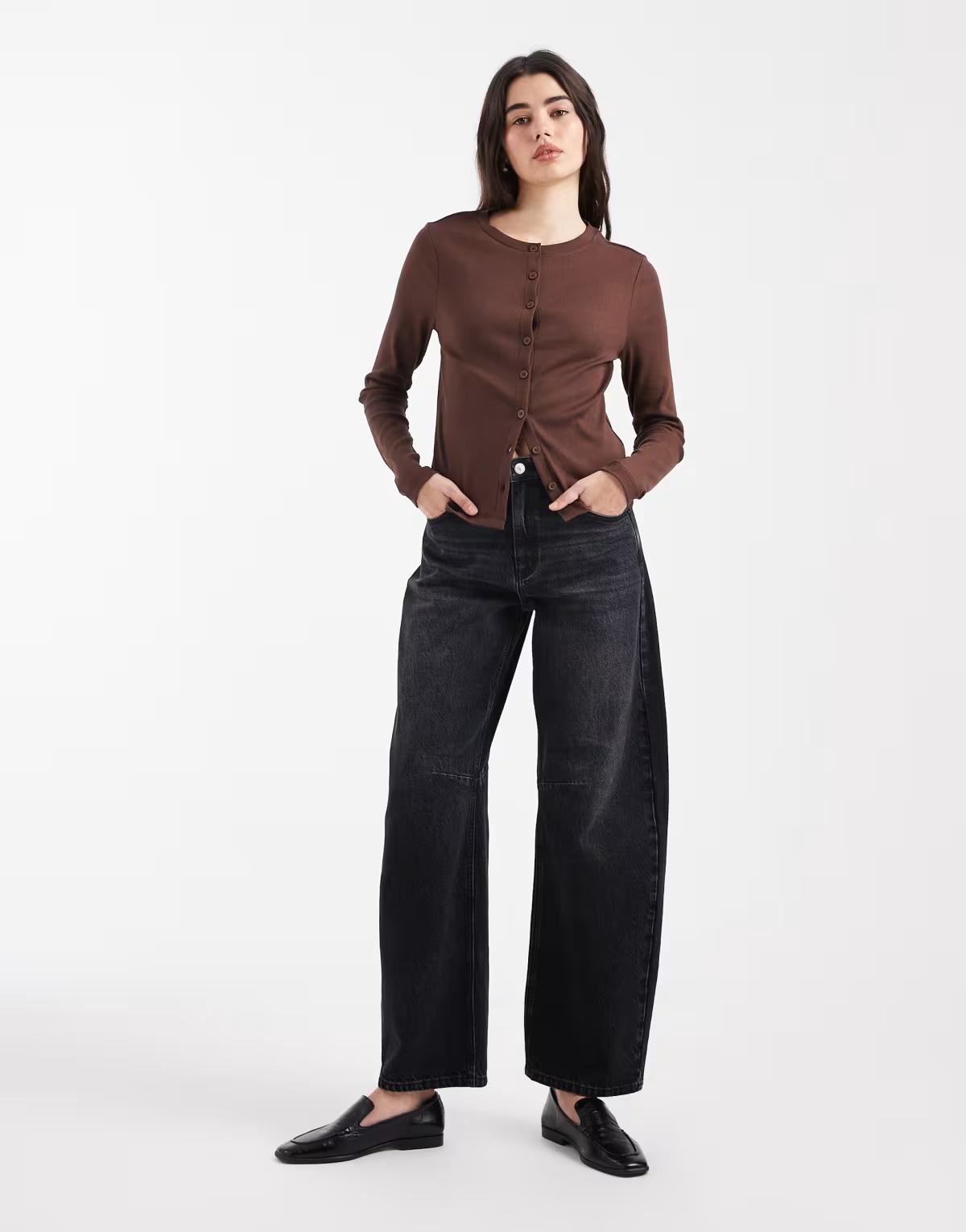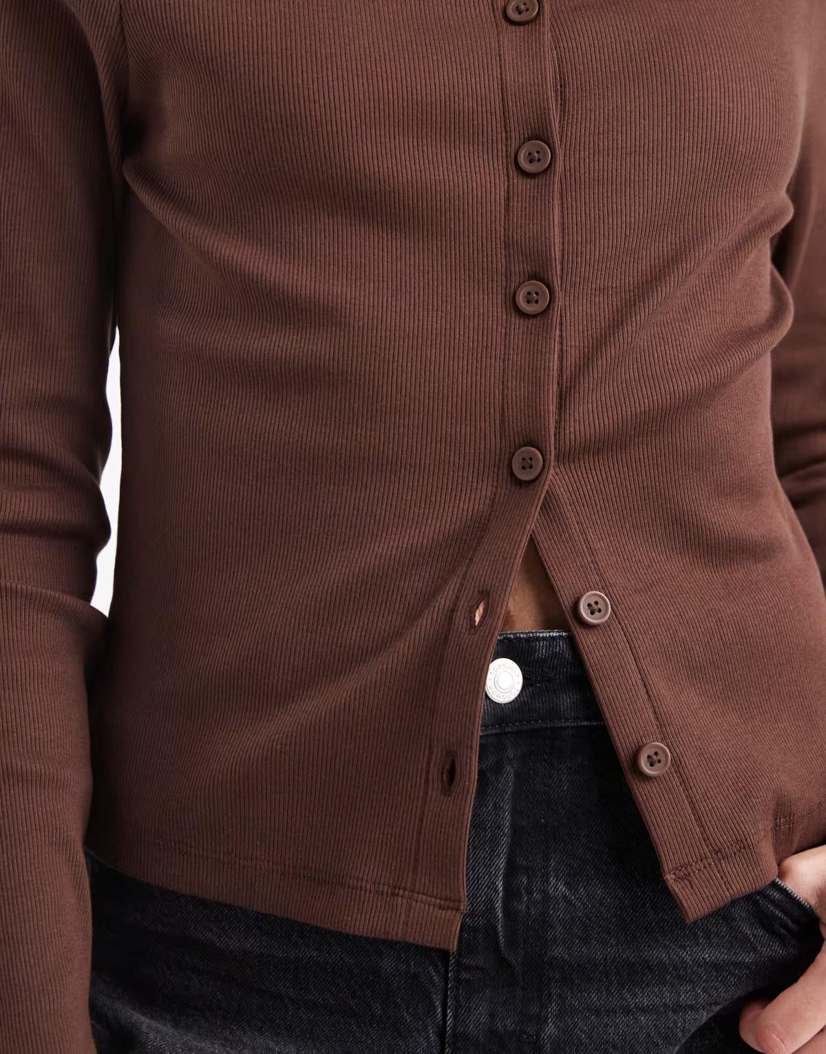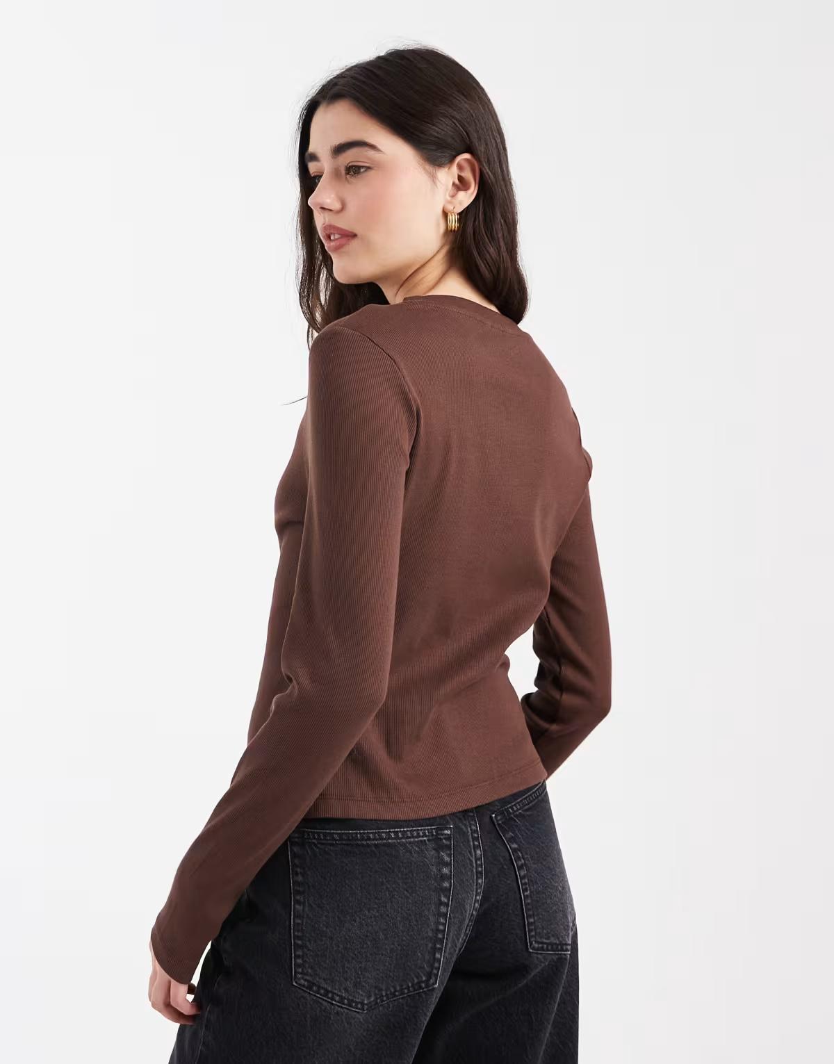 ASOS DESIGN cotton rib crew neck button through top in chocolate