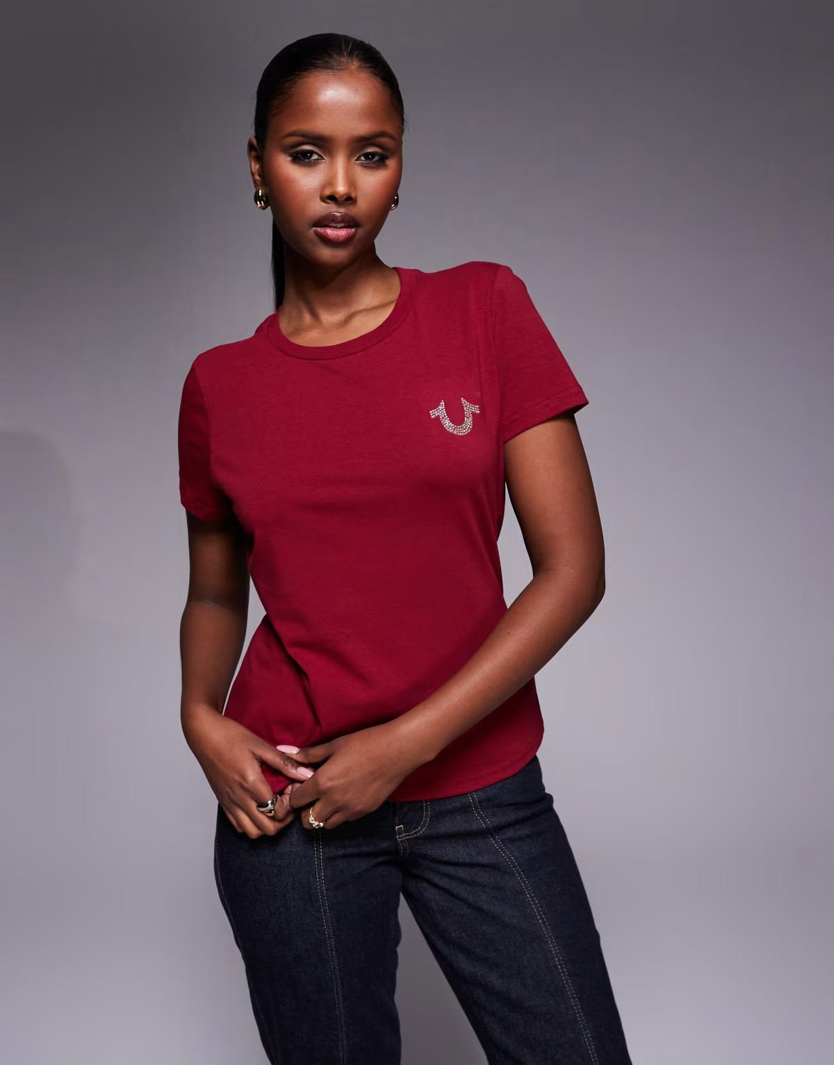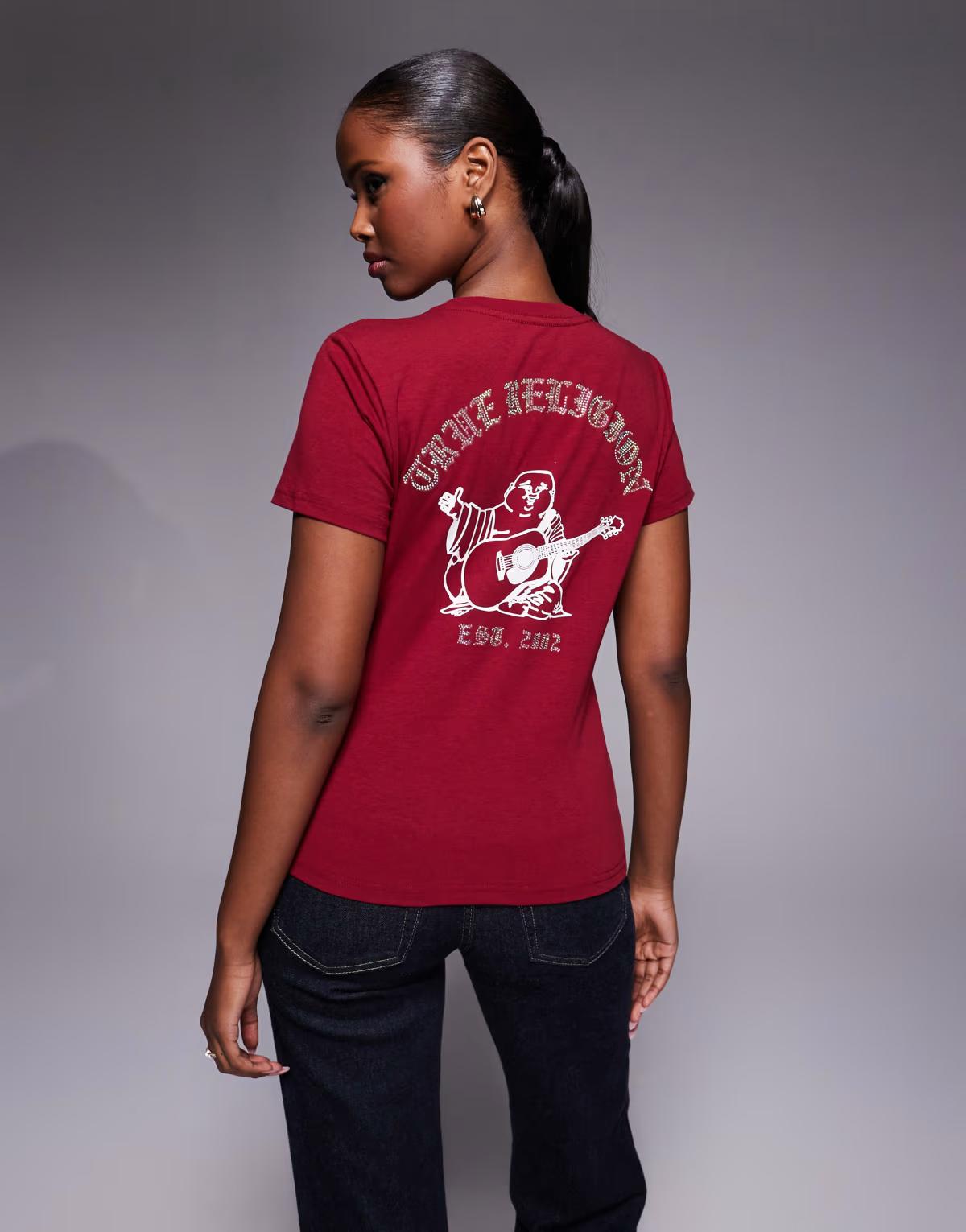 Machine wash according to instructions on care labelMain: 57% Cotton, 38% Polyester, 5% Elastane.Founded in 2002 by textile entrepreneur Jeffrey Lubell, True Religion was created to redefine premium denim with a vintage-inspired, 1970s bohemian-chic aesthetic - reflected in its guitar-playing Buddha logo. The brand takes pride in exceptional craftsmanship and attention to detail: from perfectly fitting jeans and statement T-shirts to iconic contrast stitching and distinctive washes, every piece delivers an elevated finish. Discover our True Religion edit at ASOS and explore denim and more with a unique edge.